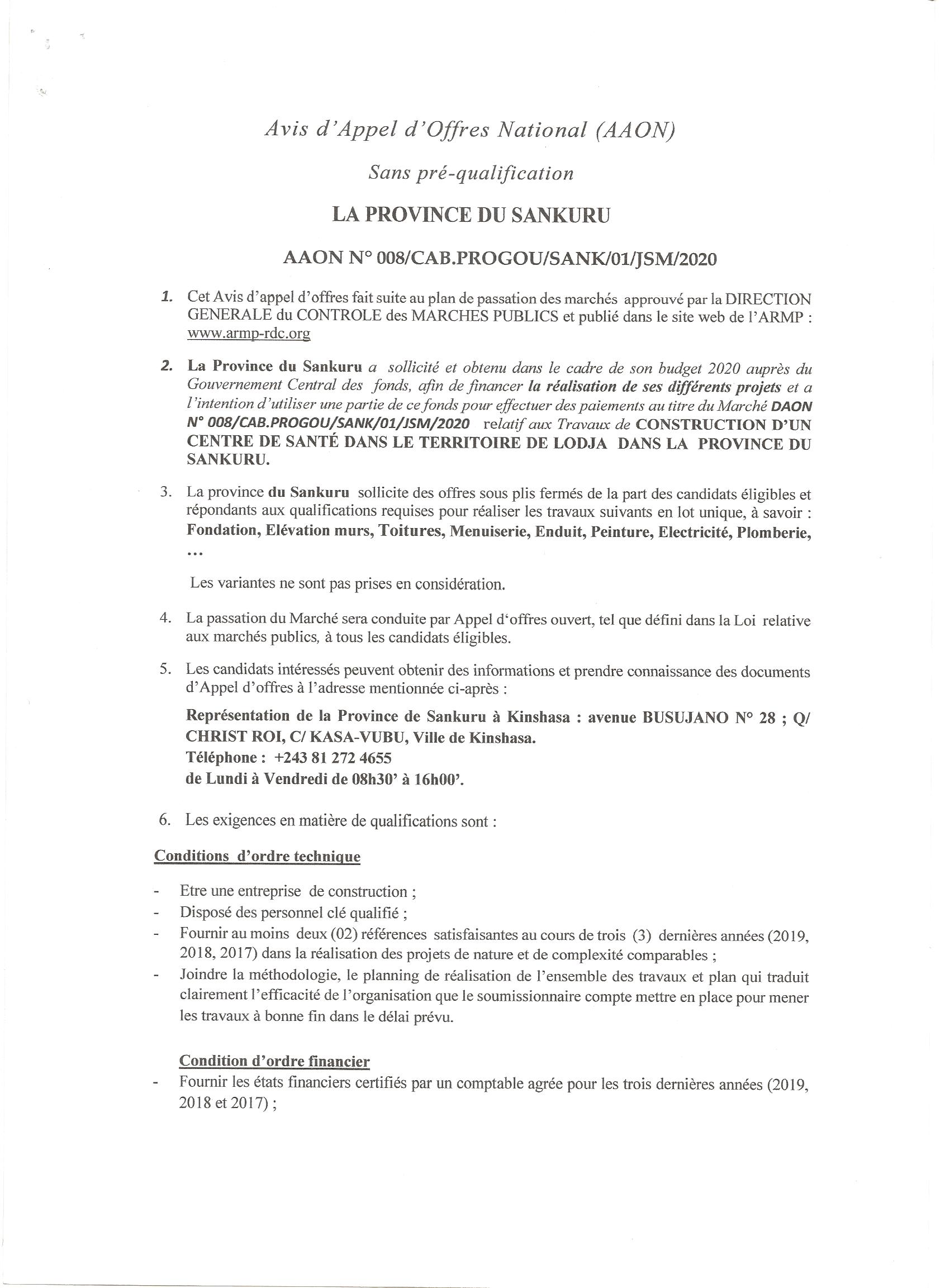 AVIS D’APPEL D’OFFRES SANS PRÉ-QUALIFICATION DU MARCHÉ RELATIF AUX TRAVAUX DE CONSTRUCTION D’UN CENTRE DE SANTÉ DANS LE TERRITOIRE DE LODJA DANS LA PROVINCE DU SANKURU.