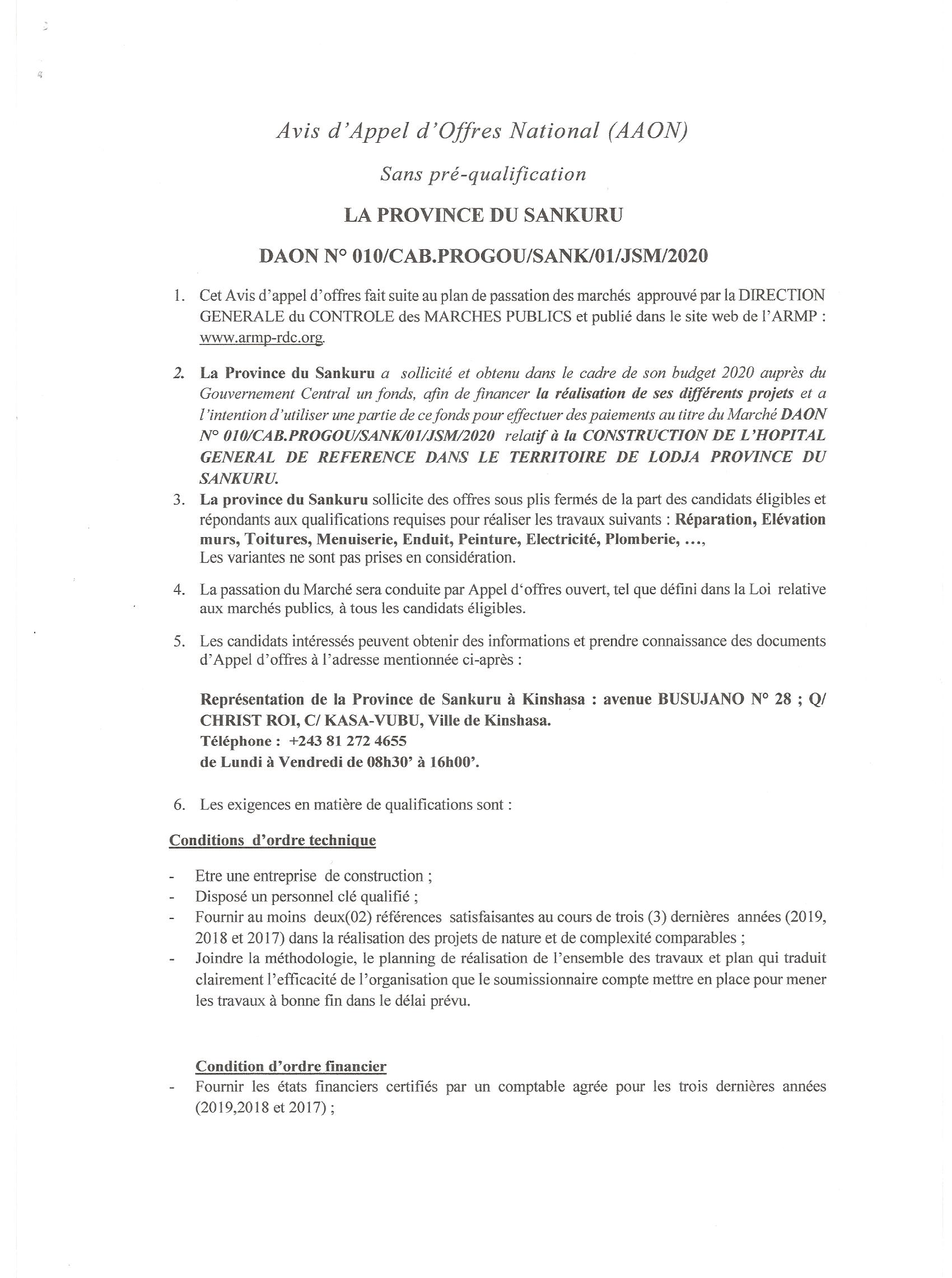 AVIS D’APPEL D’OFFRE SANS PRÉ-QUALIFICATION DU MARCHÉ RELATIF AUX TRAVAUX DE CONSTRUCTION DE L’HÔPITAL DU GOUVERNEMENT DE LA PROVINCE DU SANKURU.