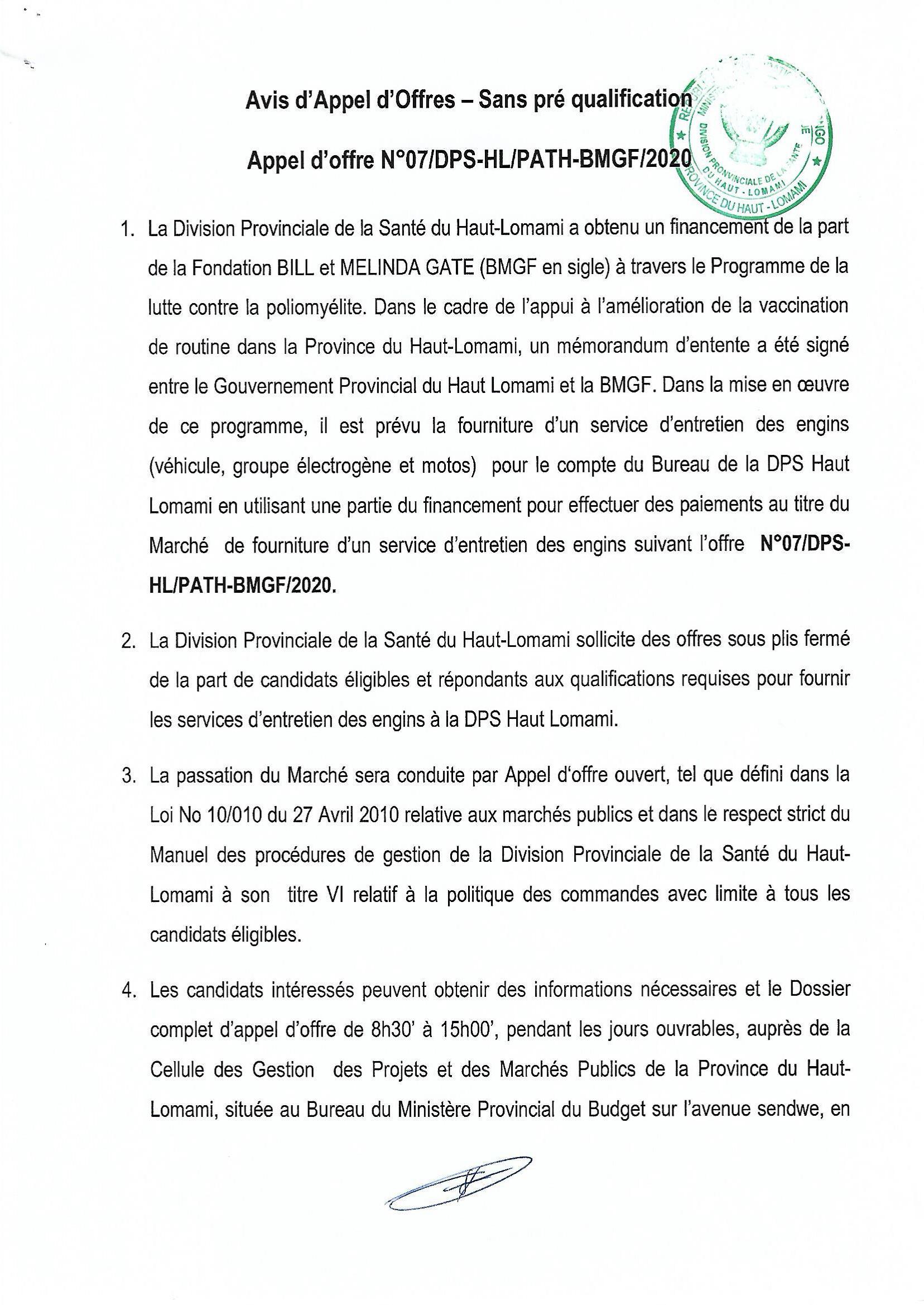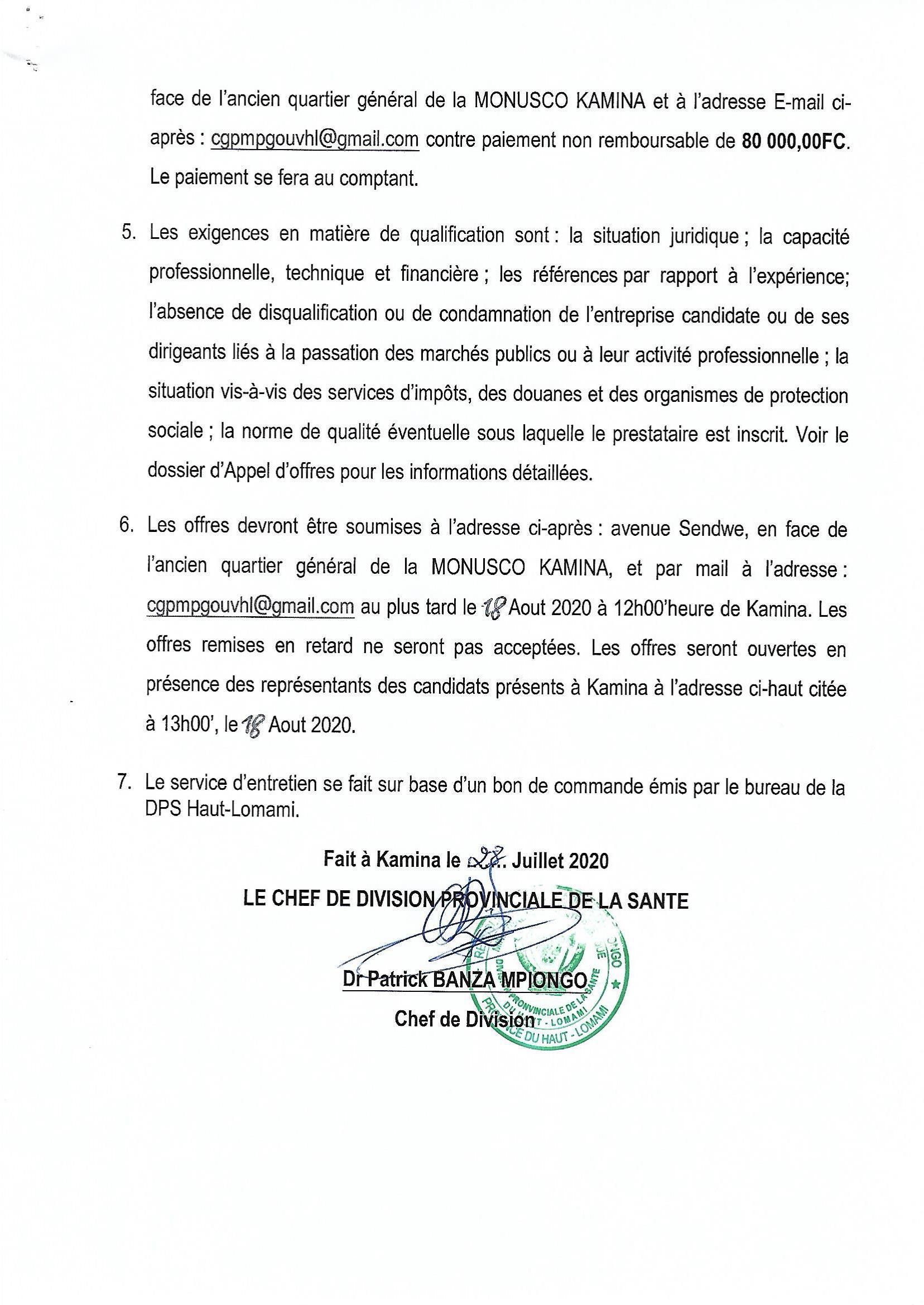 ACQUISITION DES CARBURANTS ET LUBRIFIANTS DES ANTENNES PEV KAMINA ET KABONDO-DIANDA DE LA PROVINCE DE HAUT LOMAMI.