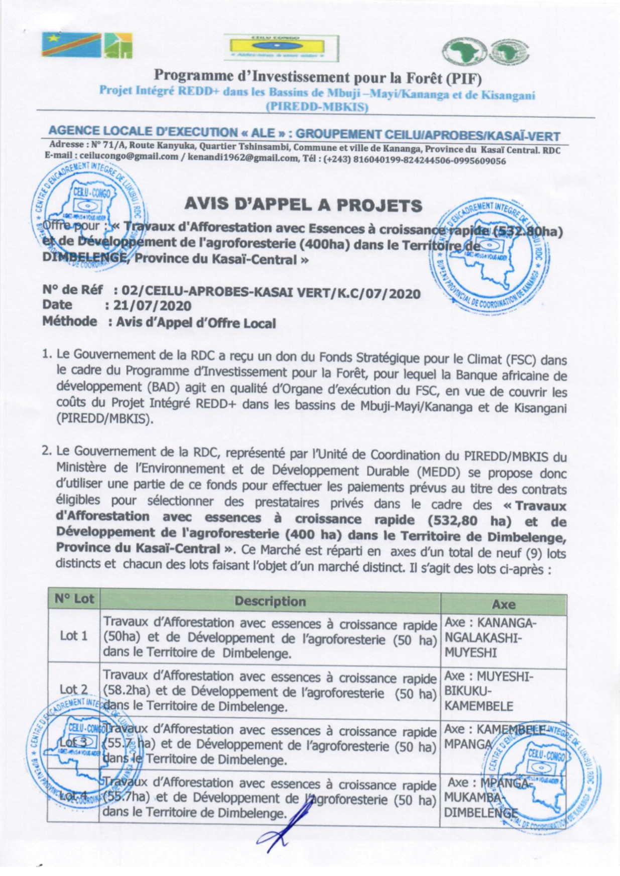 TRAVAUX D’AFFORESTATION AVEC ESSENCES À CROISSANCE RAPIDE ET DE L’AGROFORESTÉRIE DANS LE TERRITOIRE DE DIMBELENGE, PROVINCE DU KASAI-CENTRAL