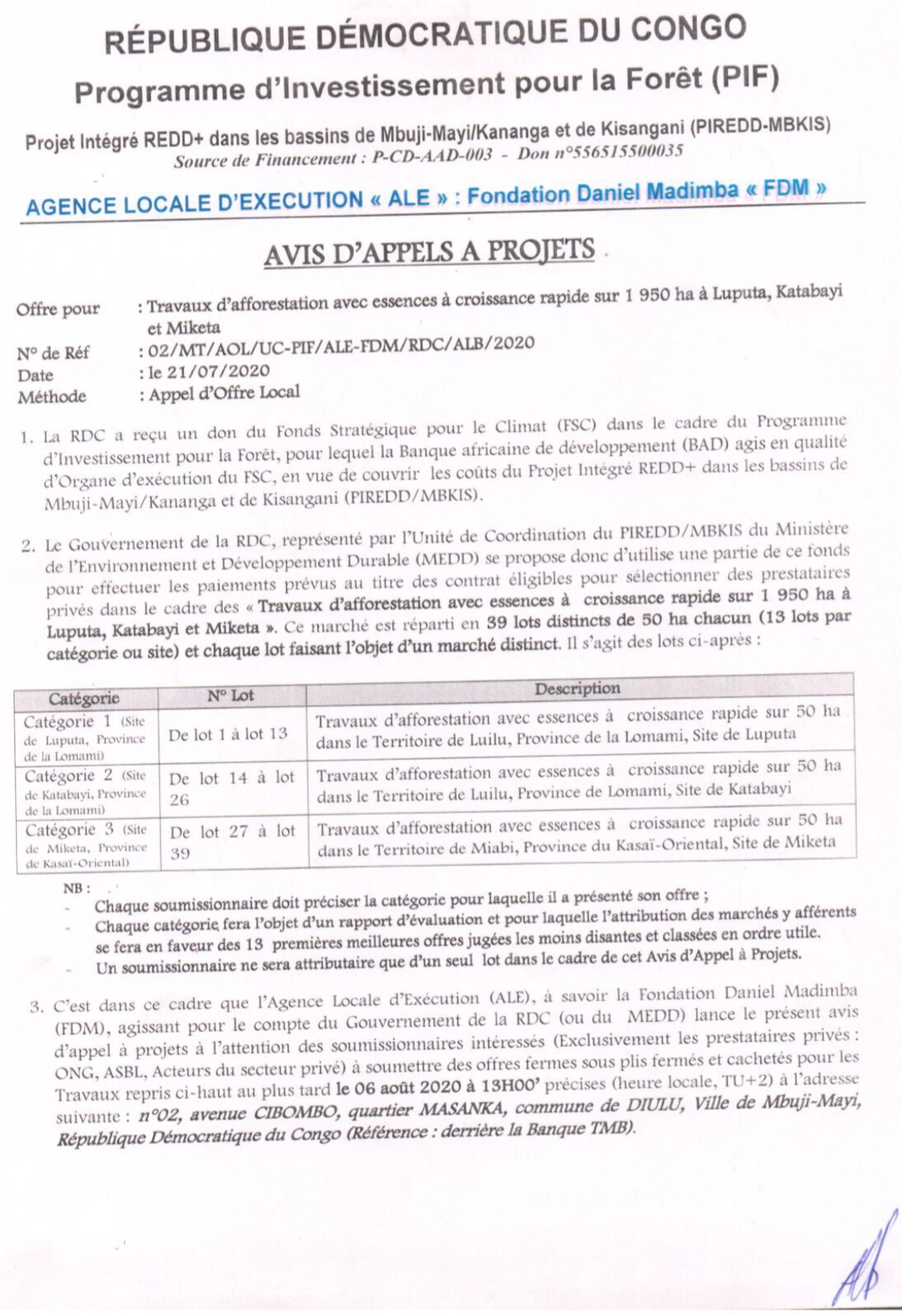TRAVAUX D’AFFORESTATION AVEC ESSENCES A CROISSANCE RAPIDE SUR 1.950 HA A LUPUTA, KATABAYI ET MIKETA