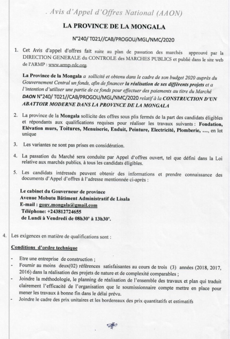 TRAVAUX DE CONSTRUCTION D’UN ABATTOIR MODERNE DANS LA PROVINCE DE LA MONGALA.