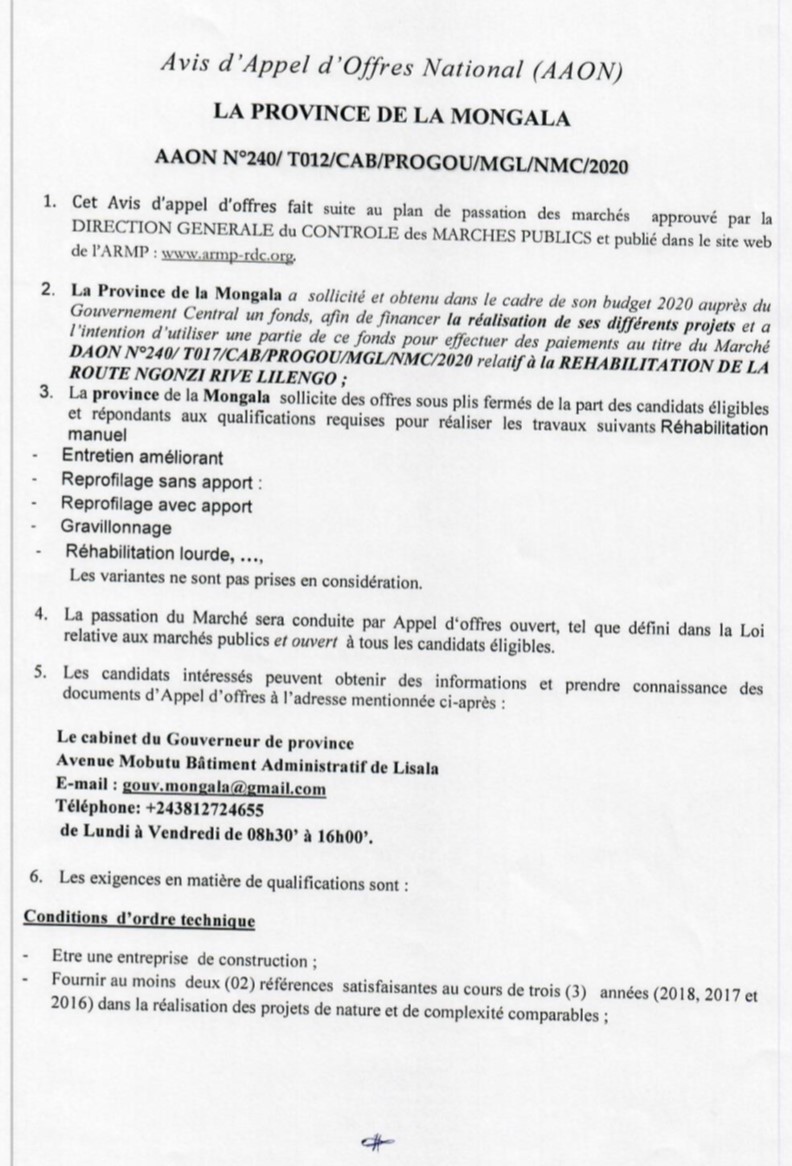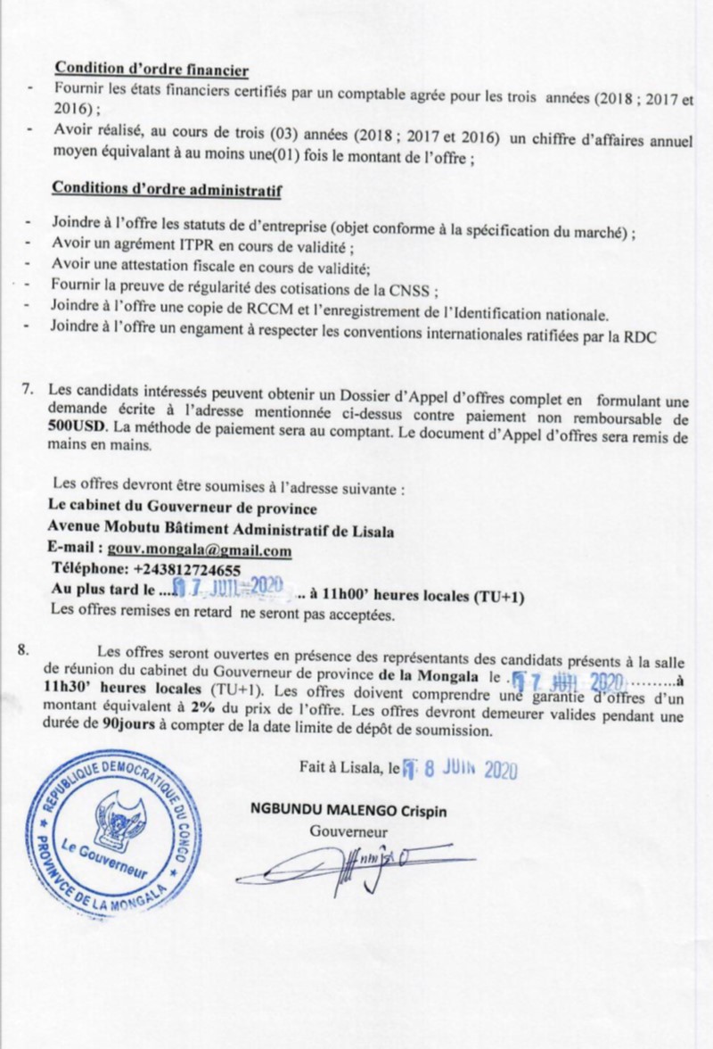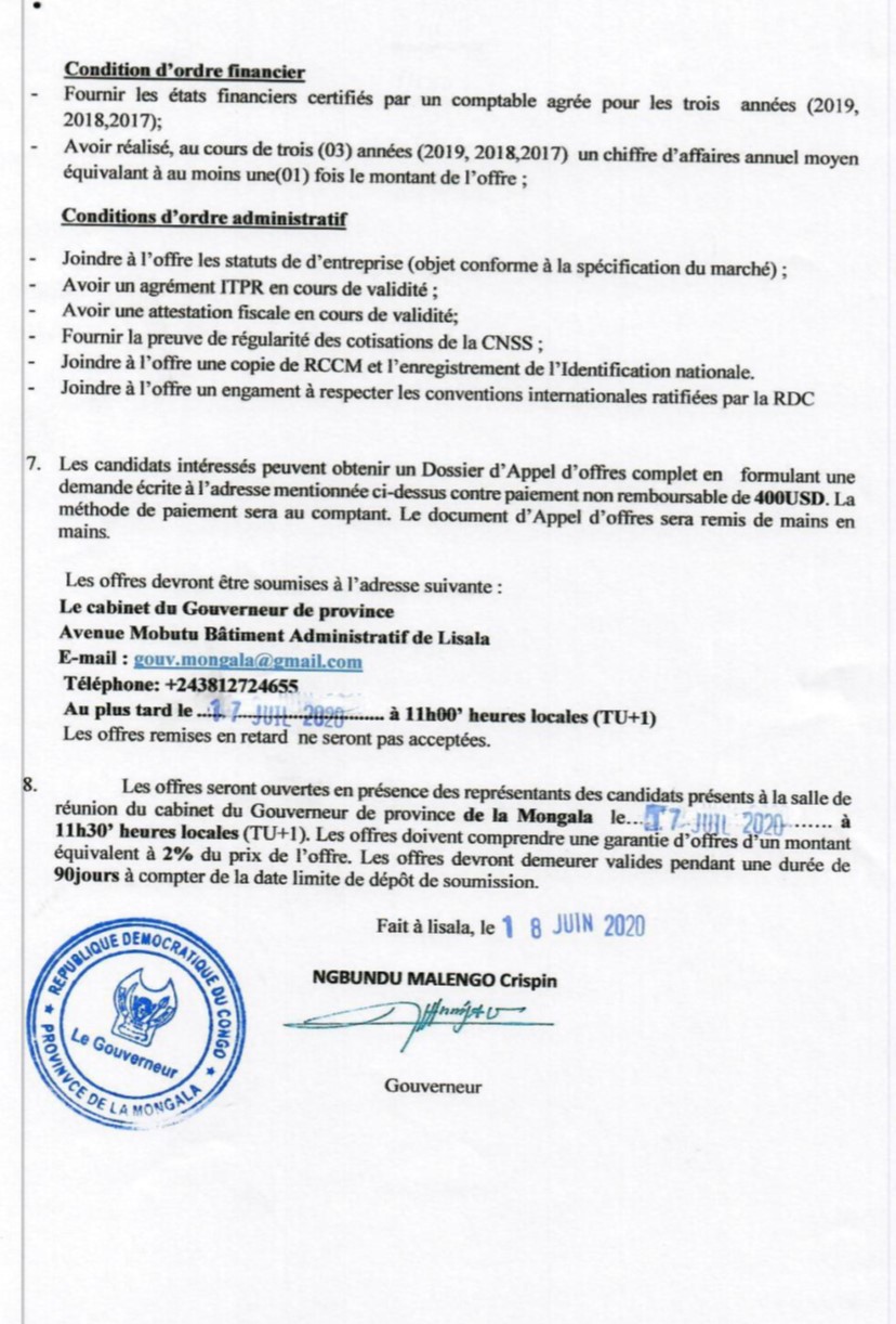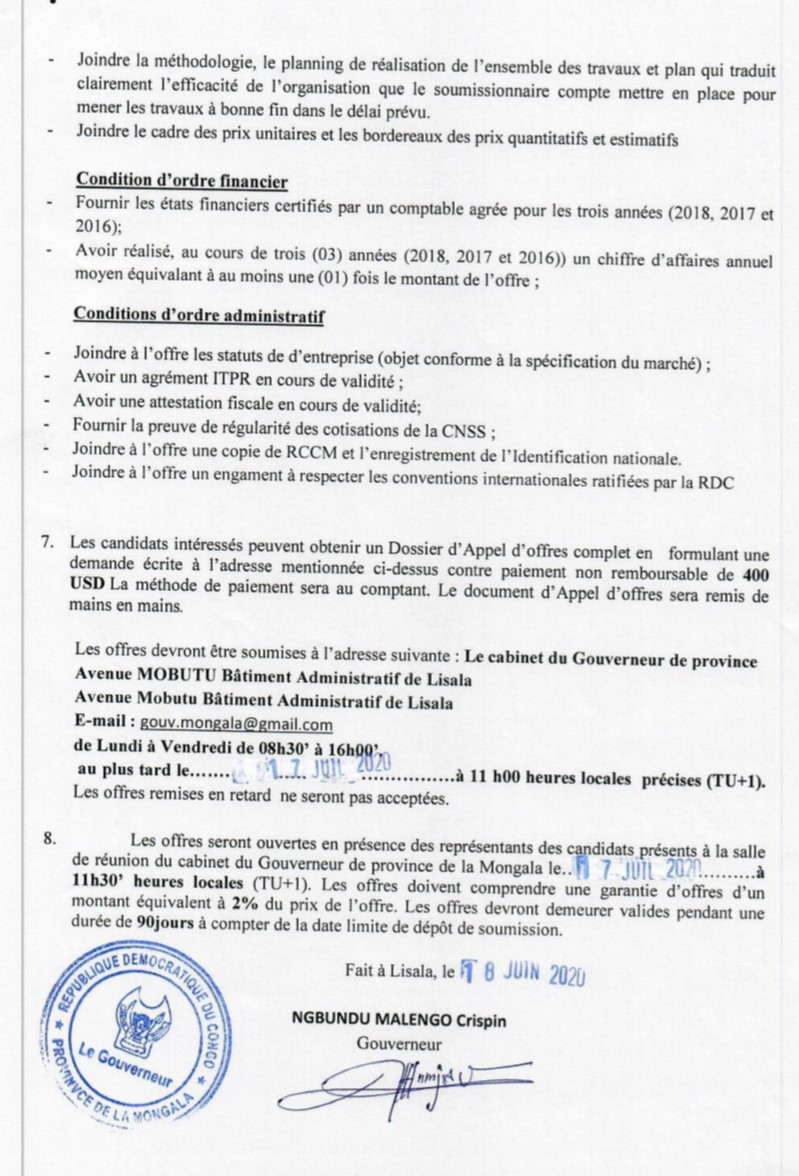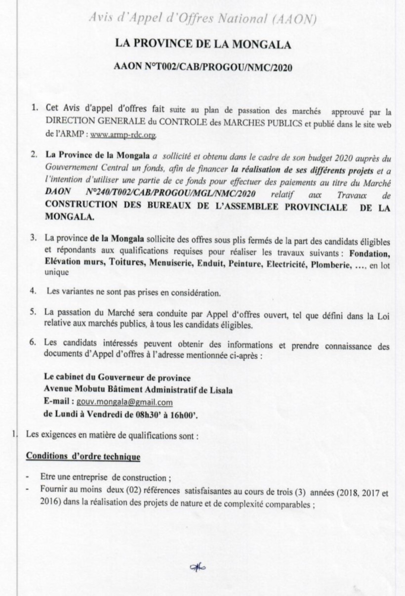 TRAVAUX DE CONSTRUCTION DES BUREAUX DE L’ASSEMBLEE PROVINCIALE DE LA PROVINCE DE LA MONGALA.