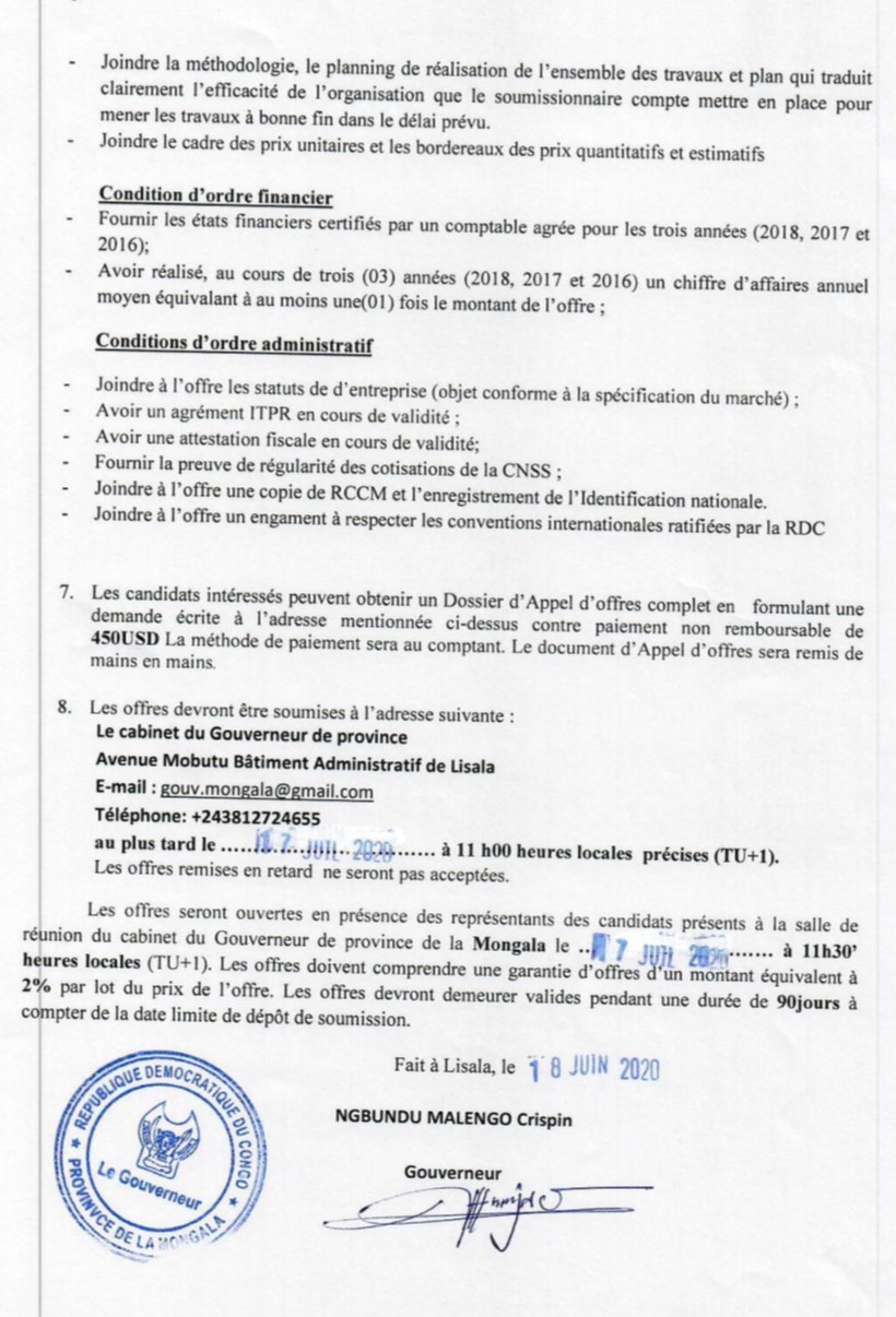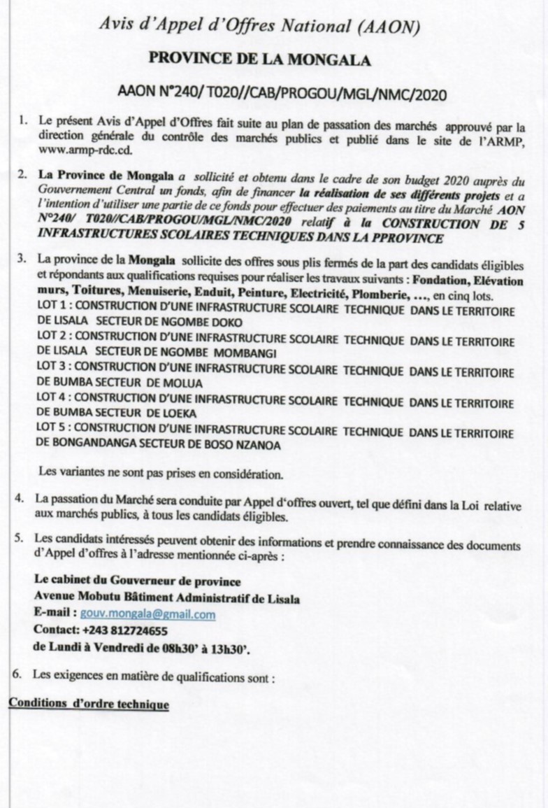 TRAVAUX DE CONSTRUCTION DES BUREAUX POUR LA DIRECTION PROVINCIALE DE LA DGM/PROVINCE DE LA MONGALA.