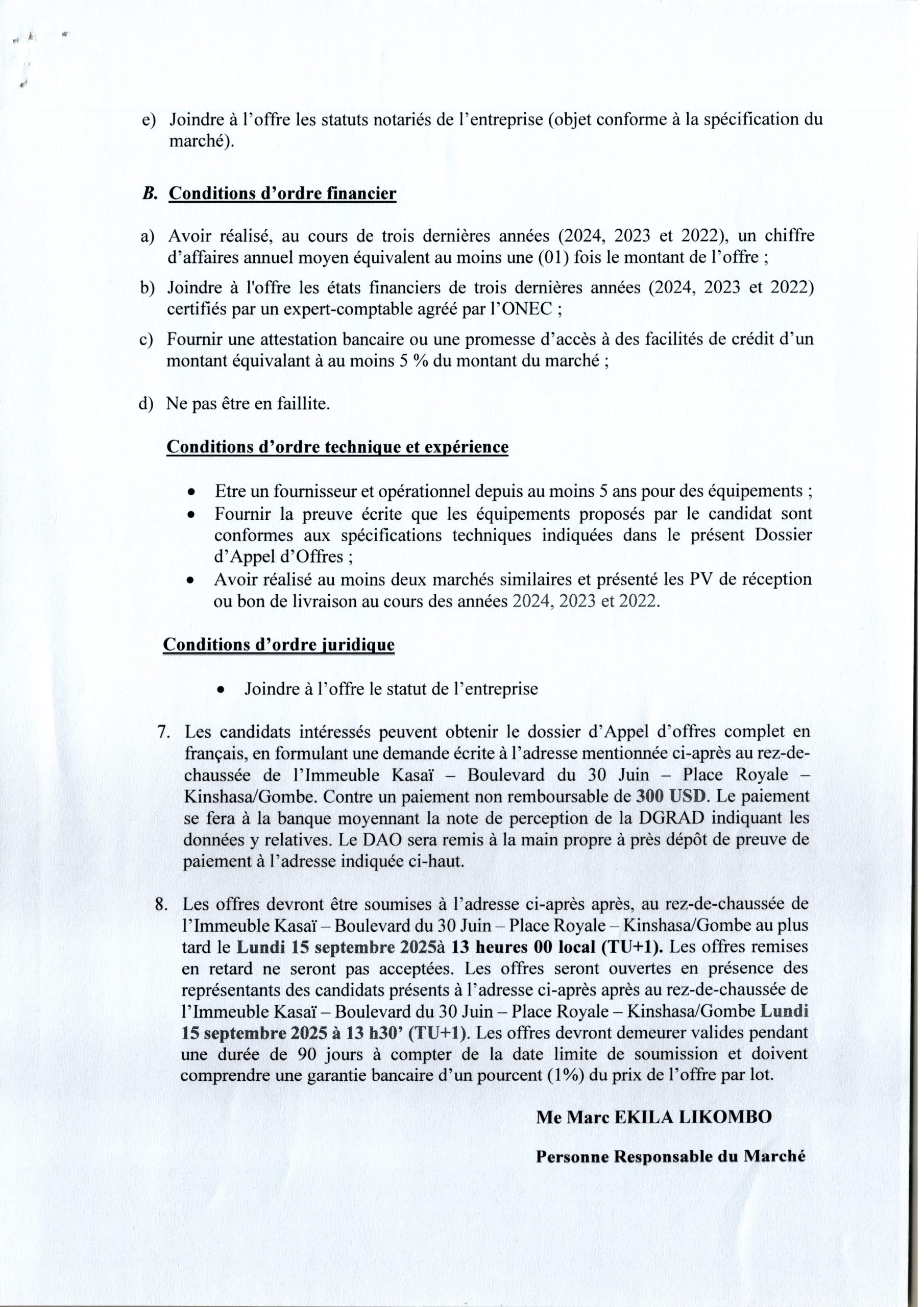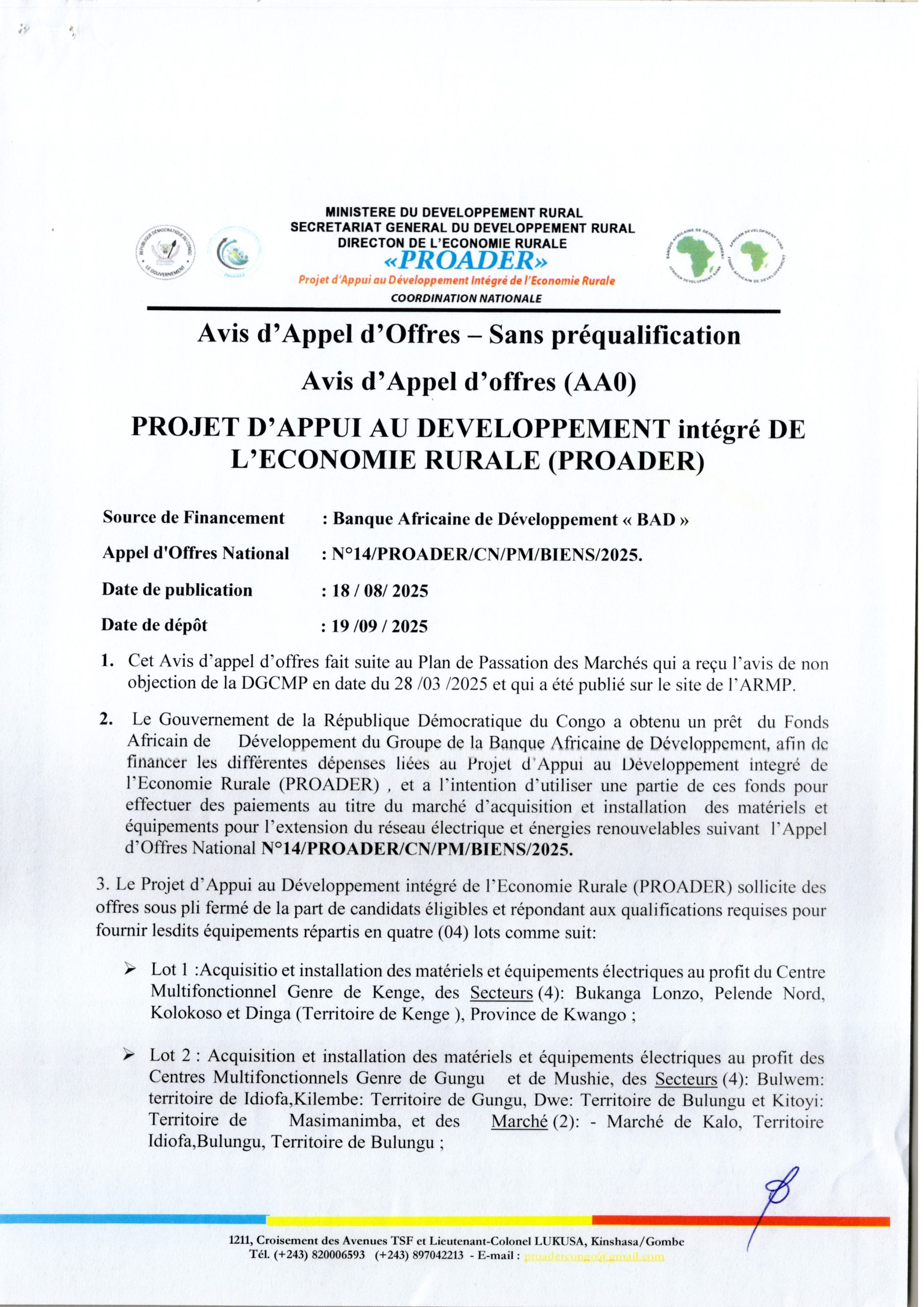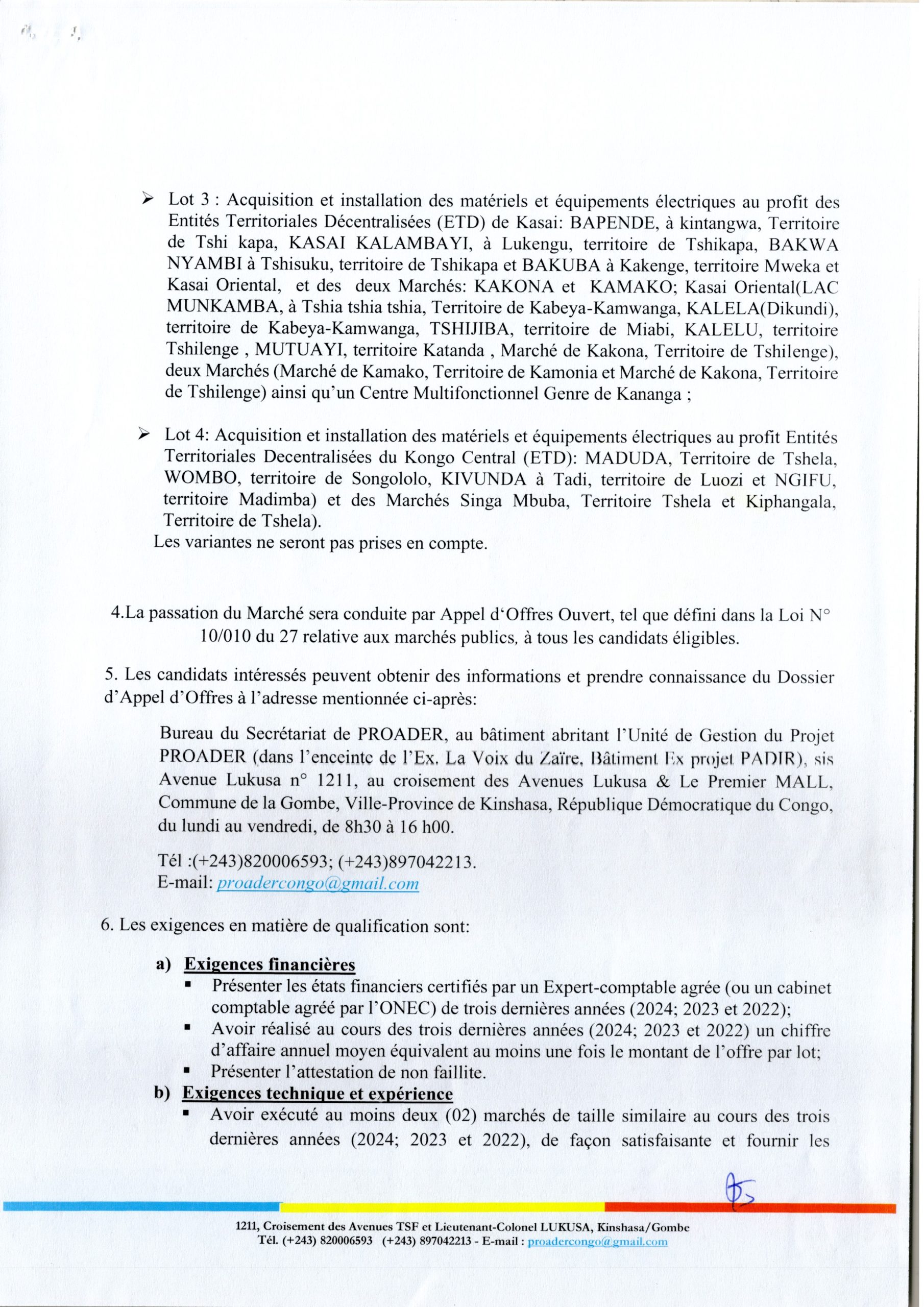 Acquisition des équipements de bureau au profit des Entités Territoriales Décentralisées “ETD” dans les provinces ciblées du Projet (Kasai, Kasai-Oriental, Kwango, Kwilu et Kongo Central).