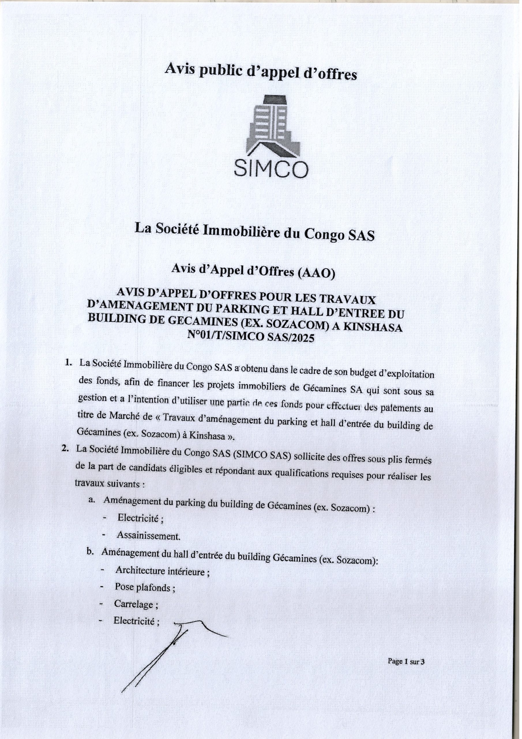 Travaux d’aménagement du Parking et Hall d’Entrée du Building de Gécamines (Ex. SOZACOM) à Kinshasa