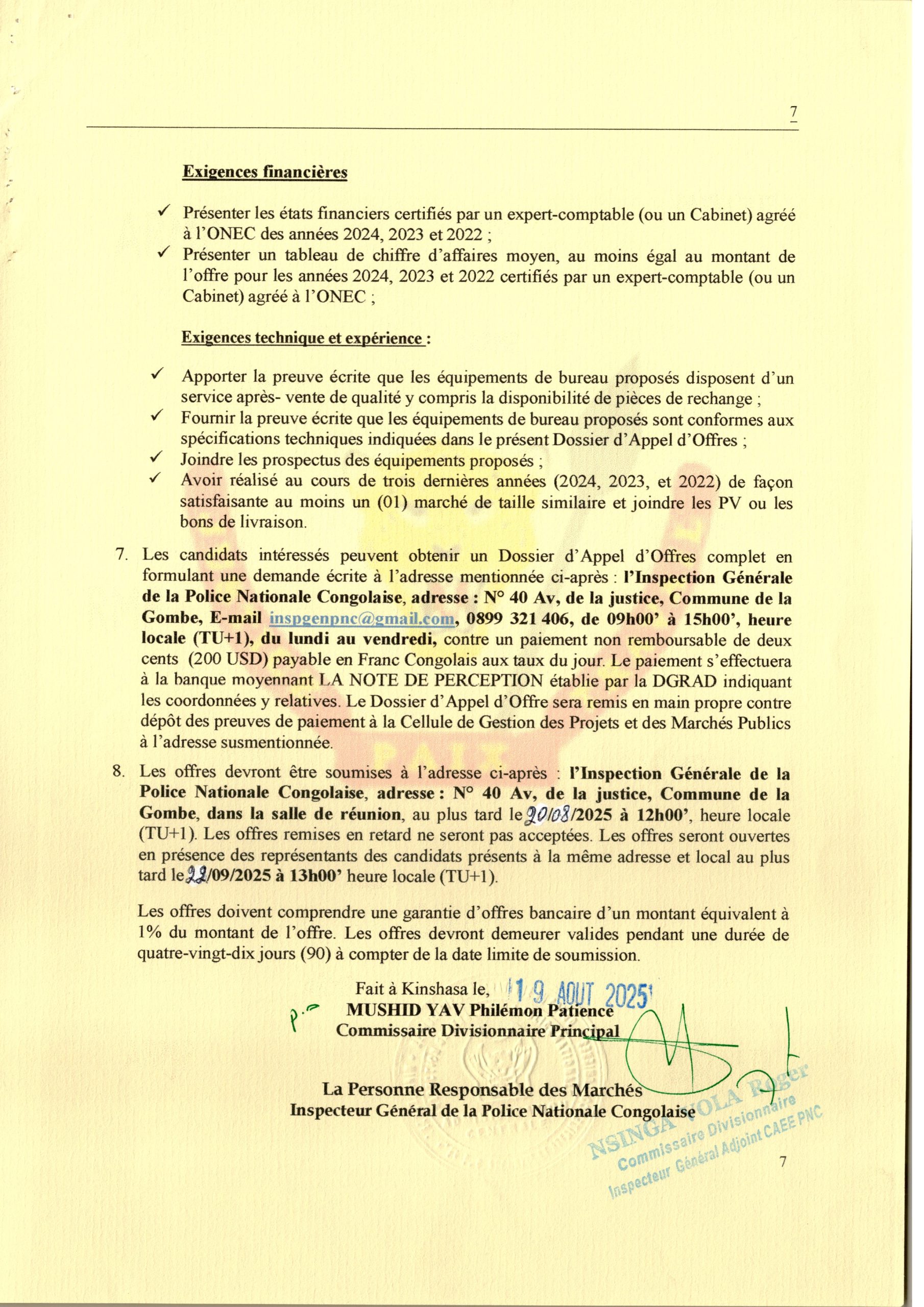 Acquisition d’équipements de bureau au profit de l’Inspection Générale de la Police nationale Congolaise.