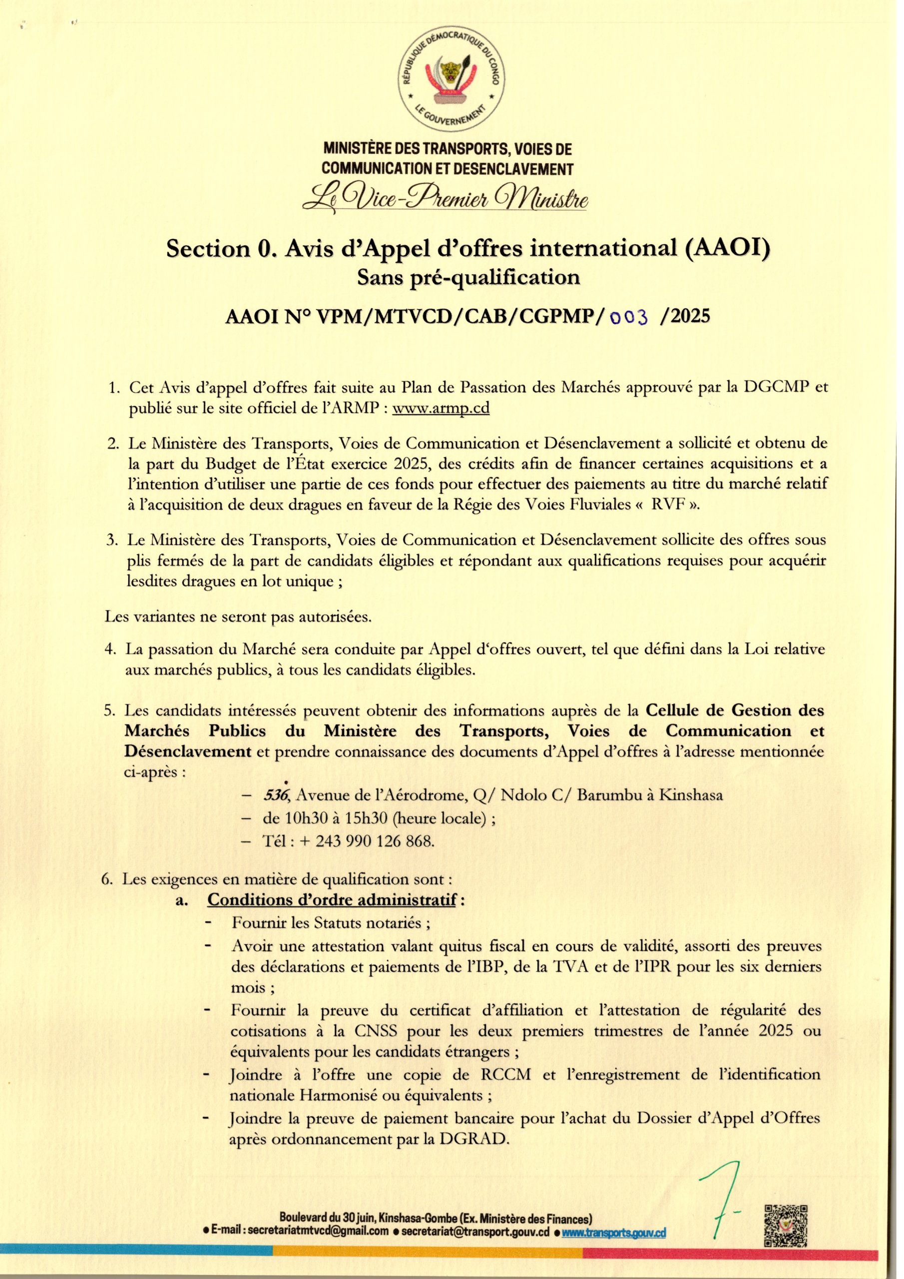 Acquisition de deux dragues en faveur de la régie des Voies Fluviales “RVF”