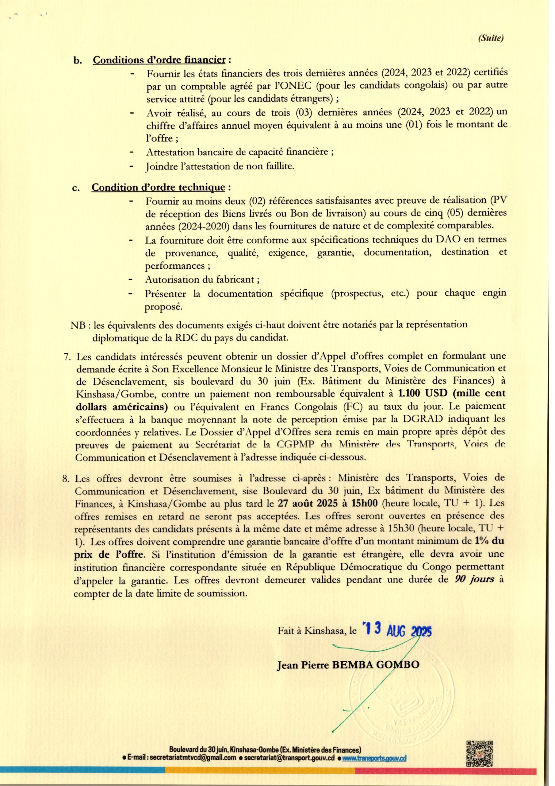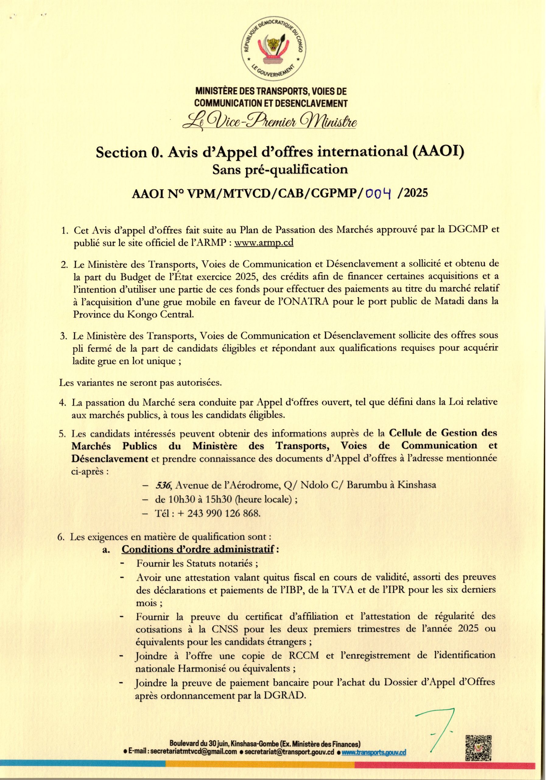 Acquisition d’une grue mobile en faveur de l’ONATRA pour le port public de Matadi dans la province du Kongo Central