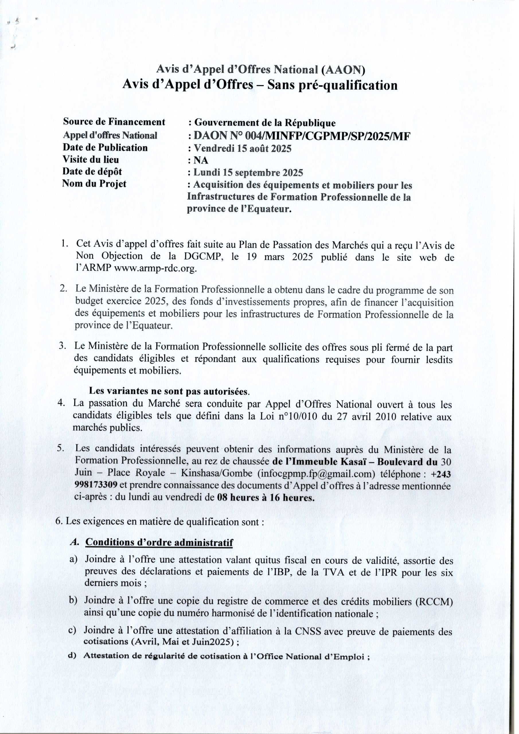 Acquisition des équipements et mobiliers pour les infrastructures de Formation Professionnelle de la Province de l’Equateur en RDC.