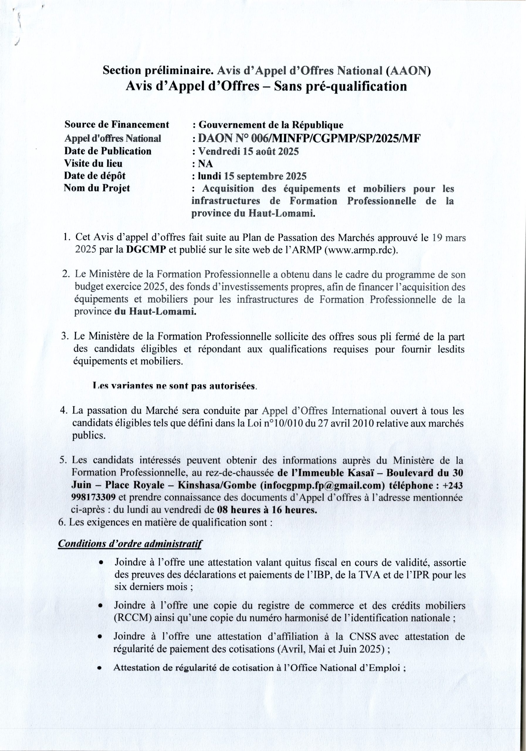 Acquisition des équipements et mobiliers pour les infrastructures de Formation Professionnelle de la Province de Haut-Lomami en RDC.