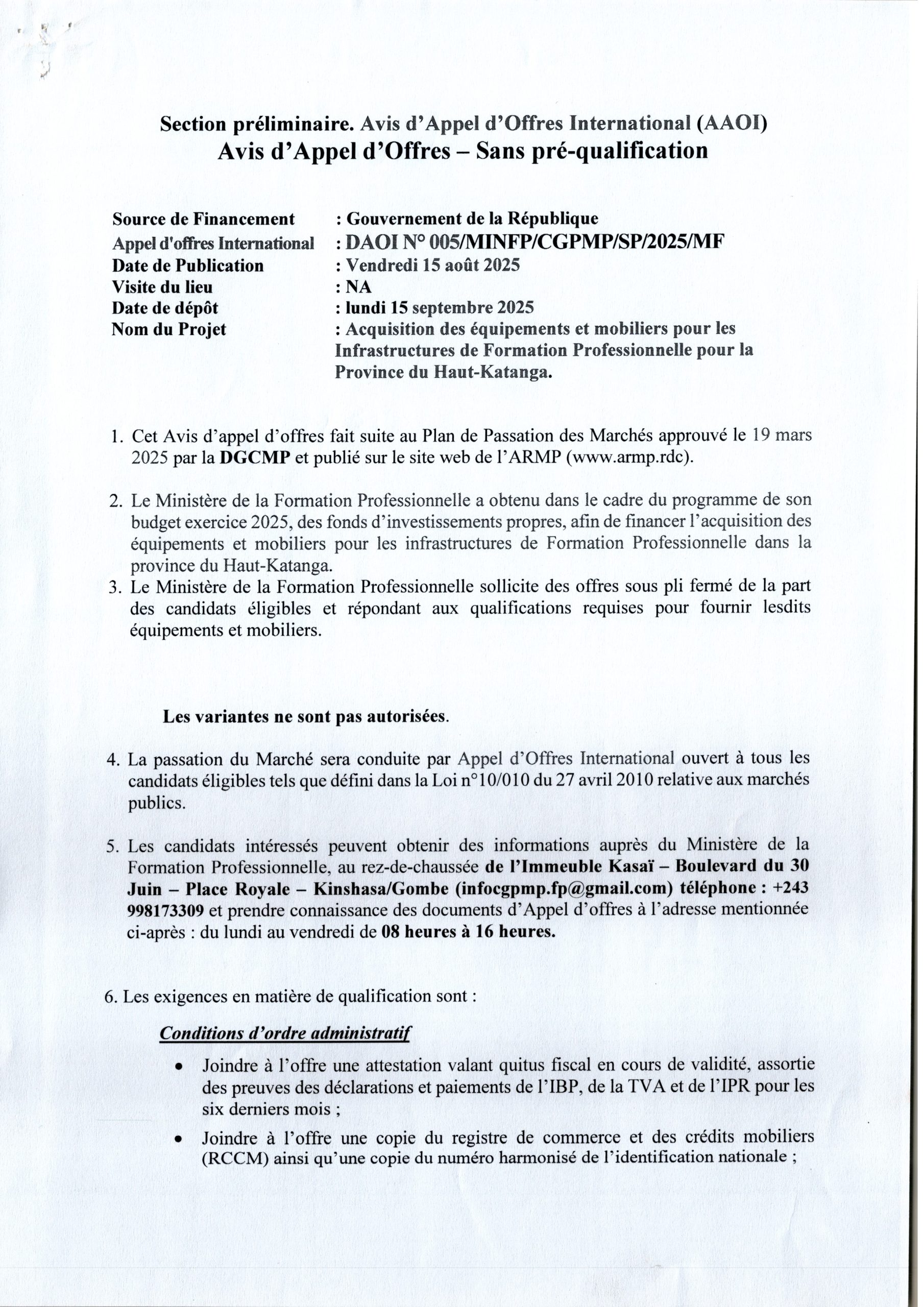 Acquisition des équipements et mobiliers pour les infrastructures de Formation Professionnelle de la Province du Haut-Katanga en RDC.
