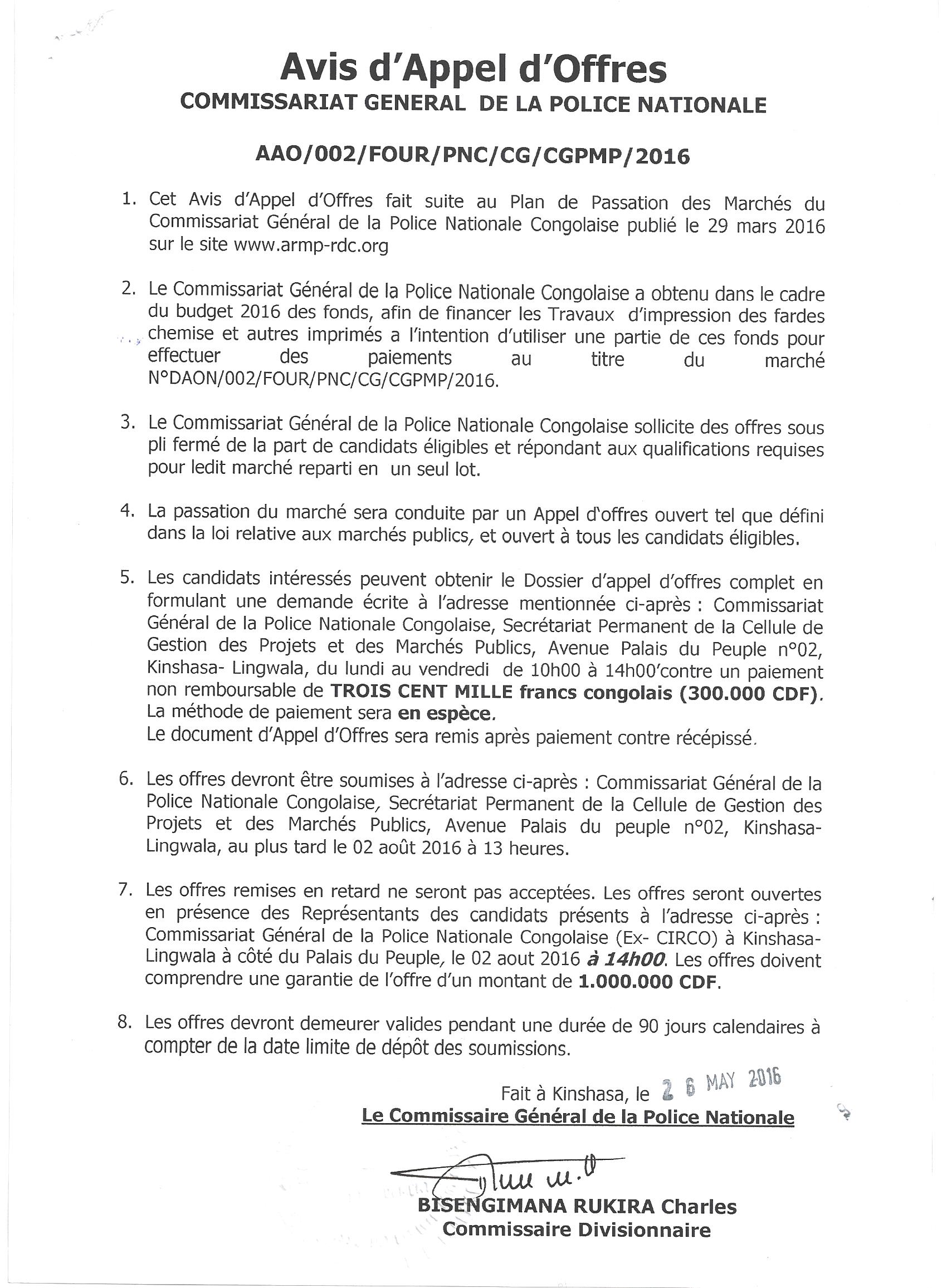 TRAVAUX D’IMPRESSION FARDES CHEMISE ET AUTRE IMPRIMÉS AU PROFIT DU COMMISSARIAT GÉNÉRAL DE LA POLICE NATIONALE CONGOLAISE.