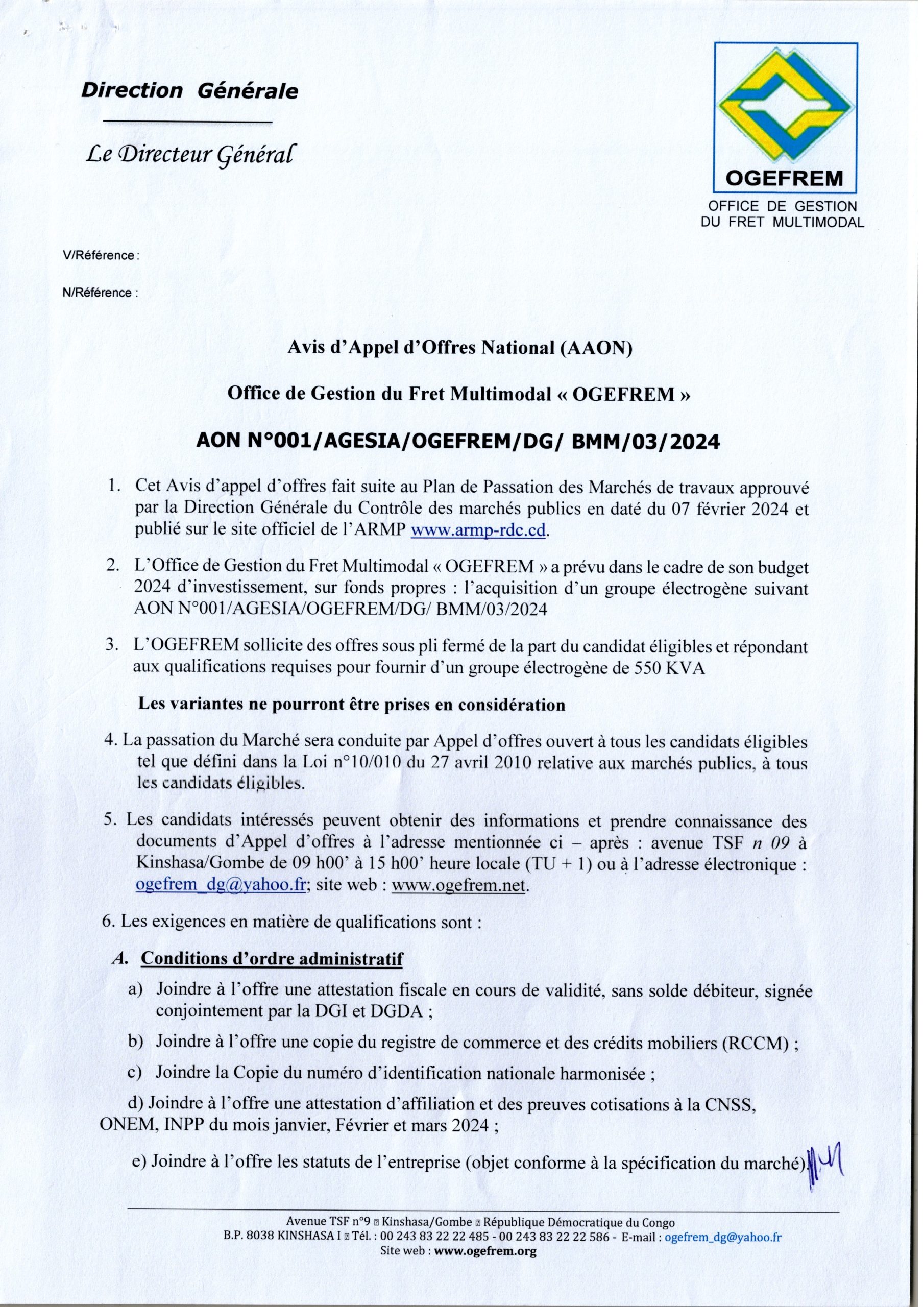Avis d’appel d’offres National de l’OGEFREM relatif à l’acquisition d’un groupe électrogène suivant AON N°001/AGESIA/OGEFREM/DG/BMM/03/2024