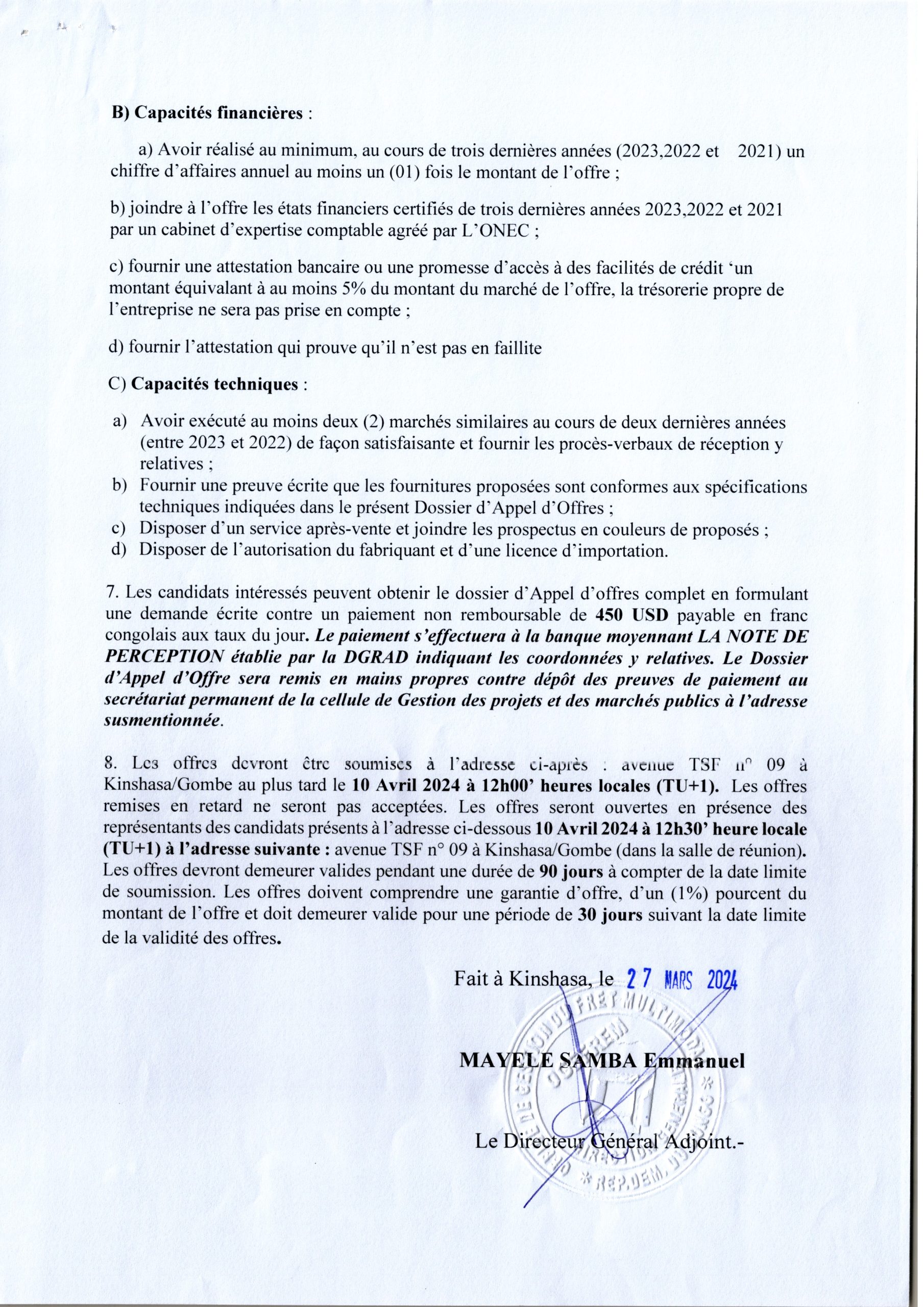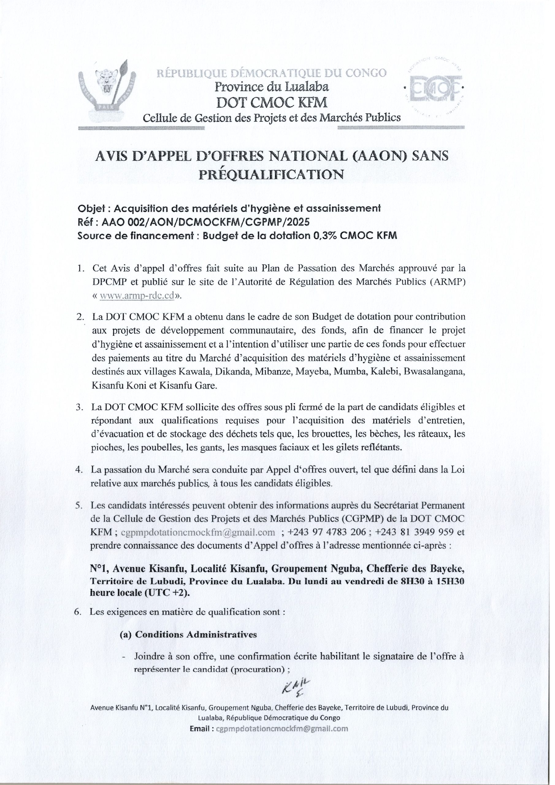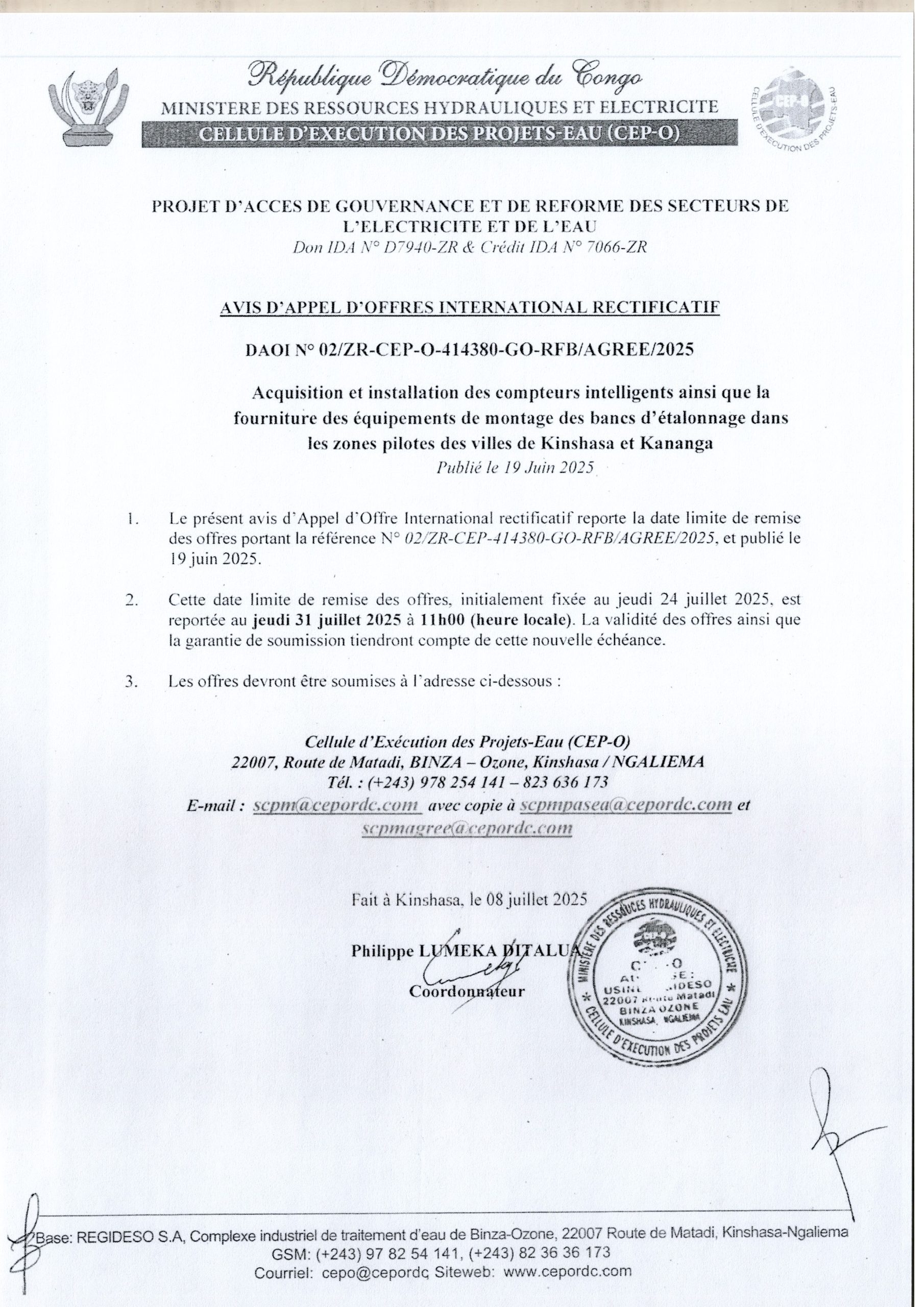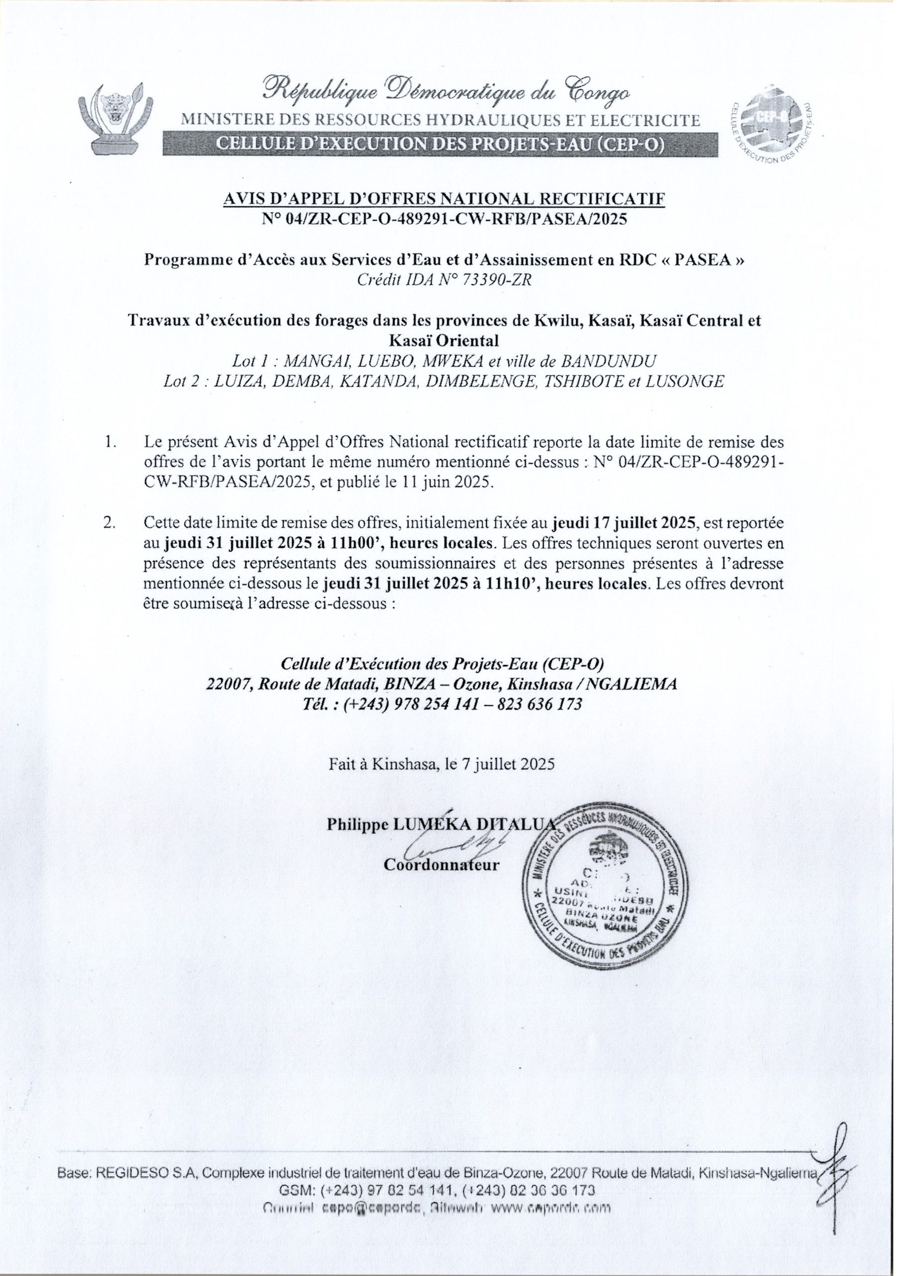 Avis d’appel d’offres national rectificatif du marché relatif aux travaux d’exécution des forages des forages dans les provinces du Kwilu, Kasai, Kasai Central et Kasai Oriental.