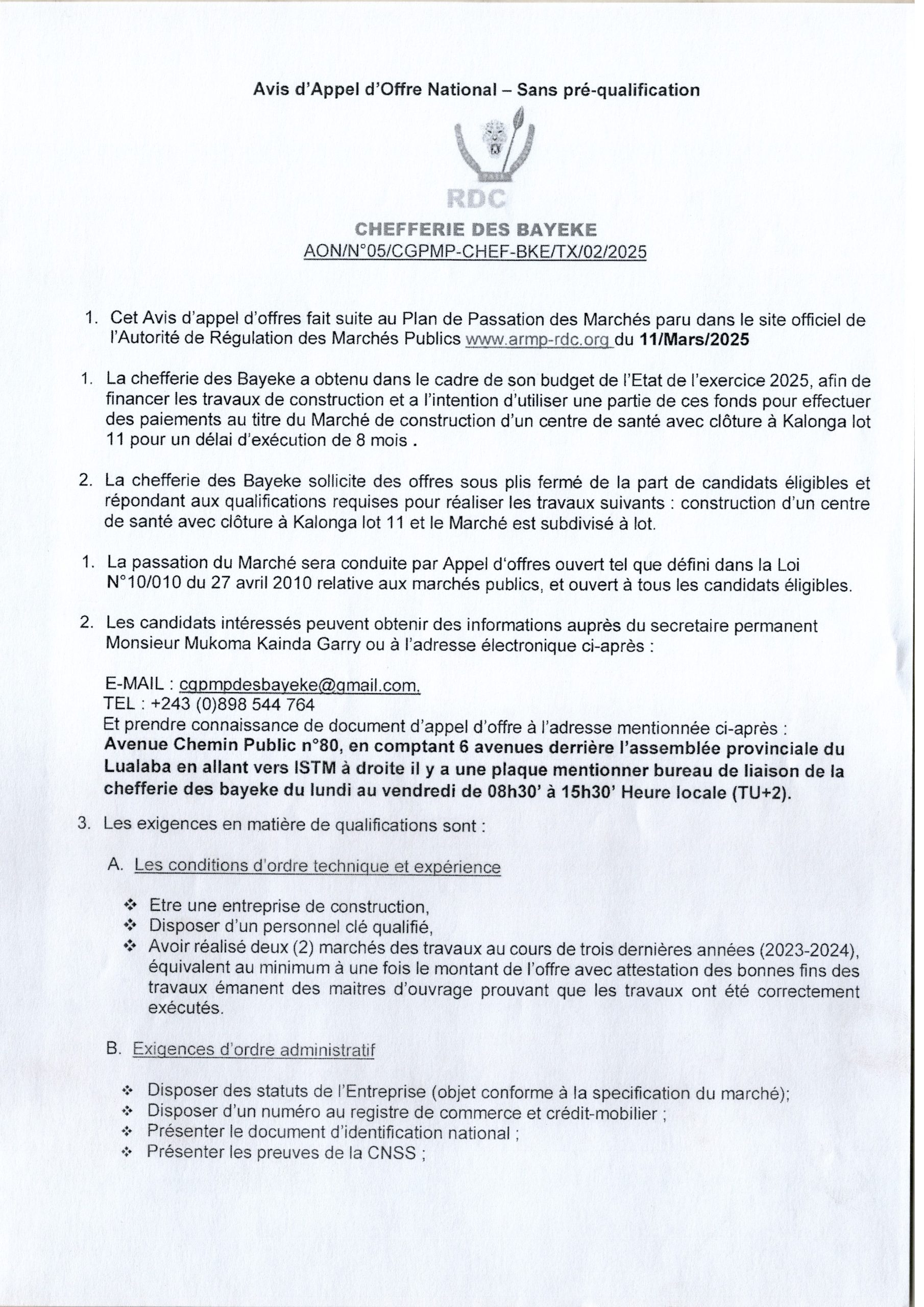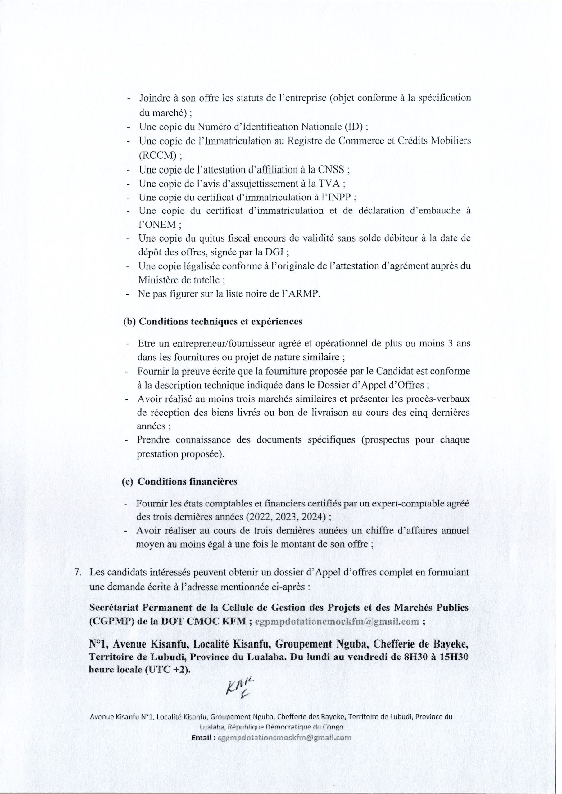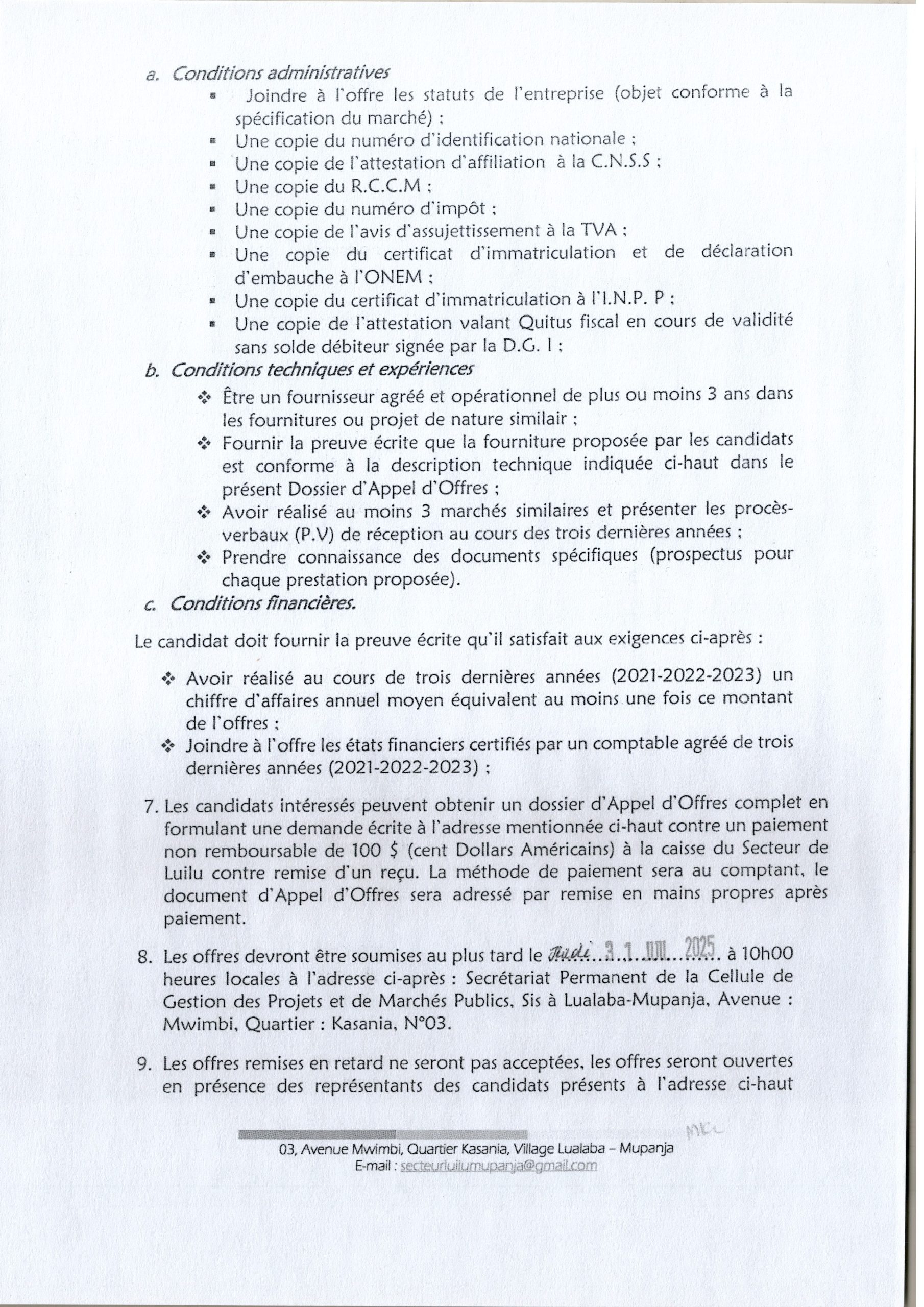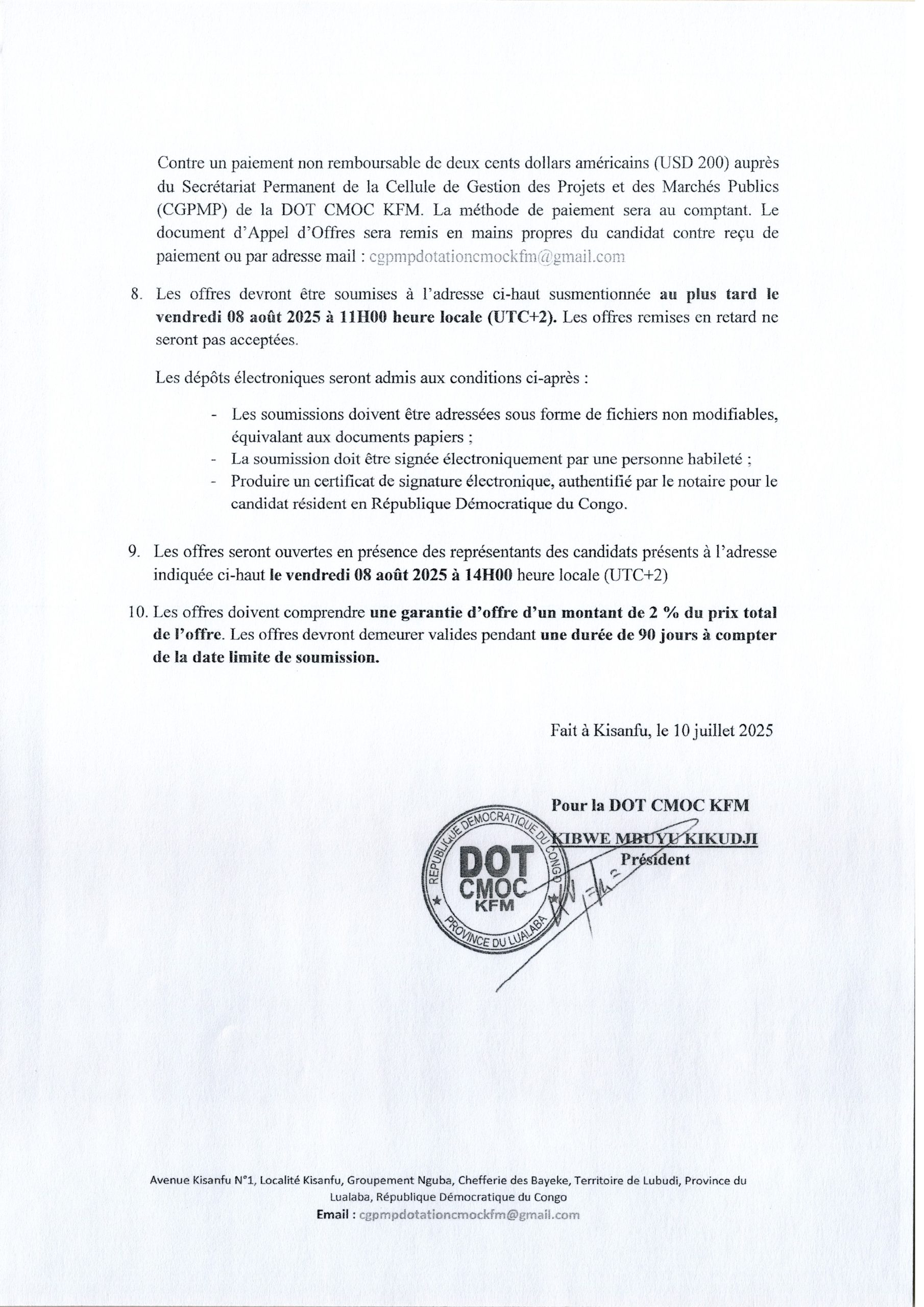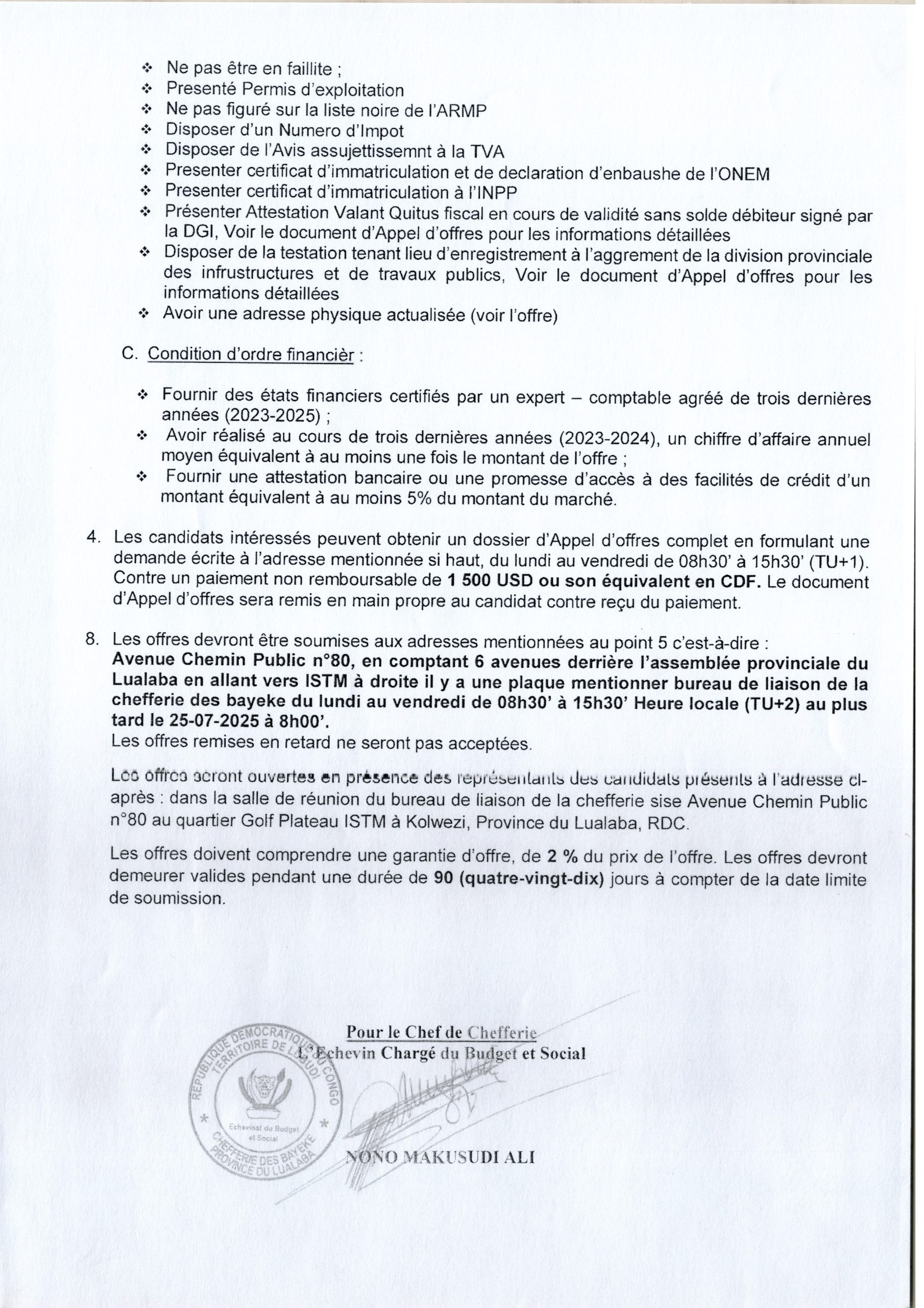 Avis d’appel d’offres national rectificatif du marché relatif aux travaux d’exécution des forages des forages dans les provinces du Kwilu, Kasai, Kasai Central et Kasai Oriental.