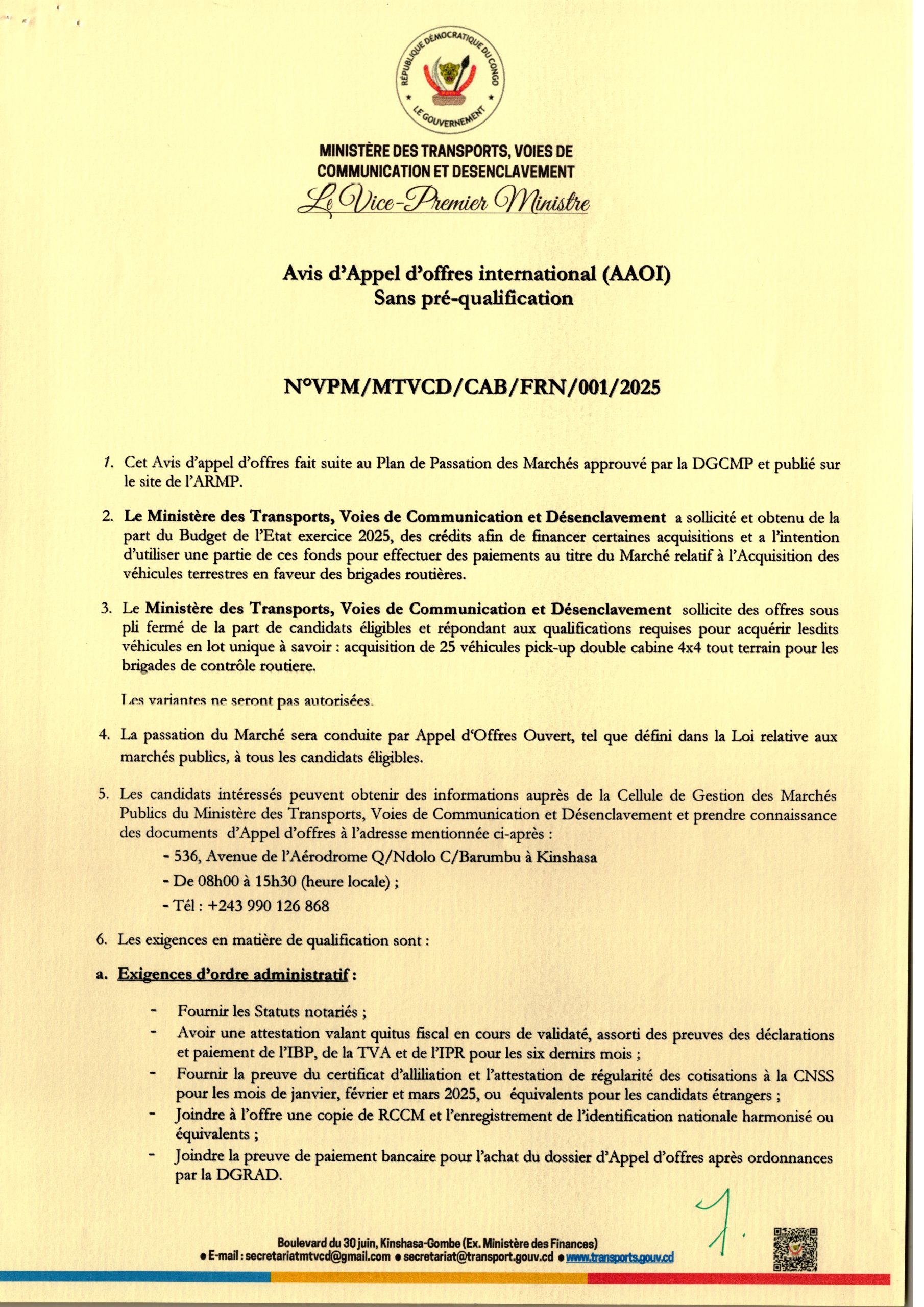Marché relatif à l’Acquisition des 25 véhicules pick-up double cabine 4×4 tout terrain pour les brigades de contrôle routier