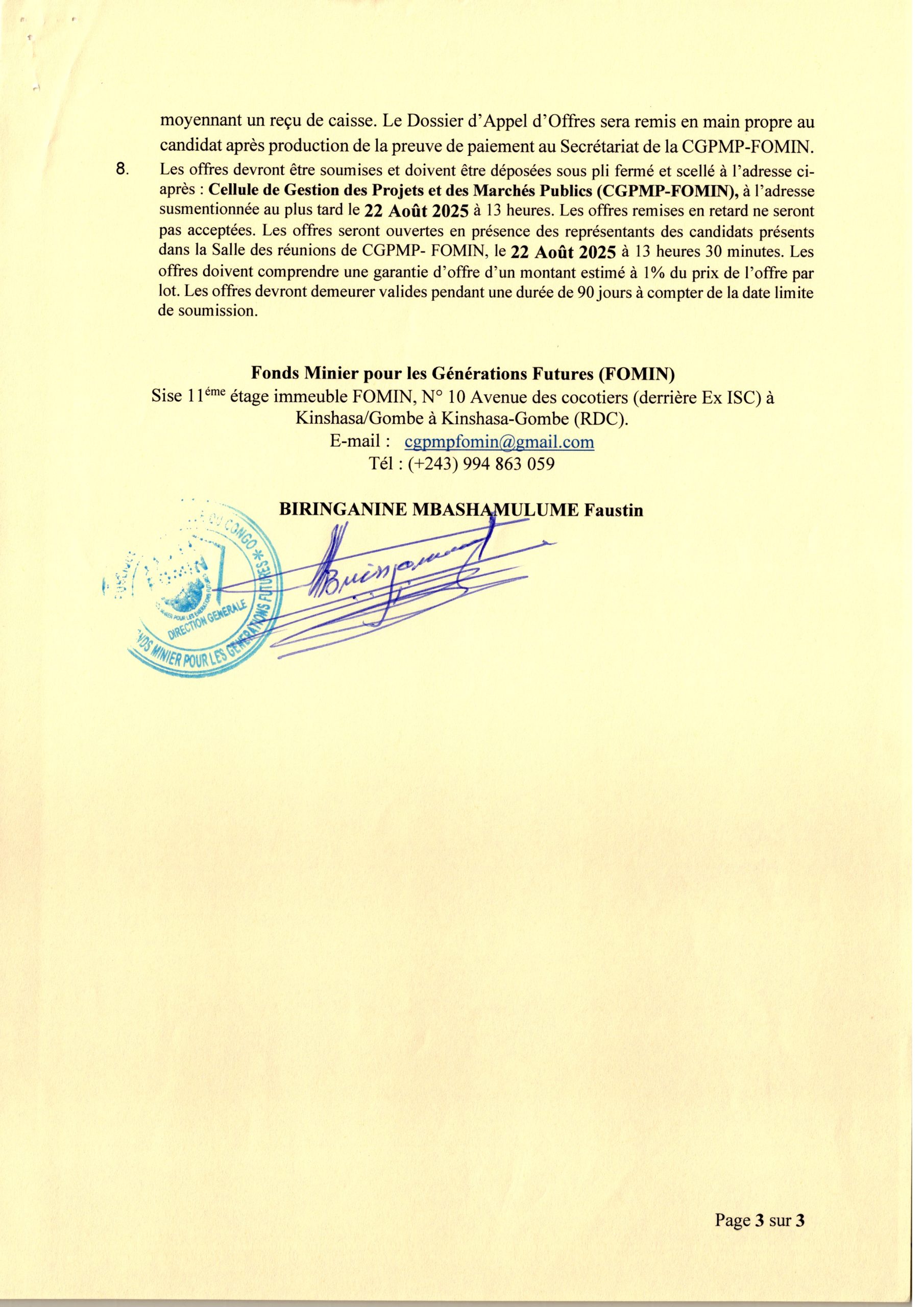 Acquisition des matériels Informatiques et Bureautiques pour la Direction Générale et les Antennes Provinciales du FOMIN.