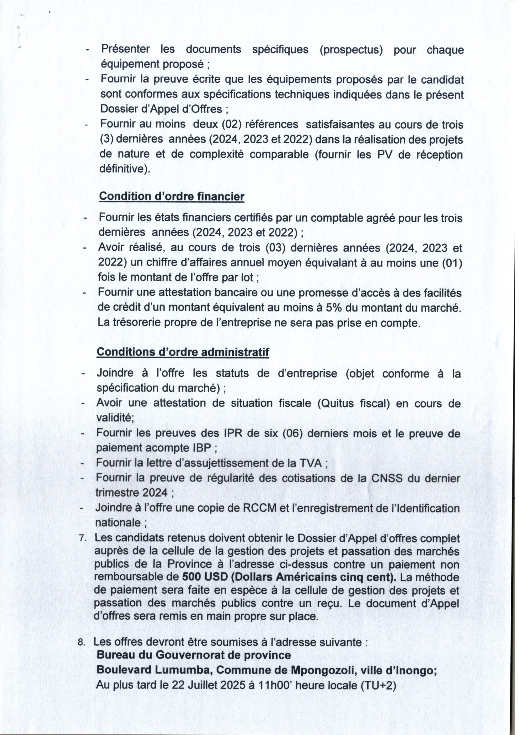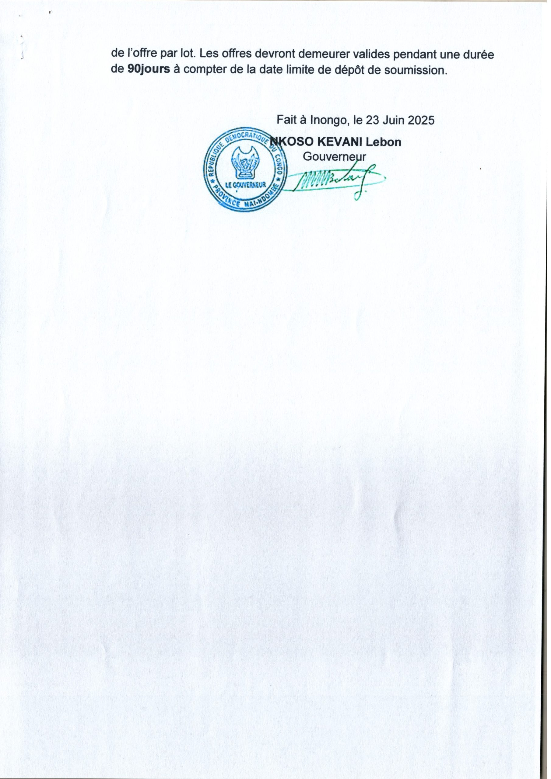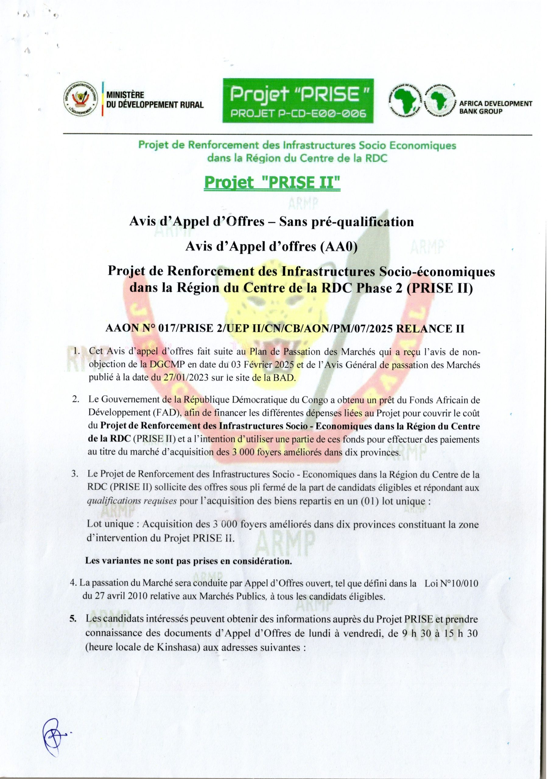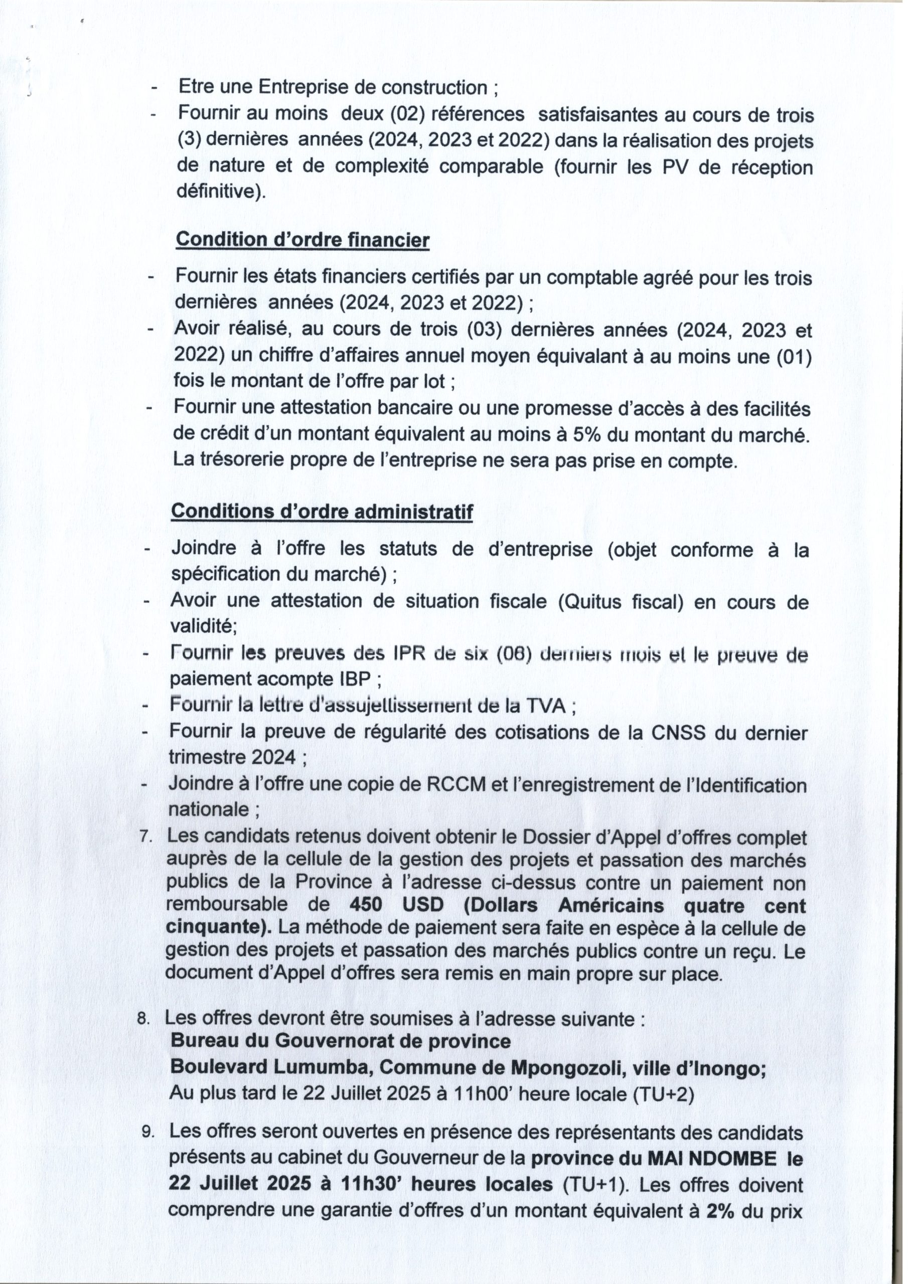 Marché relatif aux Travaux de Construction des infrastructures Sanitaires en Province du Mai Ndombe en deux lots