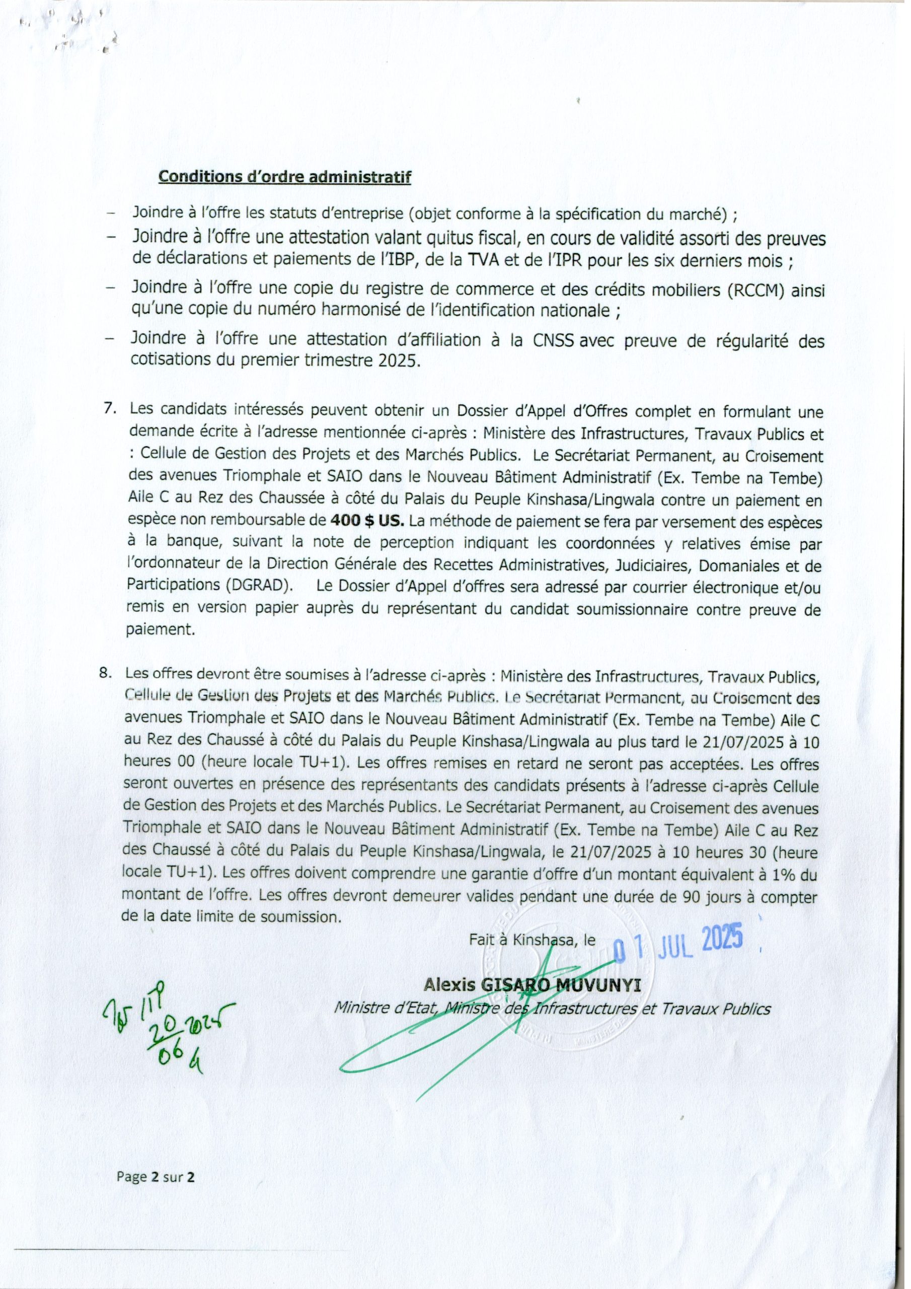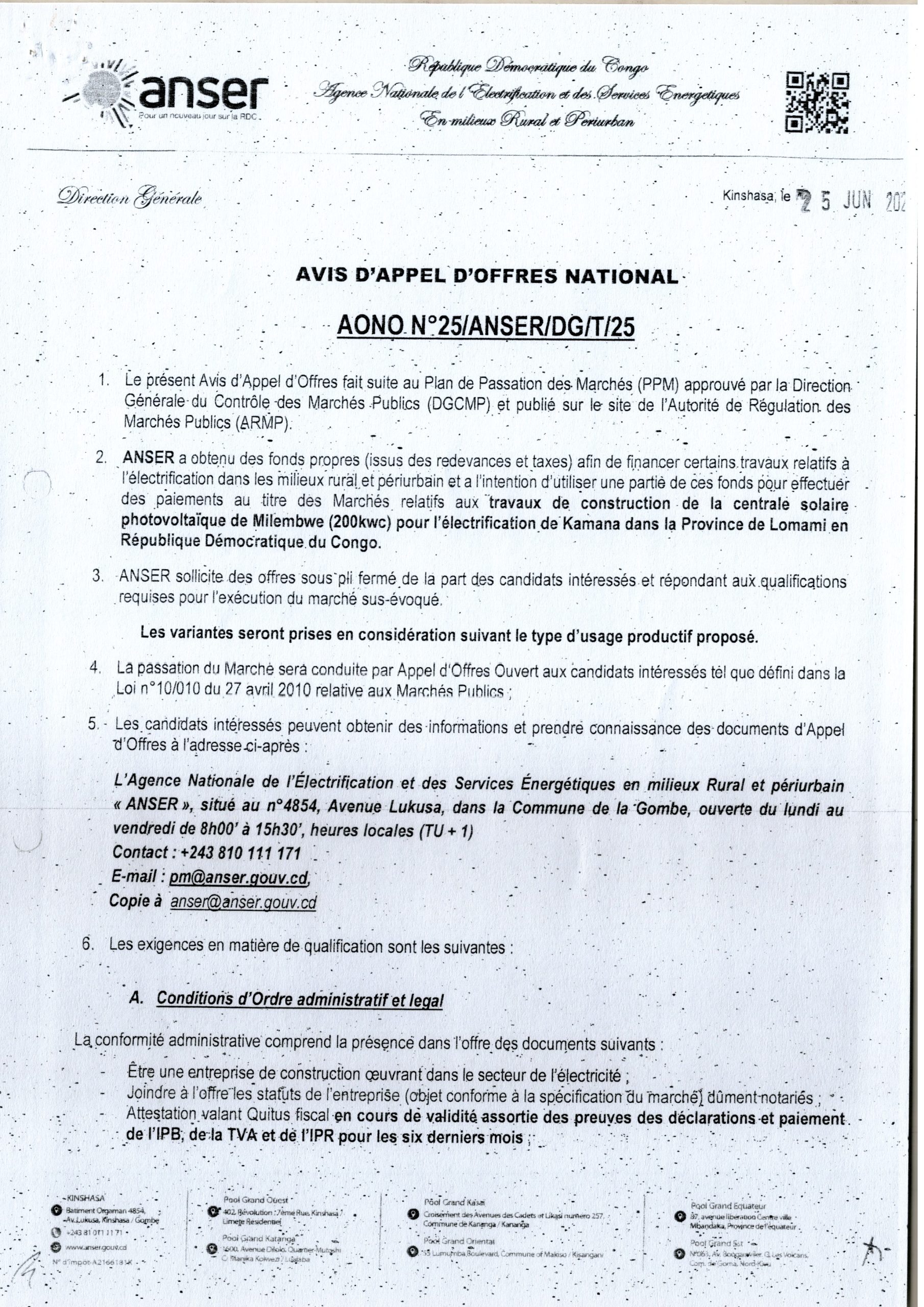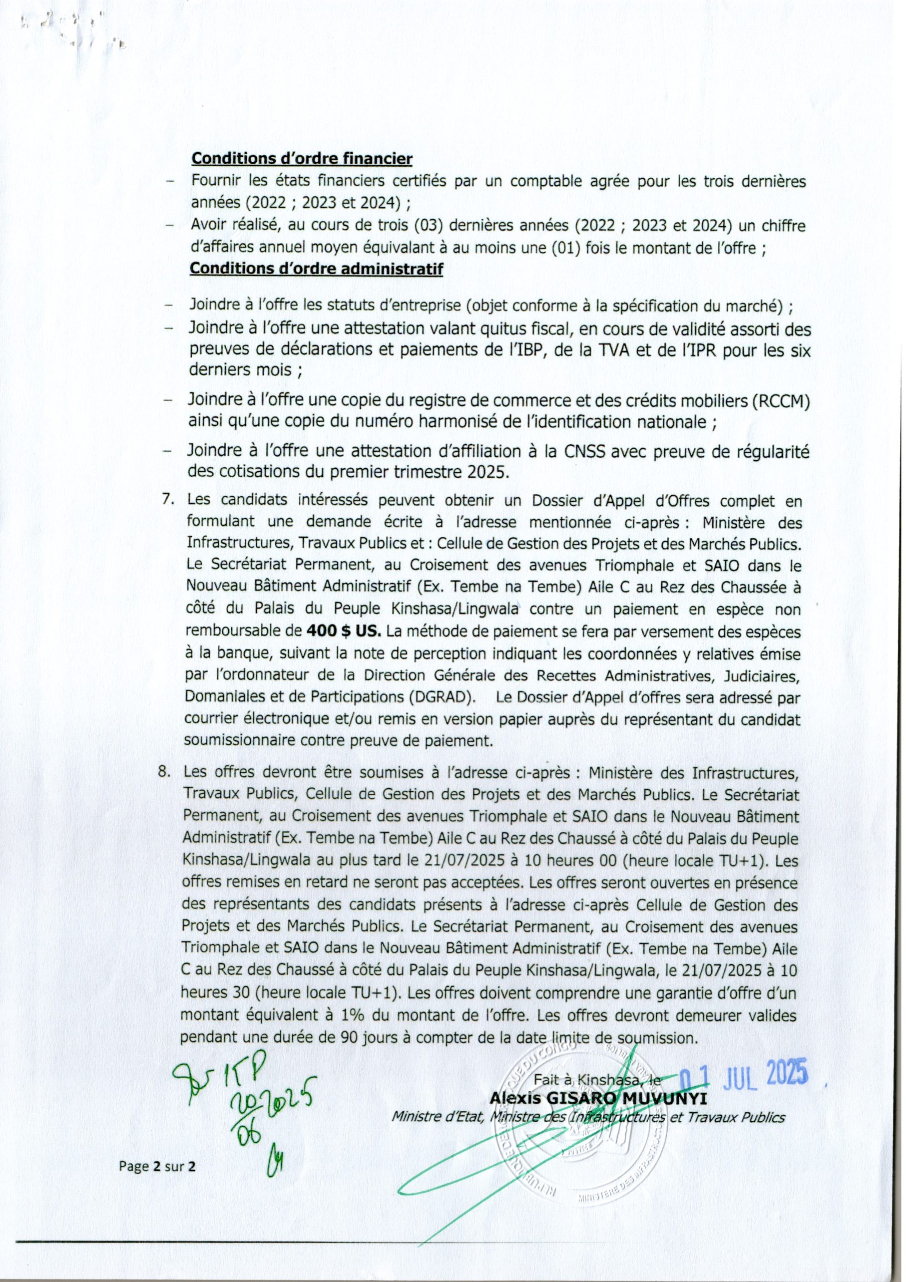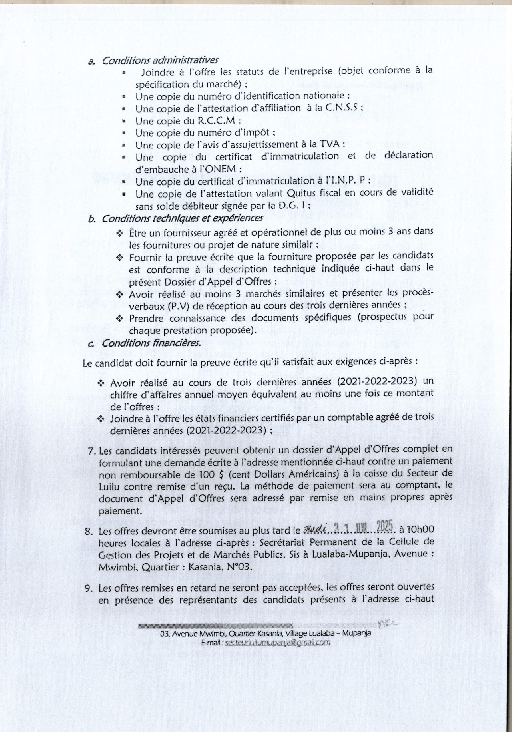 Marché relatif aux Travaux de Construction des infrastructures Sanitaires en Province du Mai Ndombe en deux lots