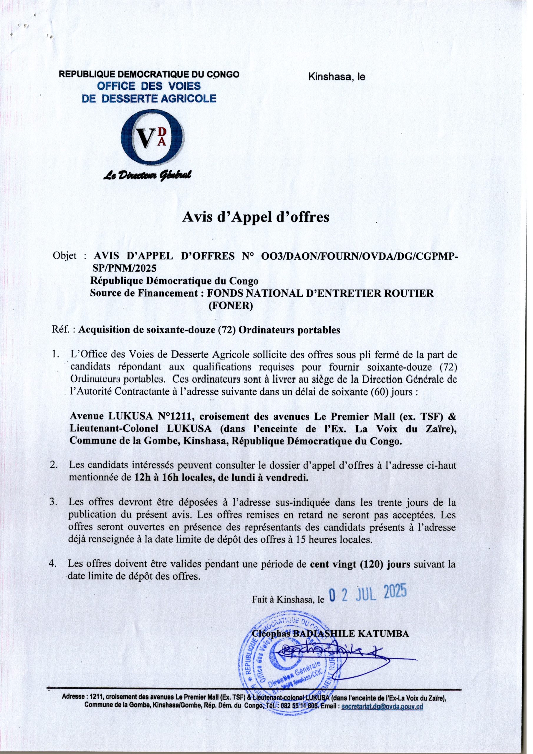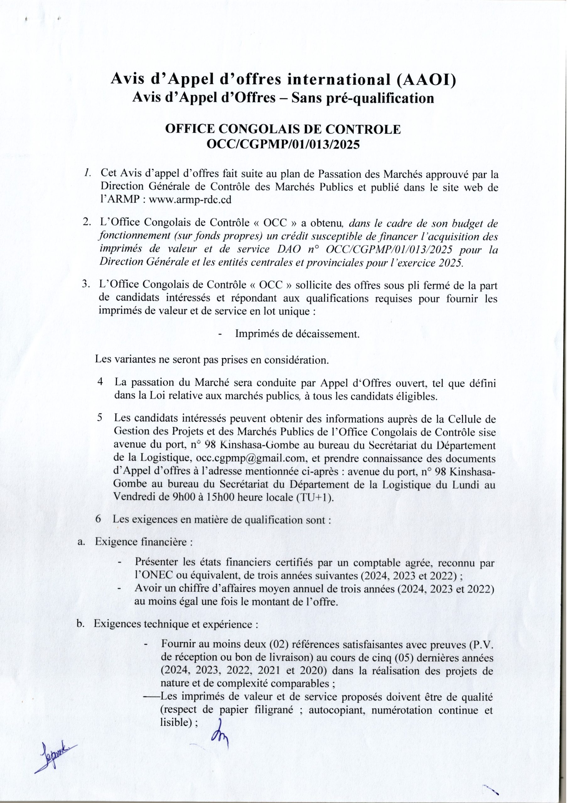 Acquisition des imprimés de valeur et de service pour la Direction Générale et ses entités centrales et provinciales pour l’exercice 2025.