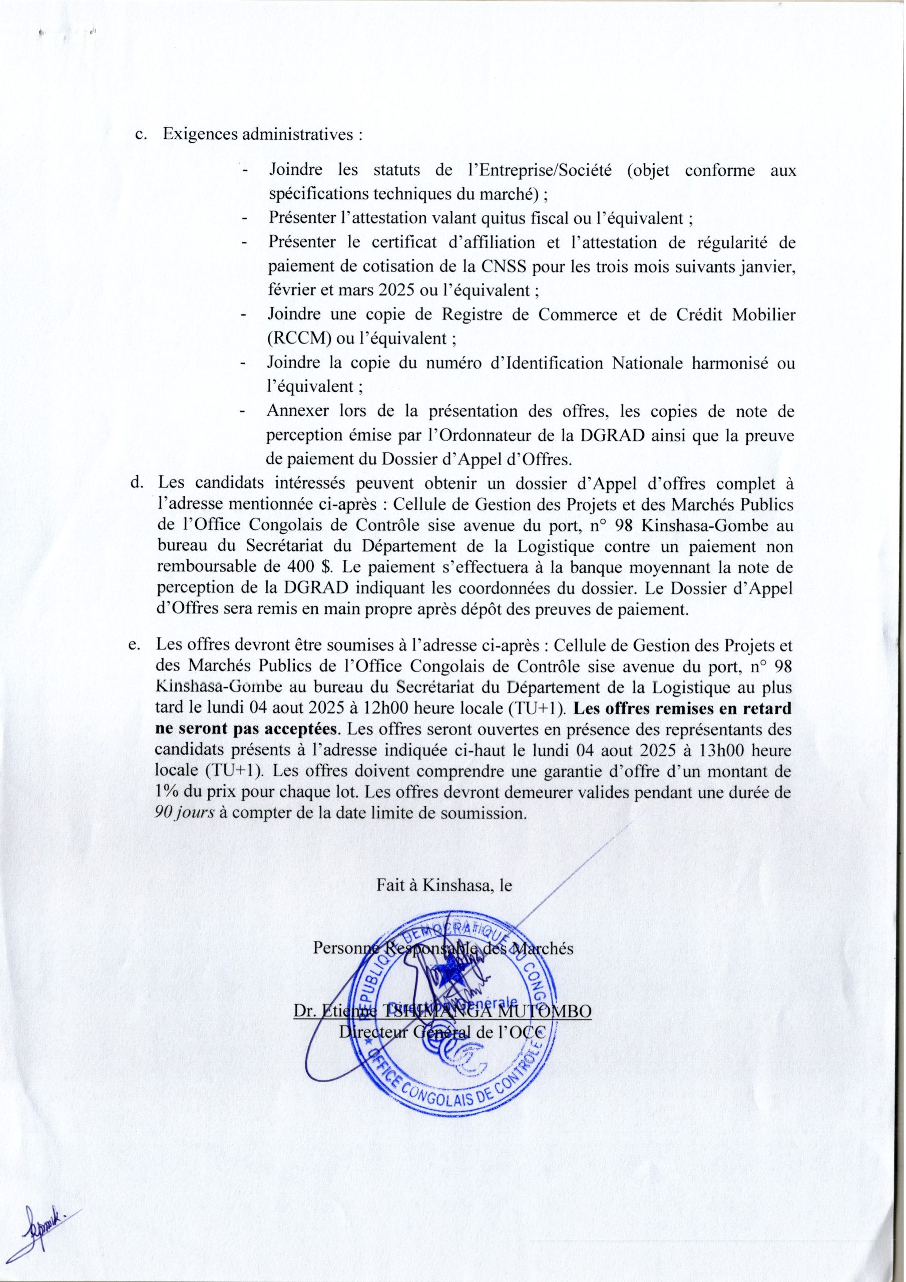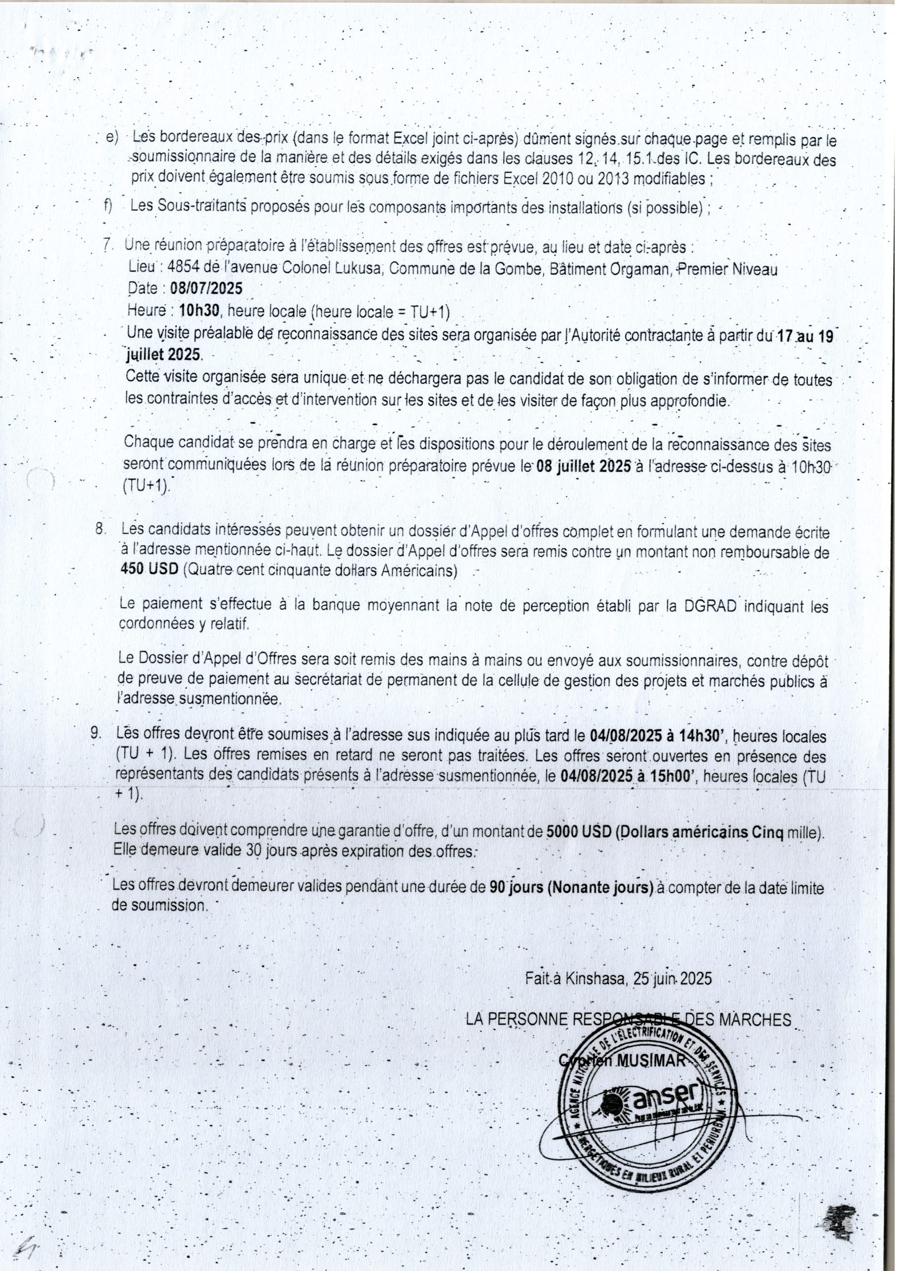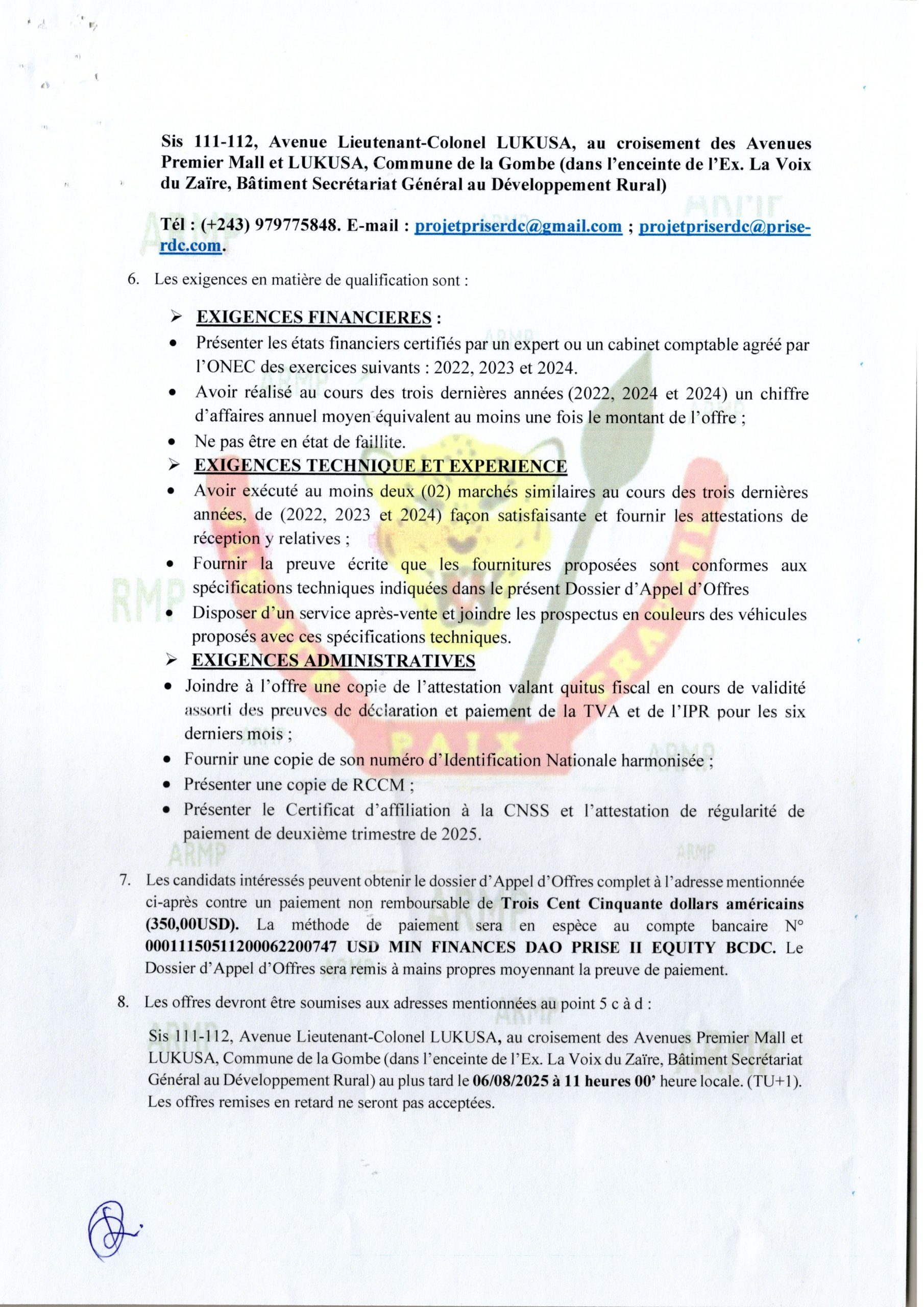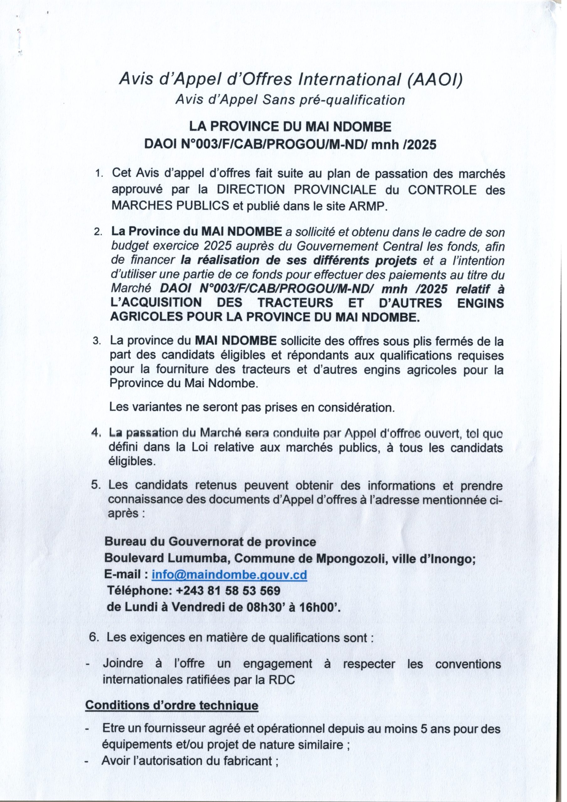 Marché relatif à l’Acquisition des Tracteurs et d’Autres Engins Agricoles pour la Province du Mai- Ndombe.