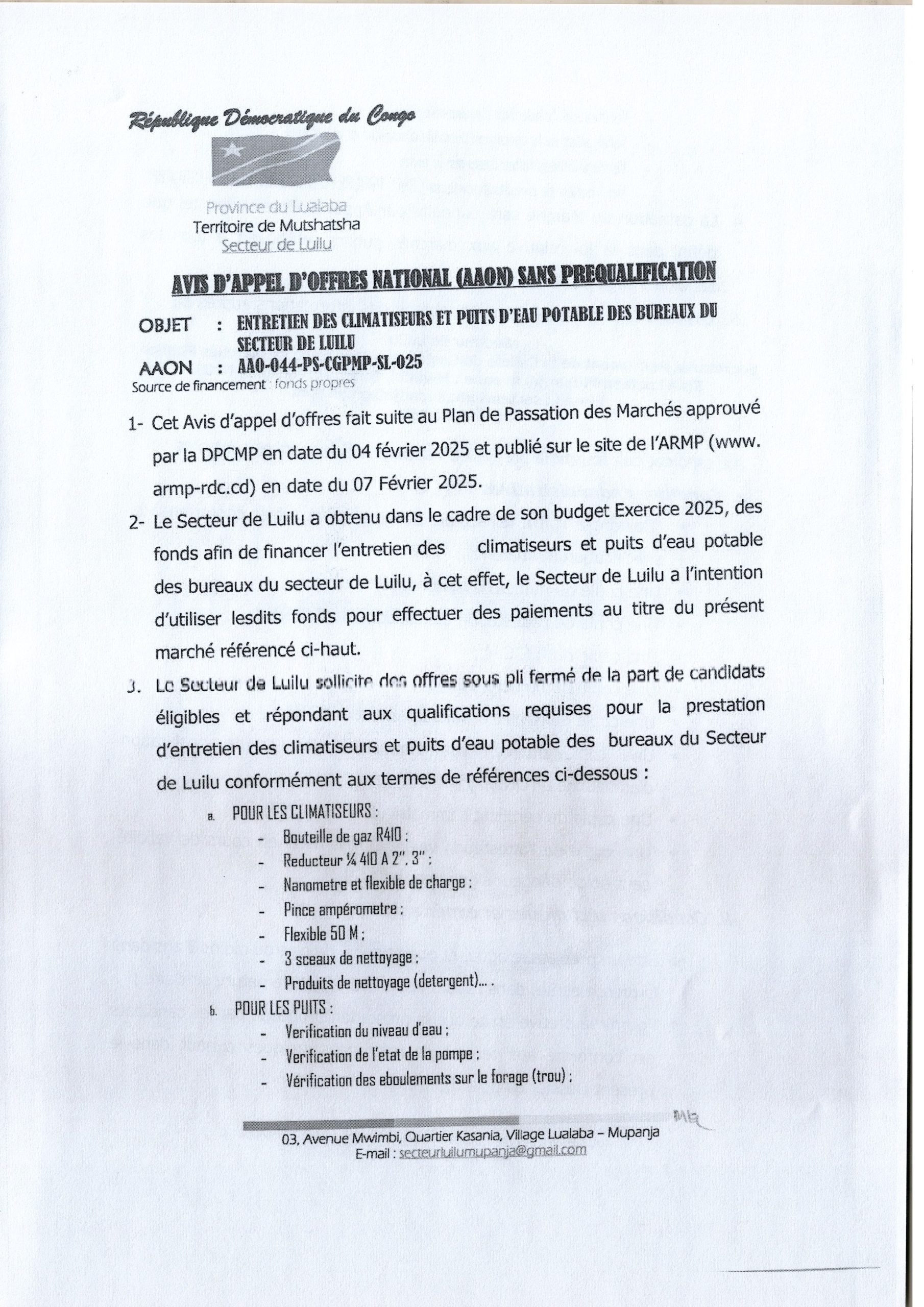 Entretien des climatiseurs et puits d’eau potable des bureaux du Secteur de Luilu.