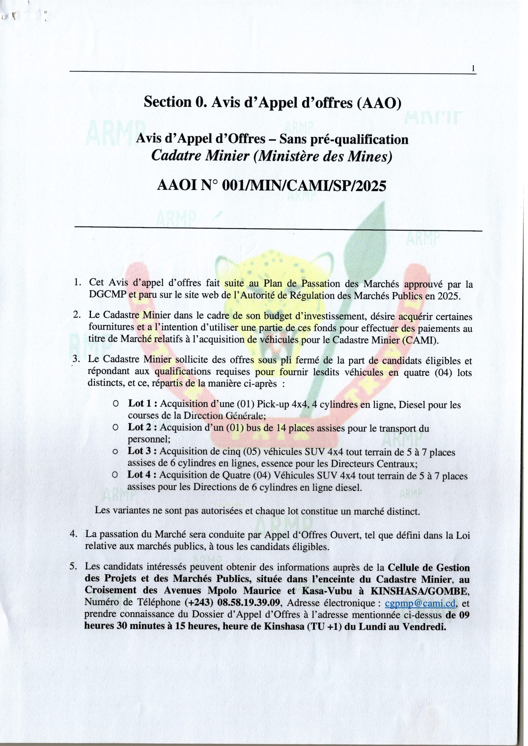 Acquisition de véhicule en quatre (04) lots distincts pour le Cadastre Minier (CAMI).