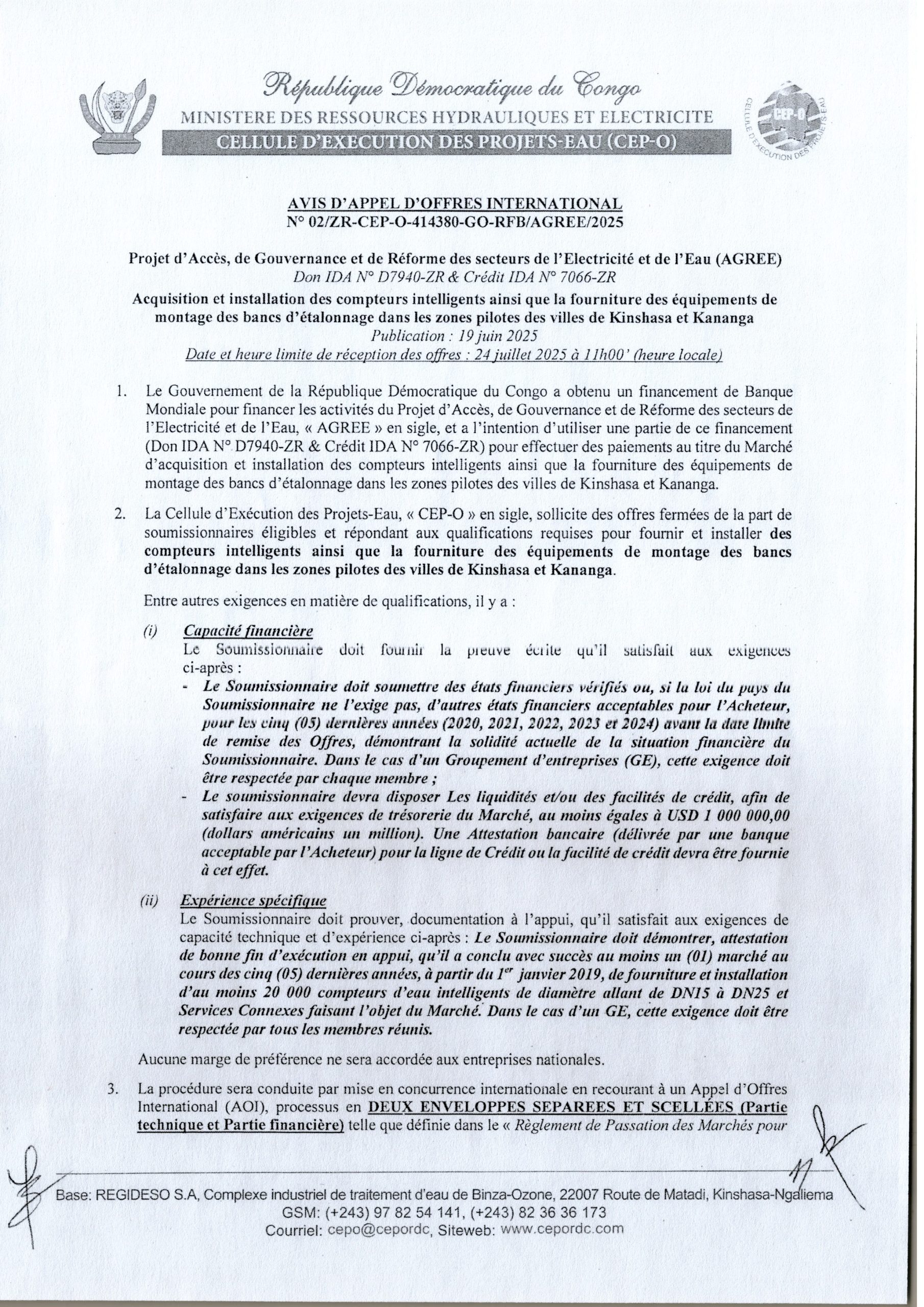 Acquisition et installation des compteurs intelligents ainsi que la fourniture des équipements de montage des bancs d’étalonnage dans les zones pilotes des villes de Kinshasa et Kananga.