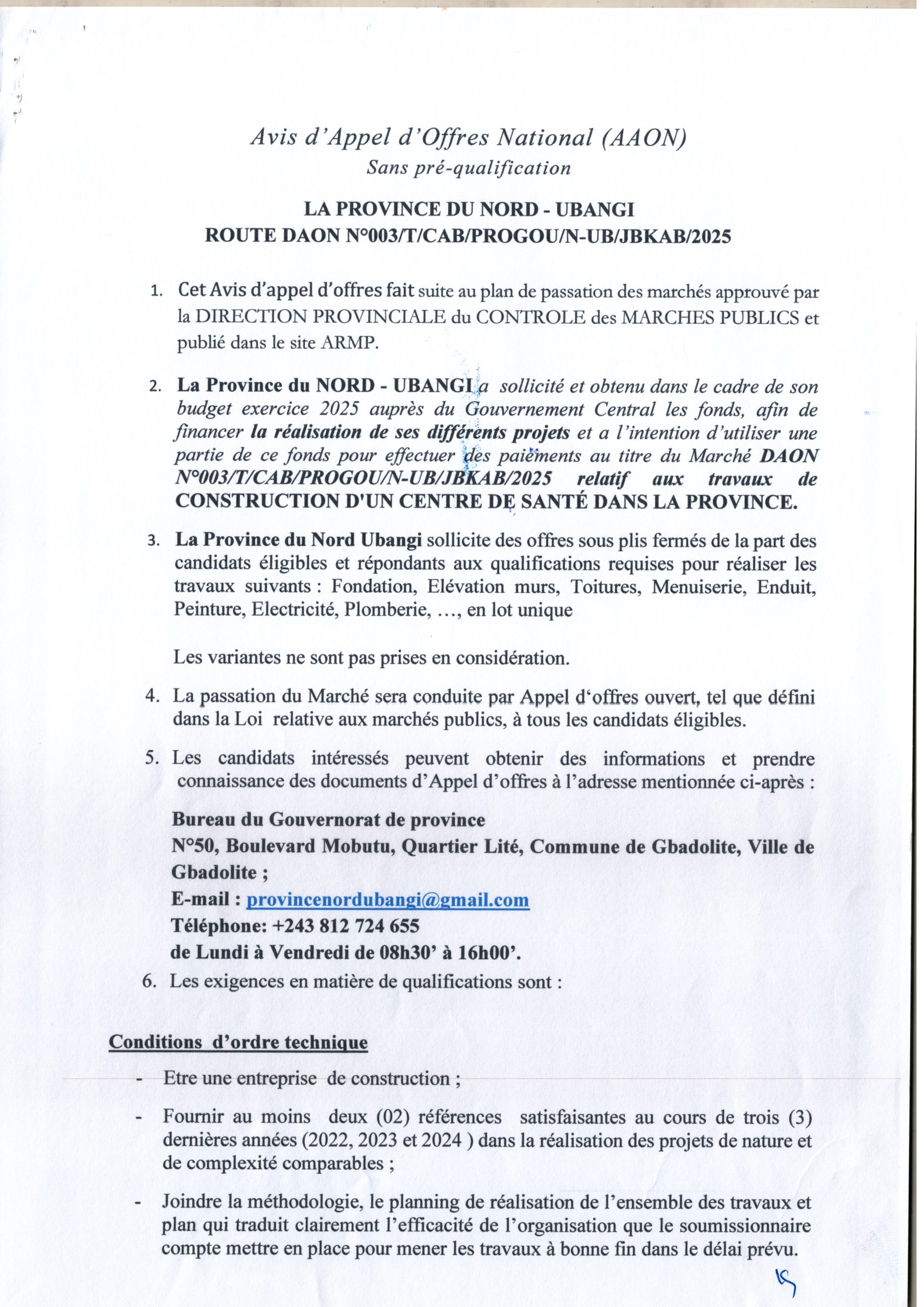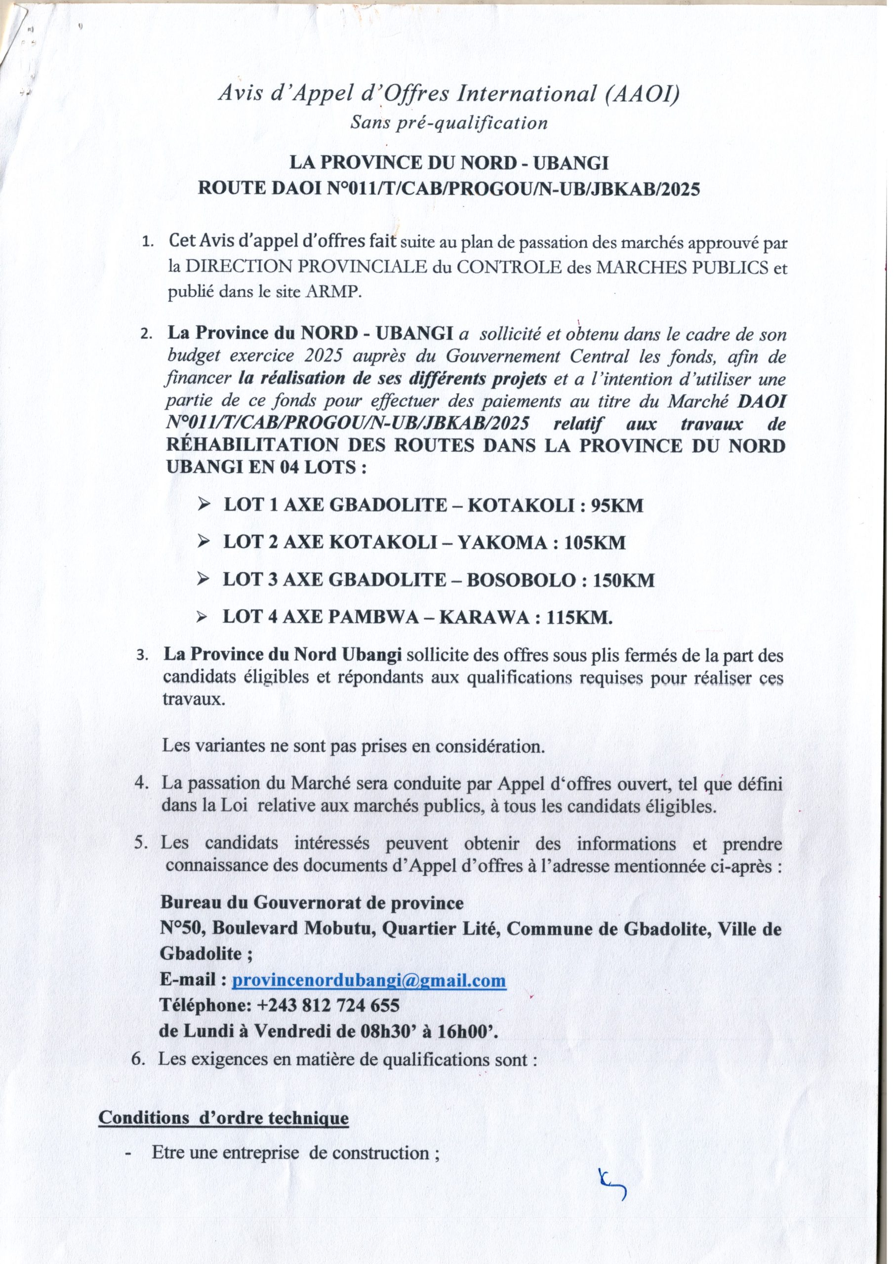 Réhabilitation des routes dans la province du Nord-Ubangi en 4 lots.