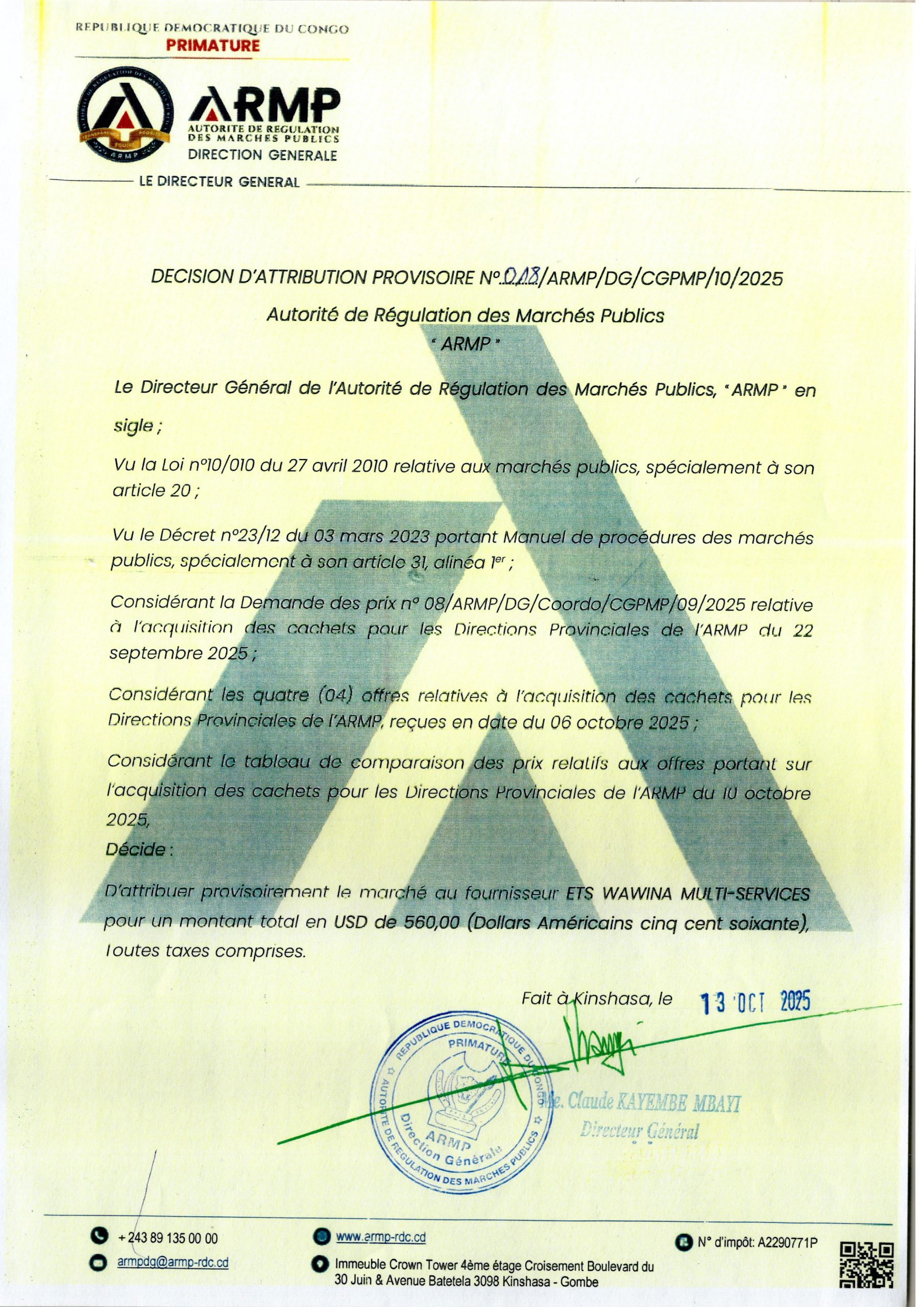 Attribution provisoire accordée à l’ETS WAWINA MULTI-SERVICES relative à l’acquisition des cachets pour les Directions Provinciales de l’ARMP du 10 octobre 2025