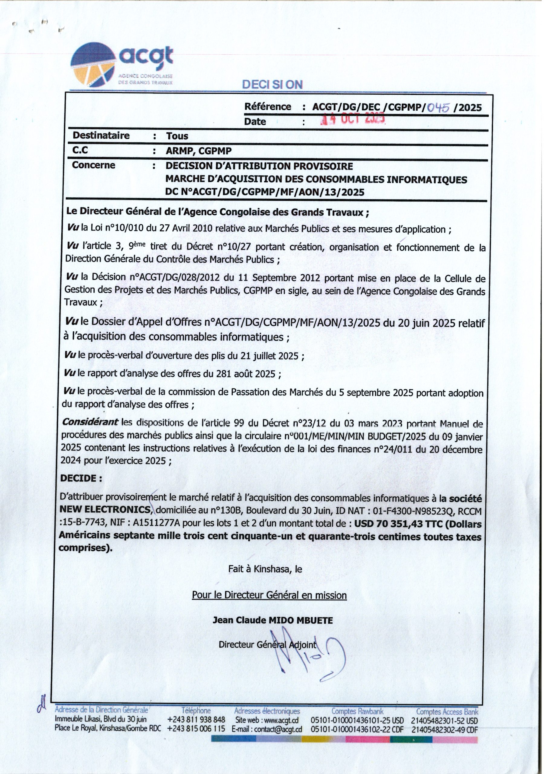 Attribution Provisoire du marché d’acquisition des Consommables Informatiques à la société NEW ELECTRONICS