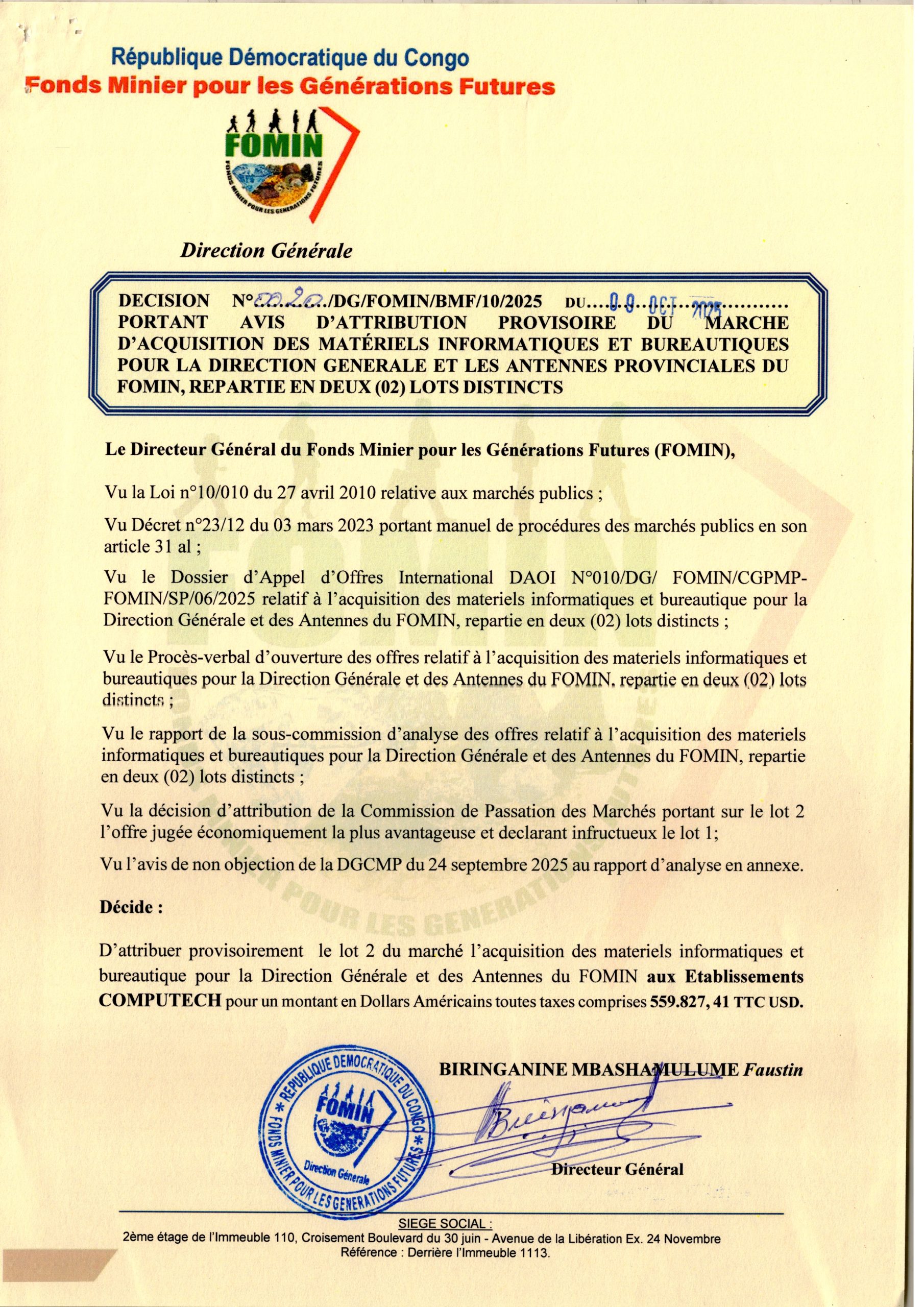 Attribution provisoire accordée aux Etablissements COMPUTECH relative à l’acquisition des matériels informatiques et bureautique pour la Direction Générale et des Antennes du FOMIN.