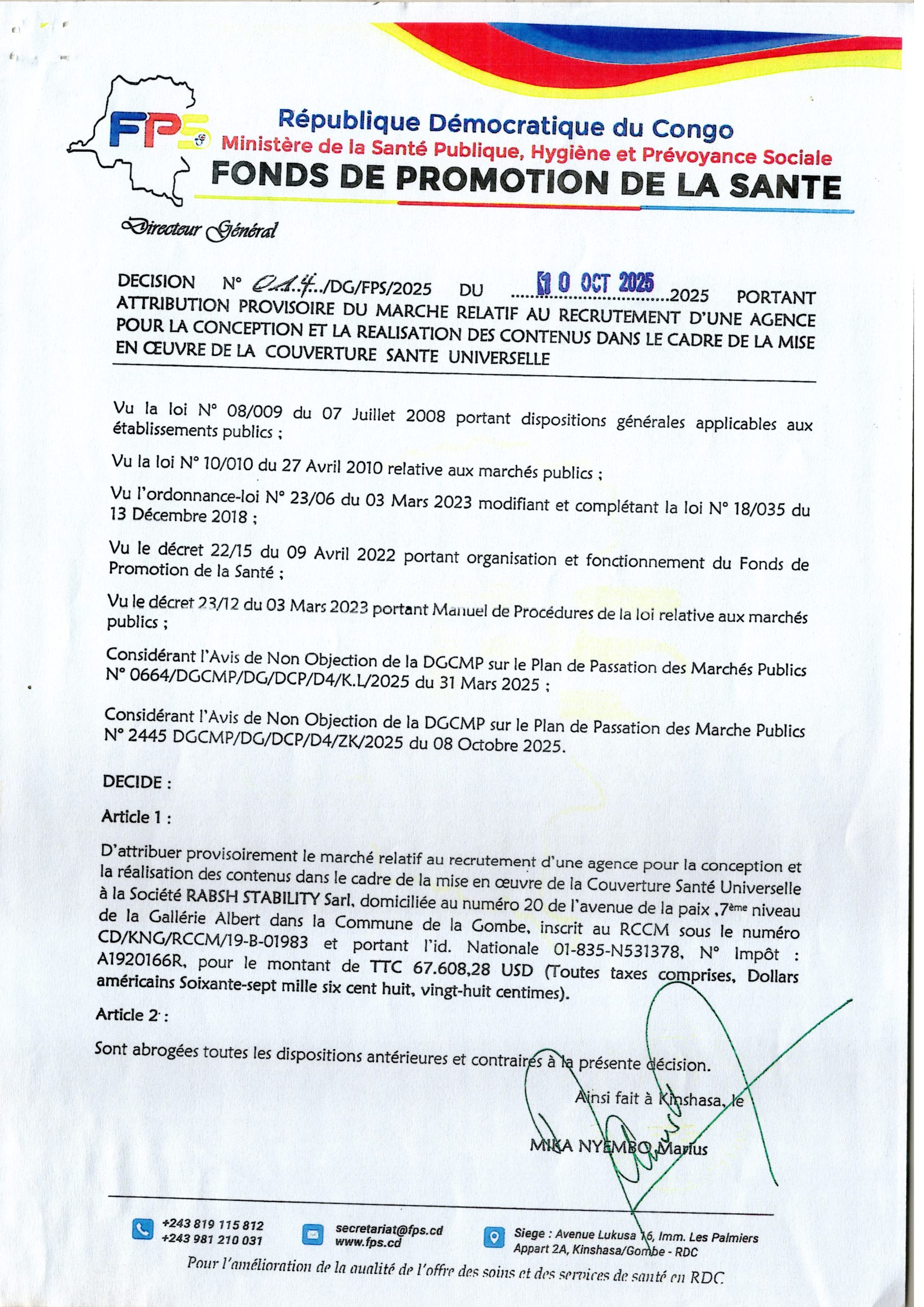 Attribution provisoire accordée à la société RABSH STABILITY relative au recrutement d’une Agence pour la Conception et la réalisation des contenus dans le cadre de la Mise en Oeuvre de la Couverture Santé Universelle.