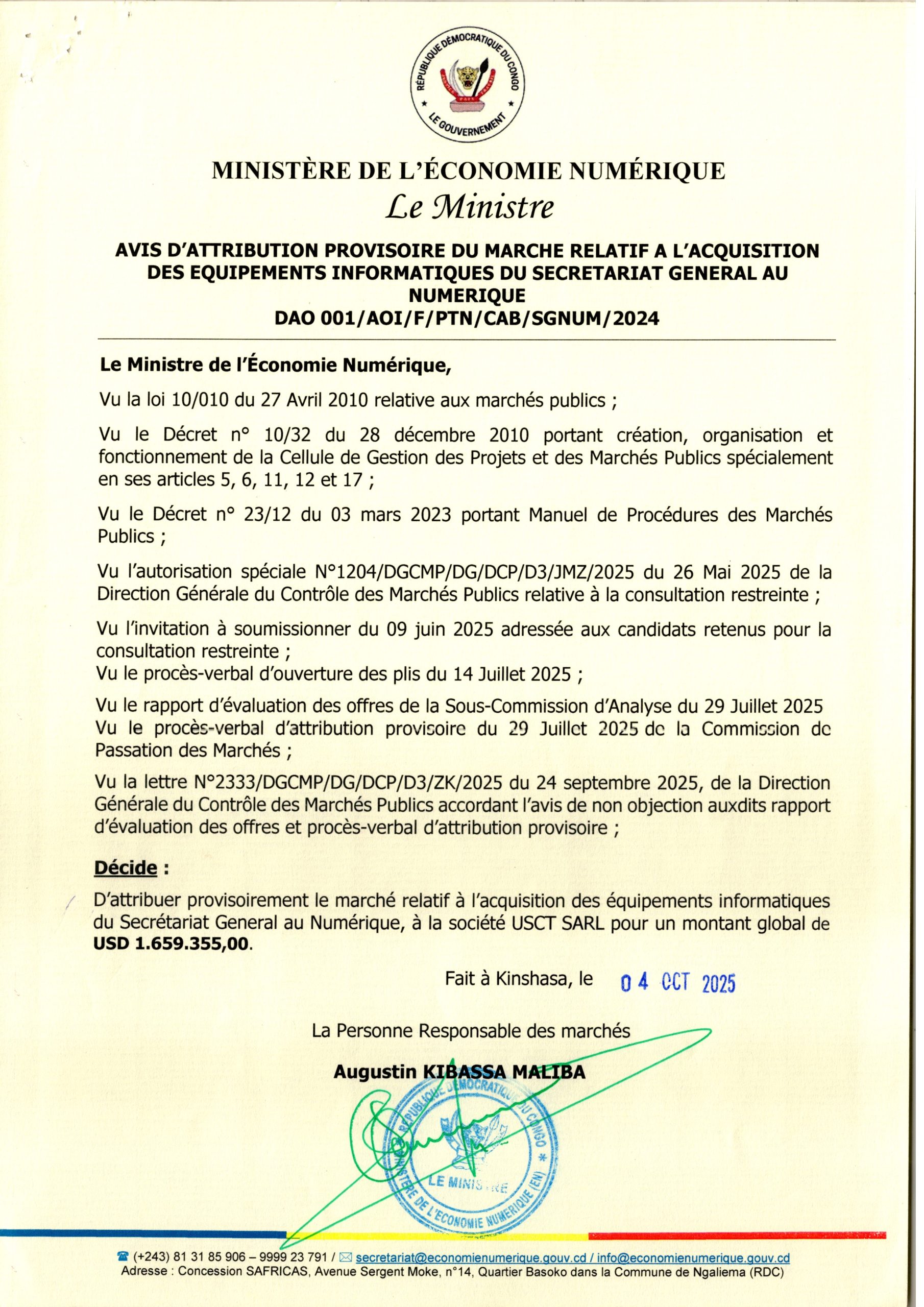 Attribution provisoire accordée à la société USCT SARL relative à l’acquisition des équipements informatiques du secrétariat général au Numérique.