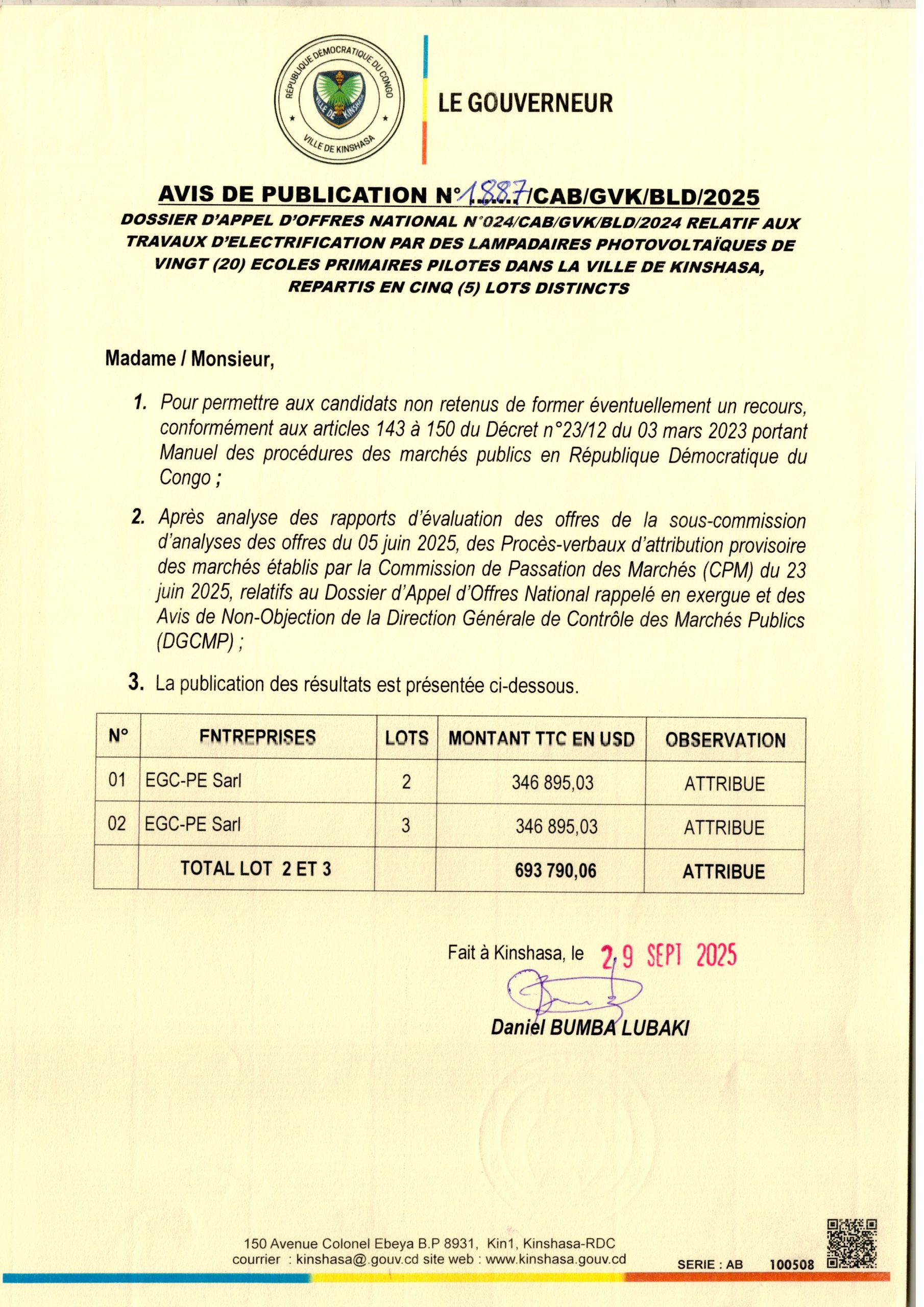 Attribution provisoire accordée à l’Entreprise EGC -PE Sarl relative aux travaux d’électrification par des lampadaires photovoltaïque de vingt (20) écoles primaires pilotes dans la ville de Kinshasa repartis en cinq (5) lots distincts.
