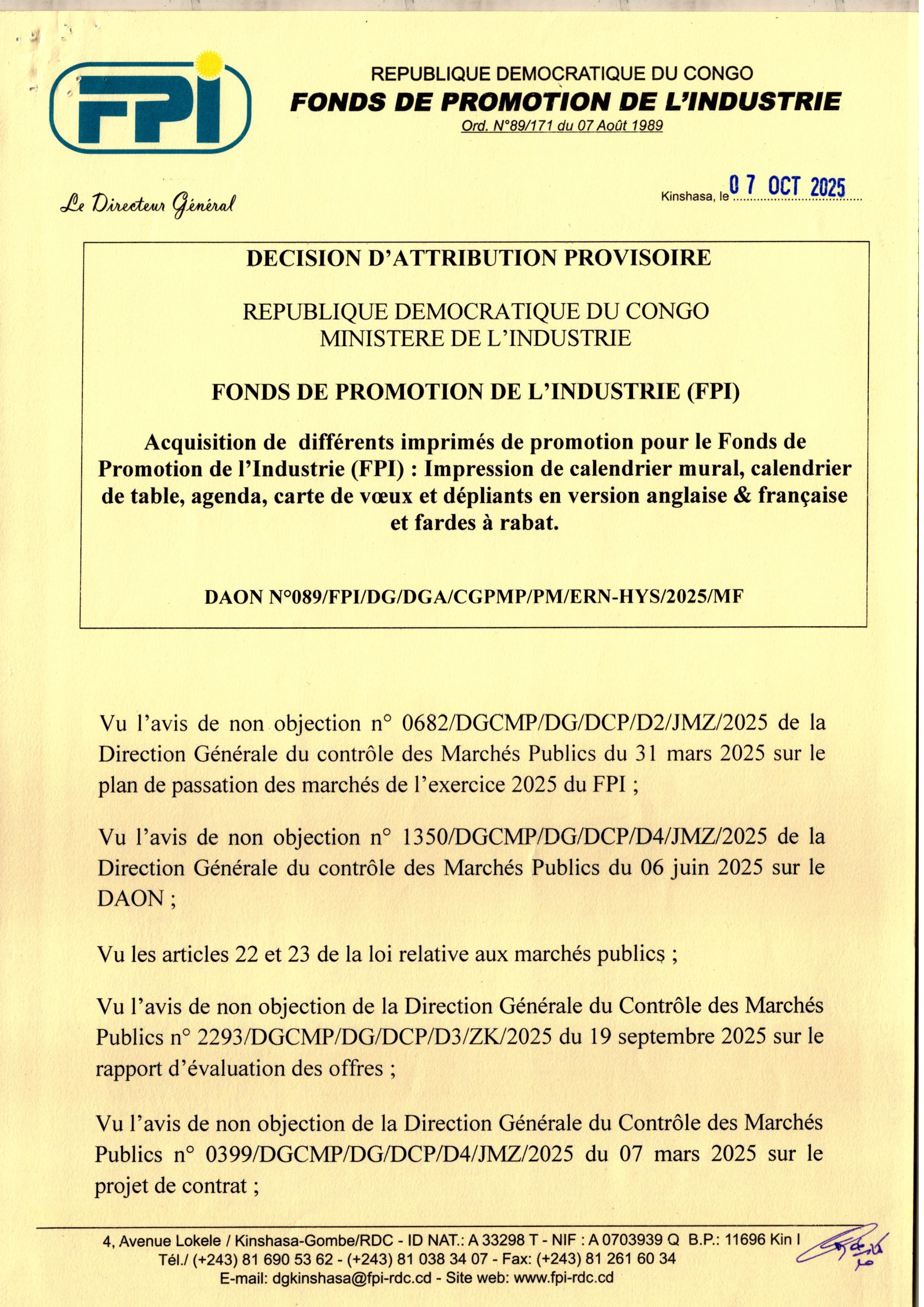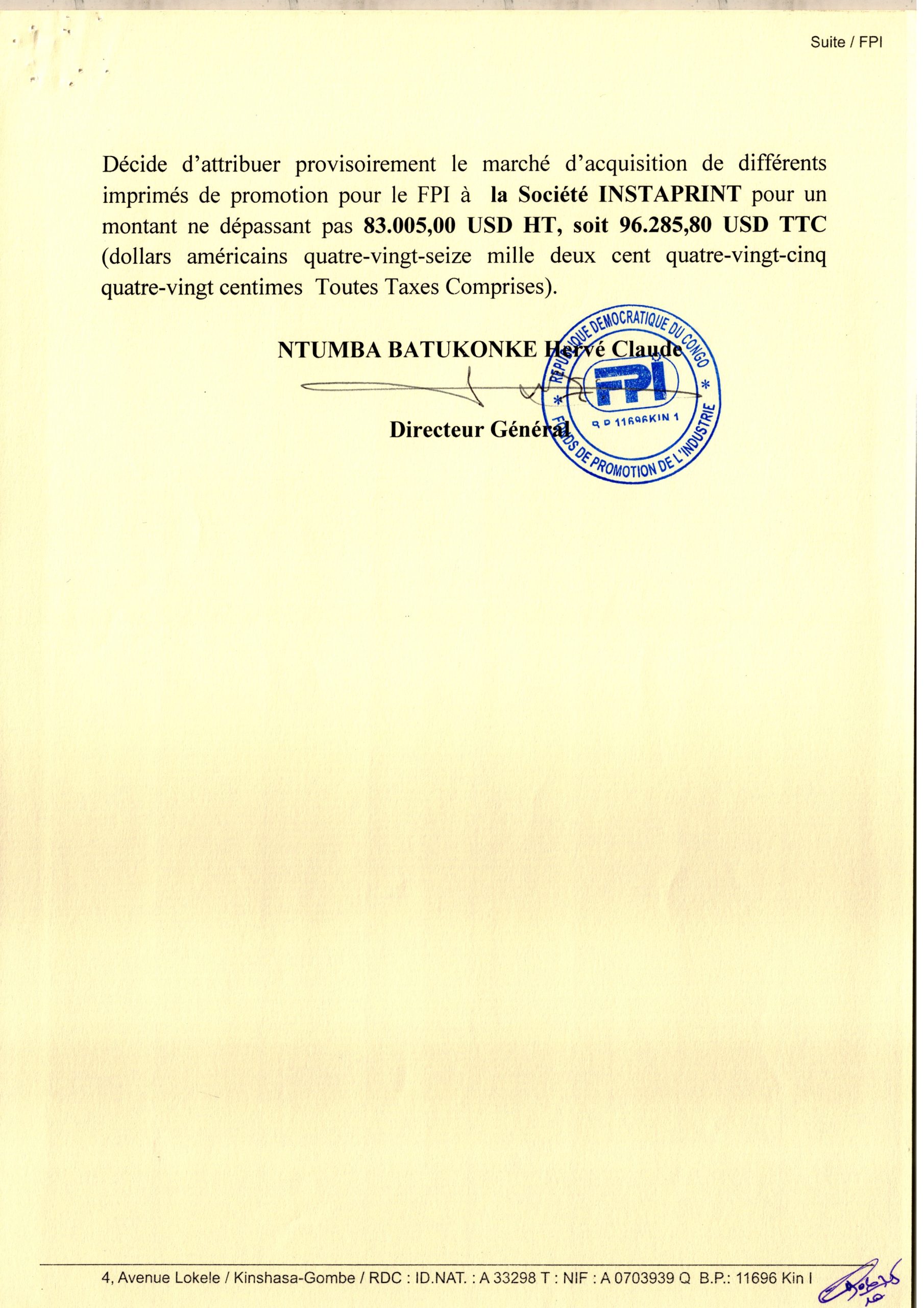 Attribution provisoire accordée à la société “INSTAPRINT” le marché relatif à l’acquisition des imprimés de promotion pour le Fonds de Promotion de l’Industrie (FPI) : Impression de calendrier mural, calendrier de table, agenda, carte de voeux et dépliants en version anglaise & française et fardes à rabat.