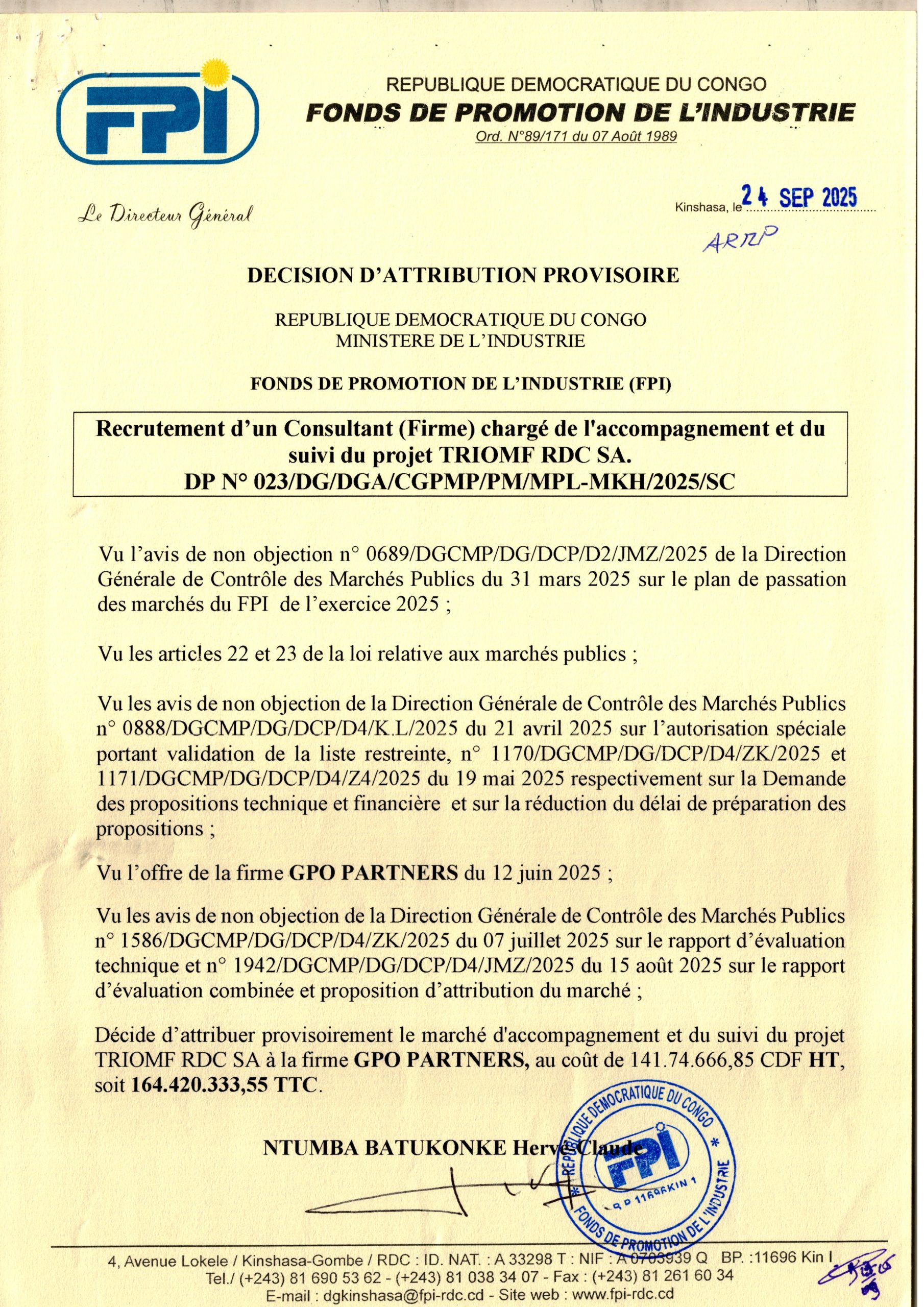 Attribution provisoire accordée à la firme “GPO PARTNERS” le marché relatif au recrutement d’un consultant (Firme) chargé de l’accompagnement du suivi du projet TRIOMF RDC SA.