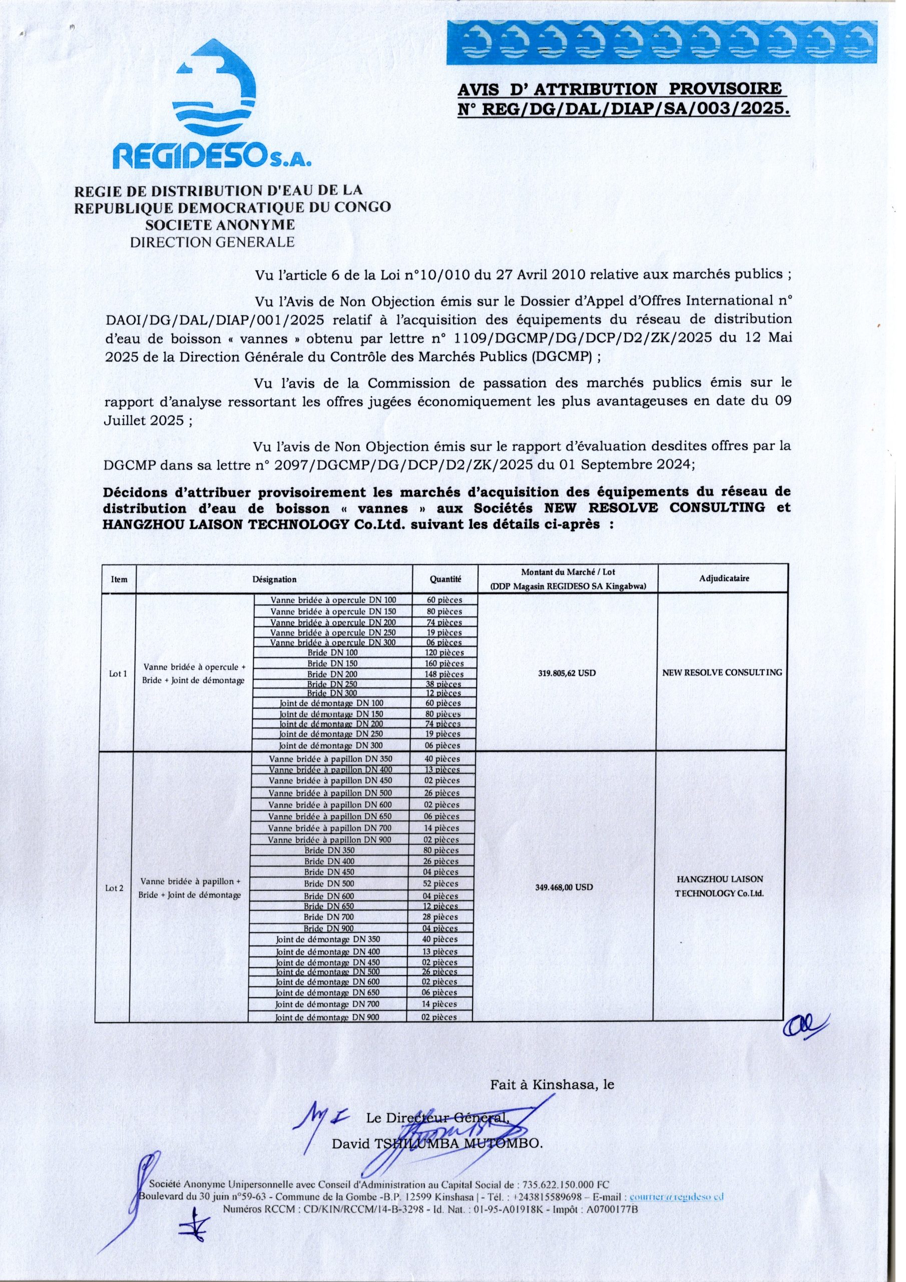 Attrribution provisoire accordée aux sociétés “NEW RESOLVE CONSULTING” et “HANGZHOU LAISON TECHNOLOGIE Co.Ltd” le marché relatif à l’acquisition des équipements du réseau de distribution d’eau de boisson “vannes”.