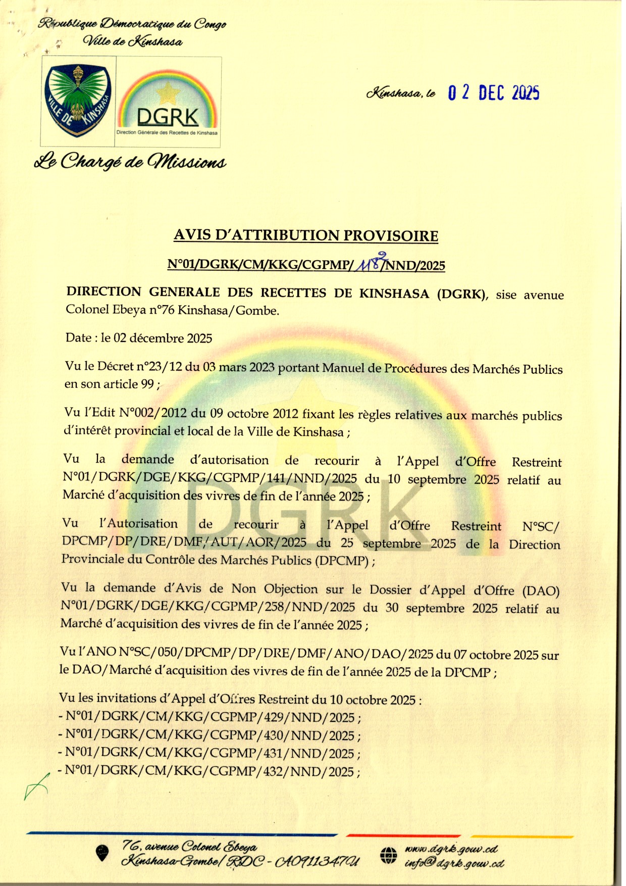 Attribution provisoire du marché relatif à l’acquisition de vivres de fin d’année 2025 à l’entreprise SOCIMEX SARL.