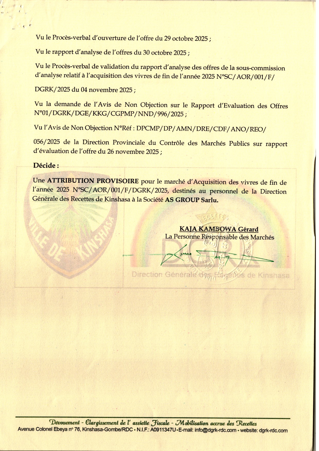 Attribution Provisoire pour le marché d’acquisition des vivres de fin de l’année 2025 de la DPCMP à la société AS GROUP Sarlu
