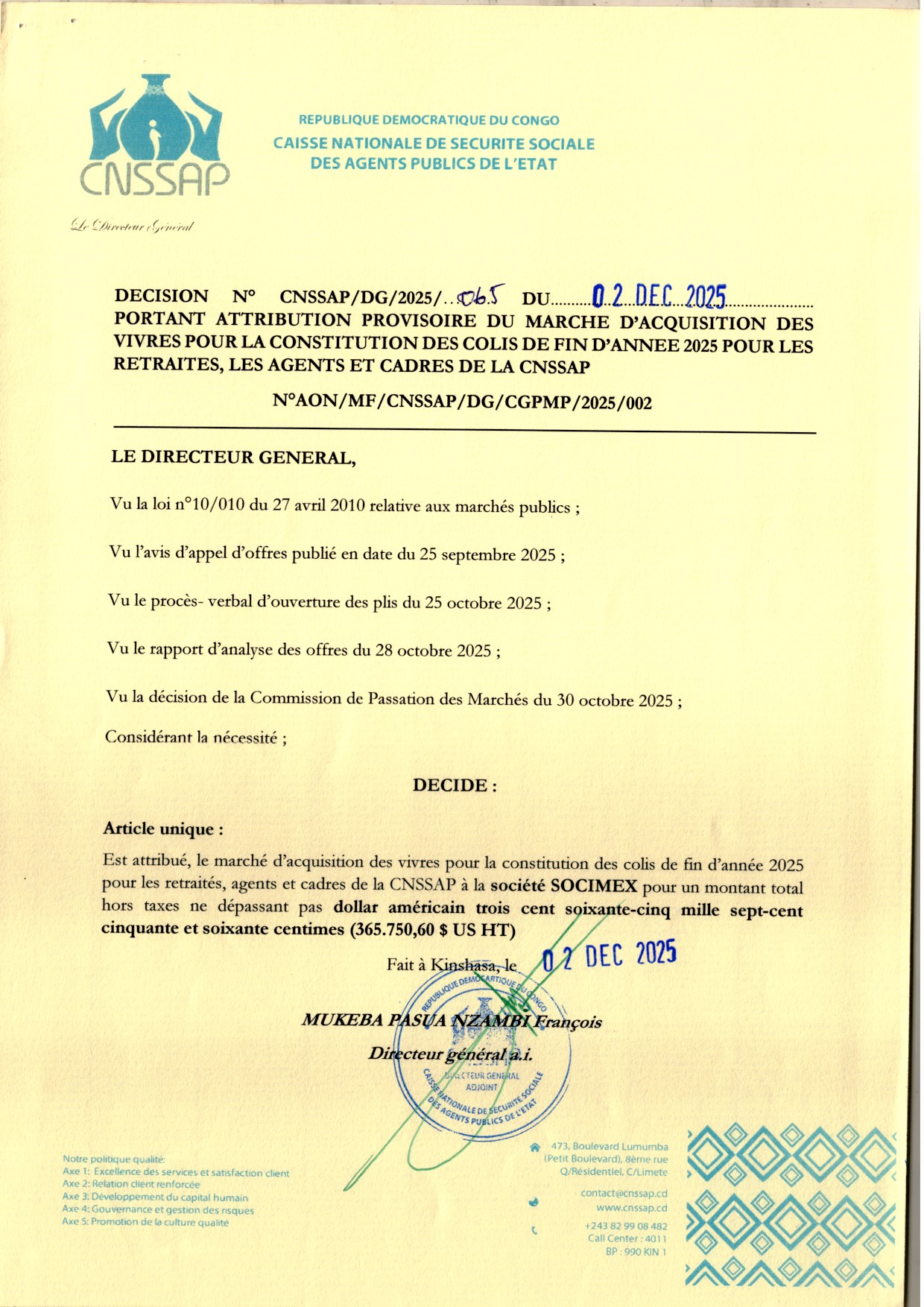 Attribution Provisoire du marché d’acquisition des vivres pour la Constitution des colis de fin d’Année 2025 pour les retraites, les Agents et Cadres de la CNSSAP à la société SOCIMEX