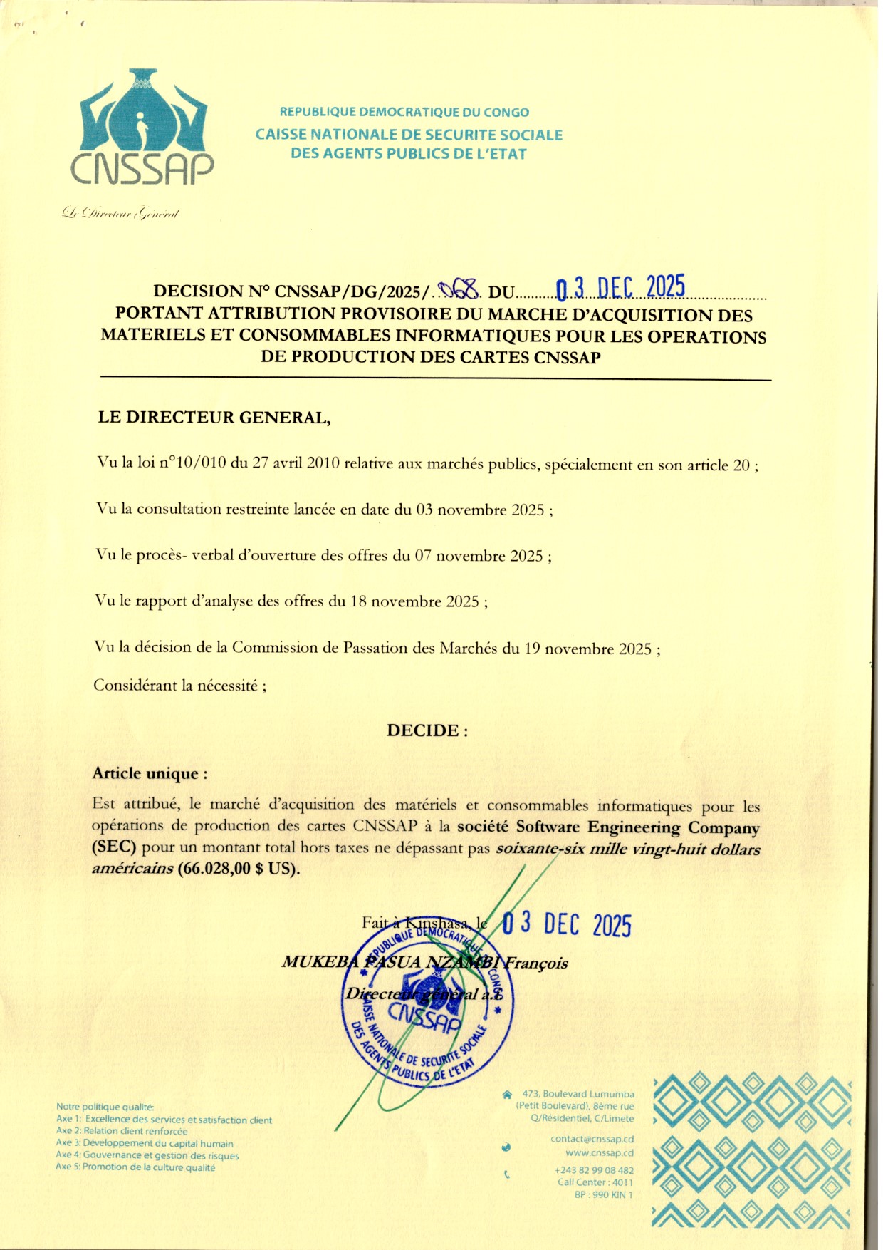 Attribution Provisoire du marché d’acquisition des matériels et consommables informatiques pour les opérations de production des cadres CNSSAP 0 LA SOCI2T2 Software Engineering Company (SEC)