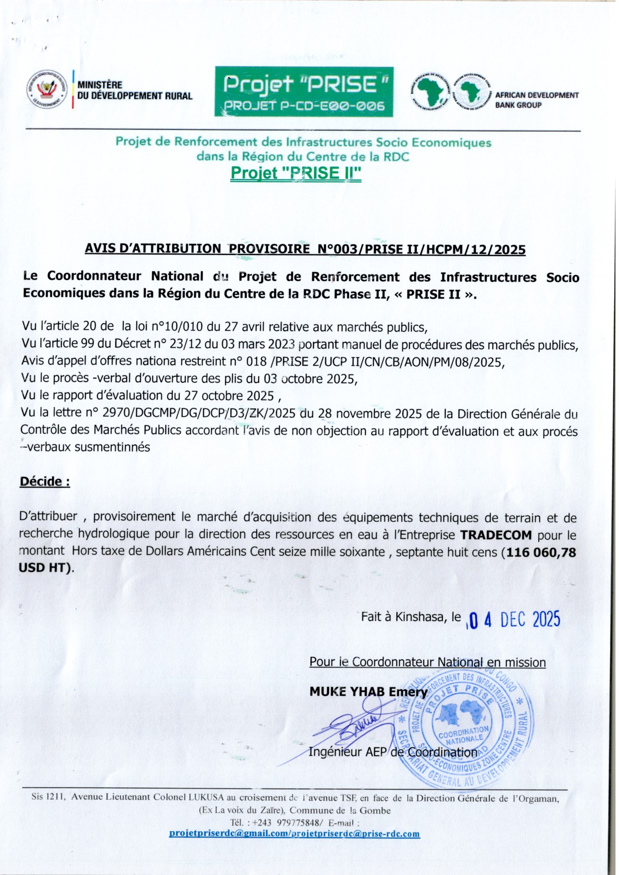 Attribution provisoire accordée à “l’Entreprise TRADECOM” relative au marché d’acquisition des équipements techniques de terrain et de recherche hydrologique pour la Direction des Ressources en Eau.