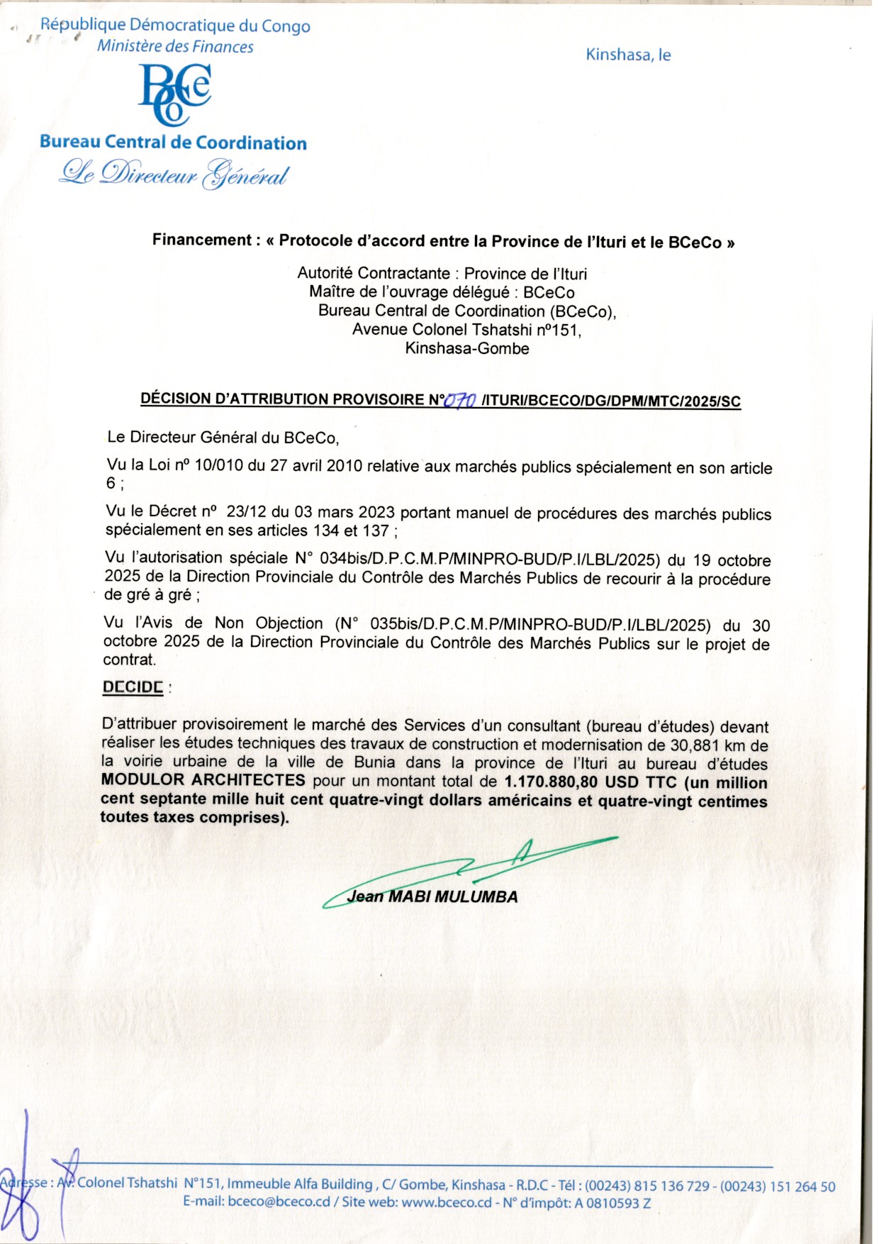 Attribution provisoire accordée au bureau d’études “MODULOR ARCHITECTES” relative au marché des services d’un consultant devant réaliser les études techniques des travaux de construction et modernisation de 30,881 km de la voirie urbaine de la ville de Bunia dans la province de l’Ituri.