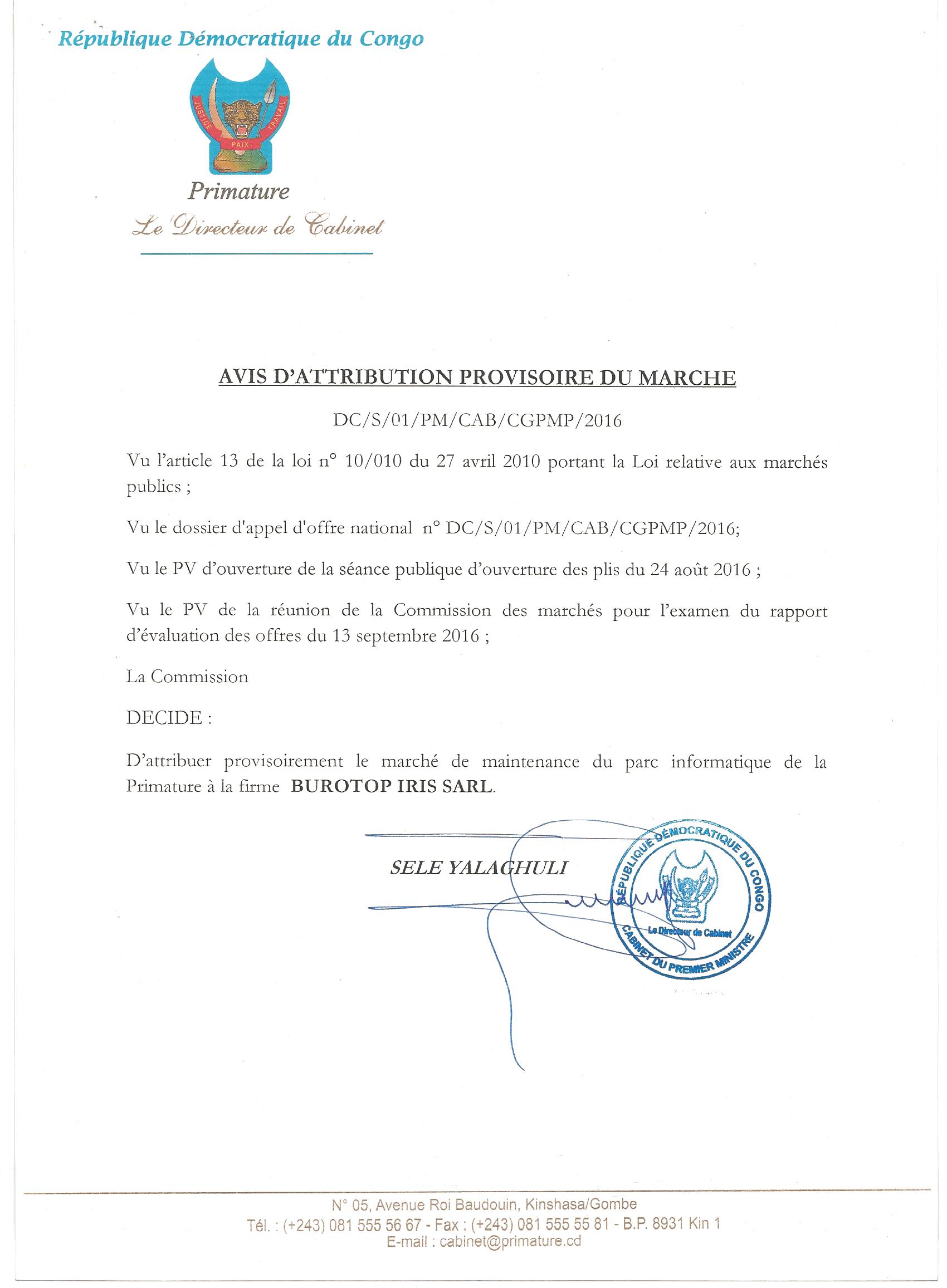 Marché de maintenance du parc informatique de la primature à la firme BUROTOP IRIS SARL