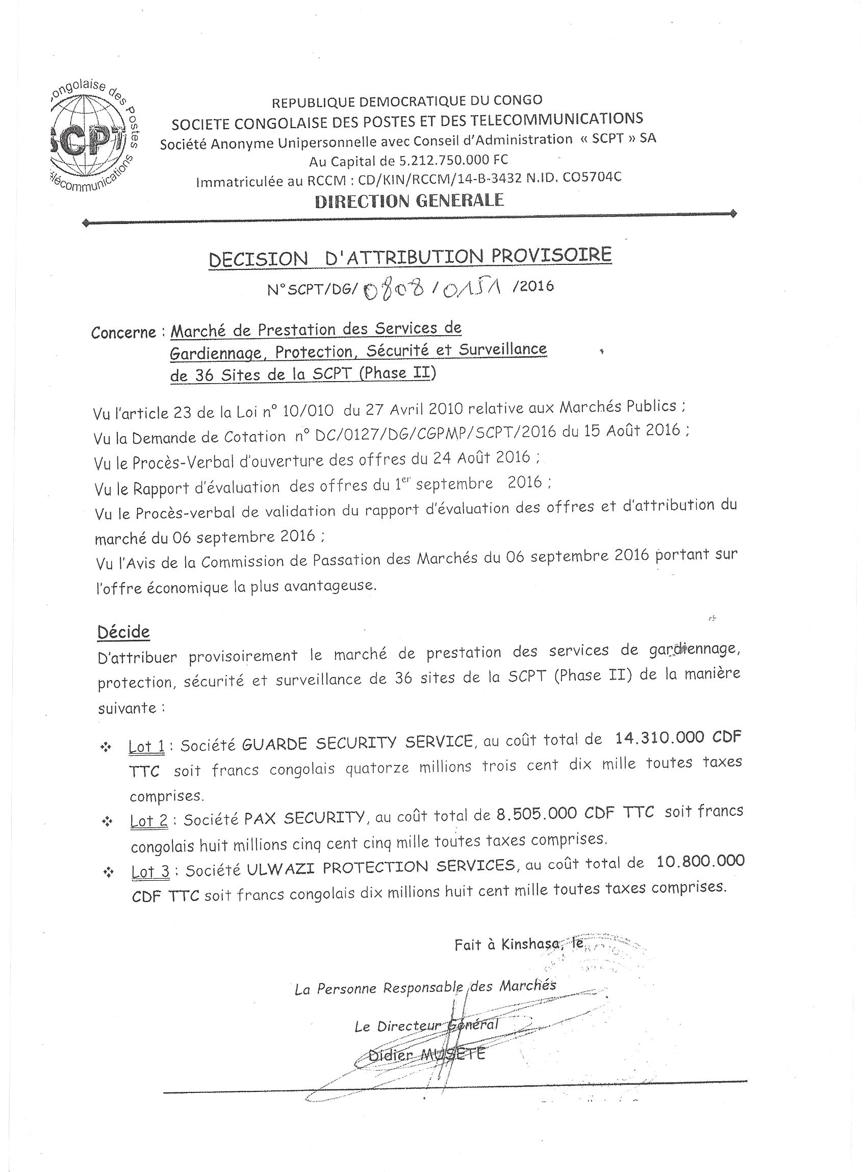 Marché de prestation des services de gardiennage, protection, sécurité et surveillance de 36 sites de la scpt (phase ii)