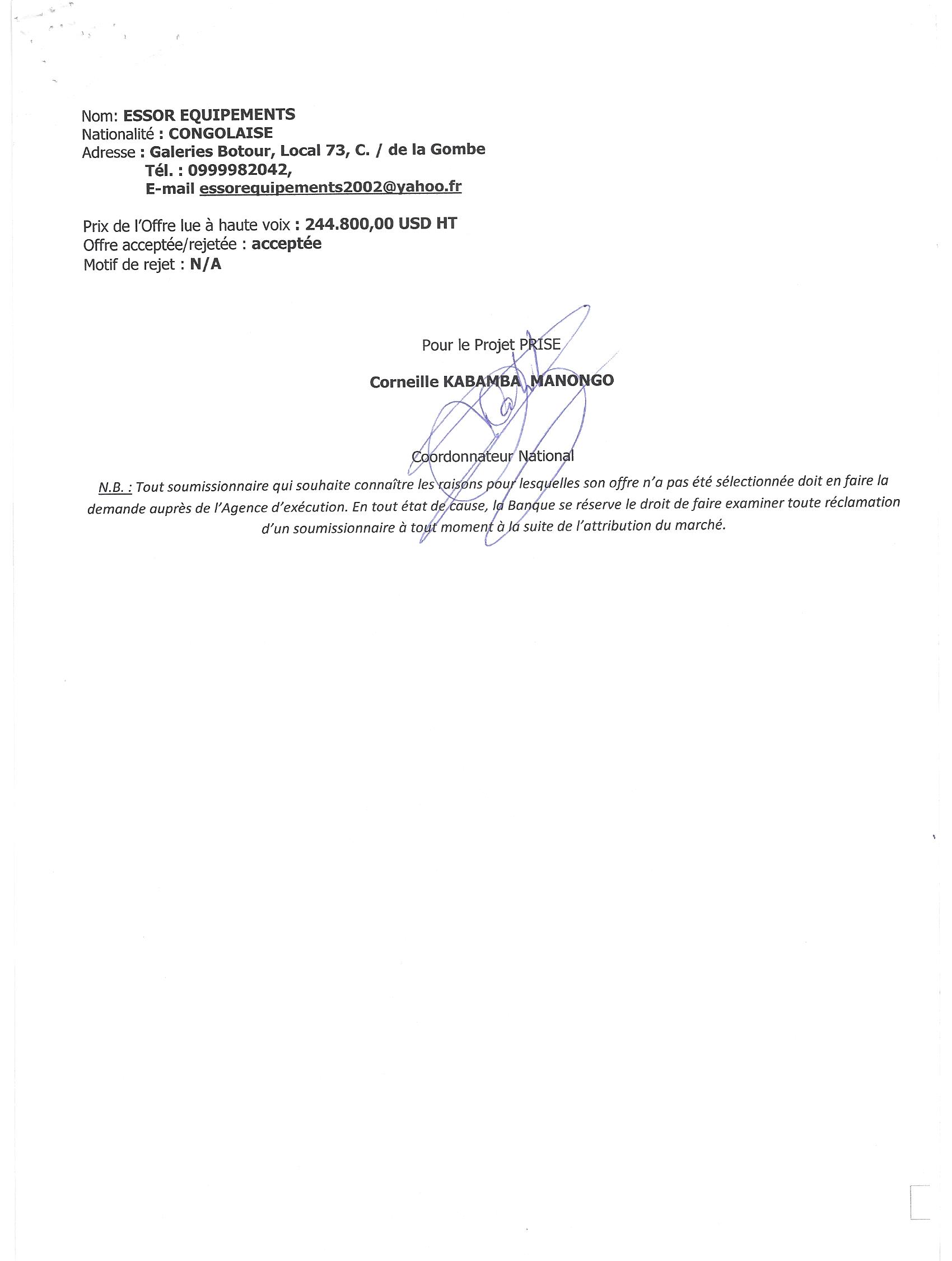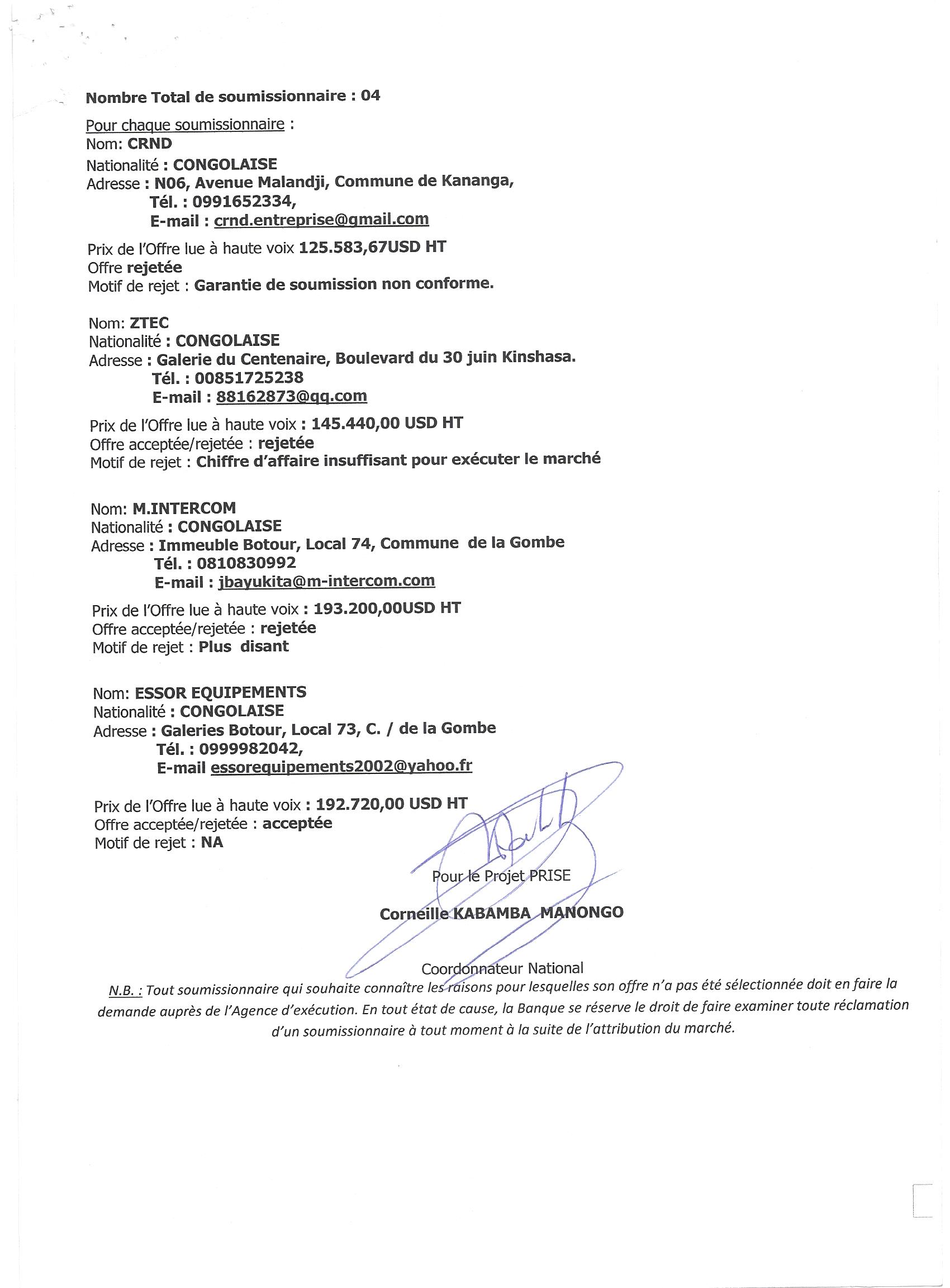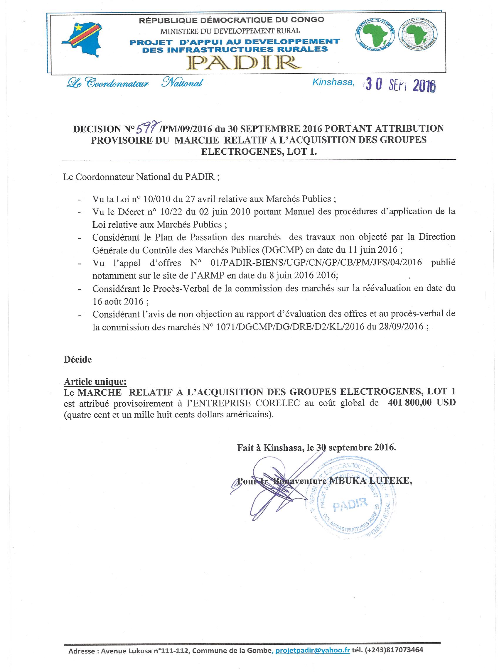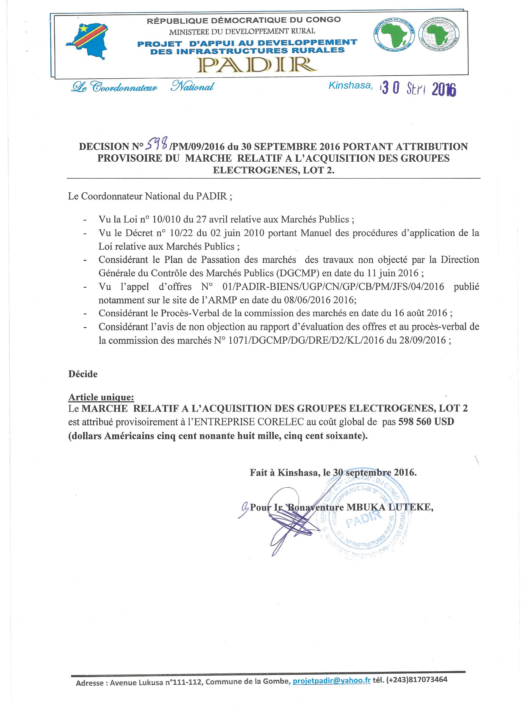 Attribution provisoire du marché relatif à l’acquisition des groupes électrogènes, lot 2 à L’ENTREPRISE CORELEC