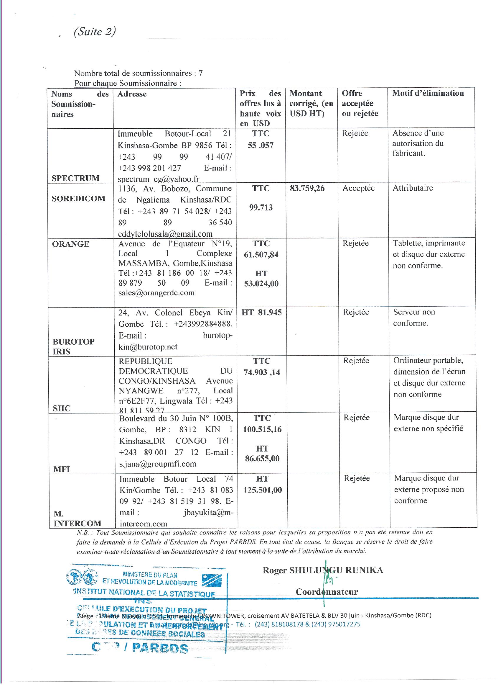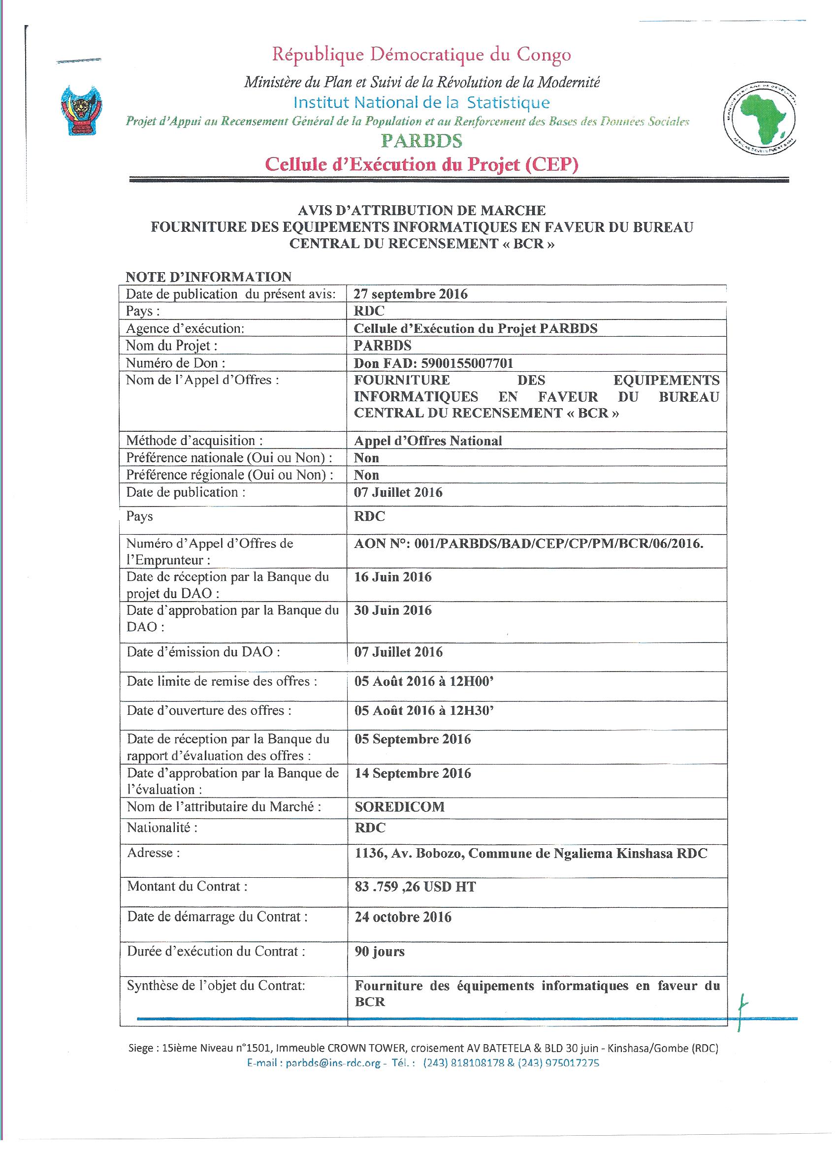 Avis d’attribution de marche fourniture des équipements informatiques en faveur du bureau central du recensement