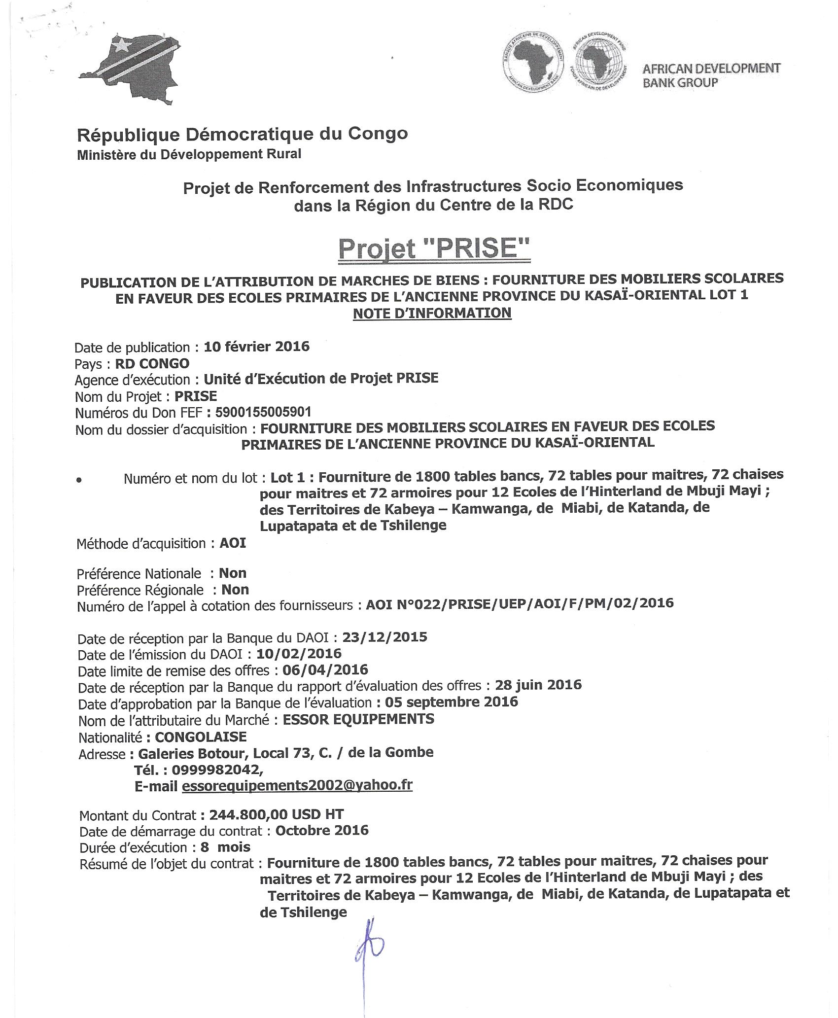Attribution de marché de fourniture des mobiliers scolaires en faveur des écoles primaires de l’ancienne province du Kasaï-Oriental LOT 3